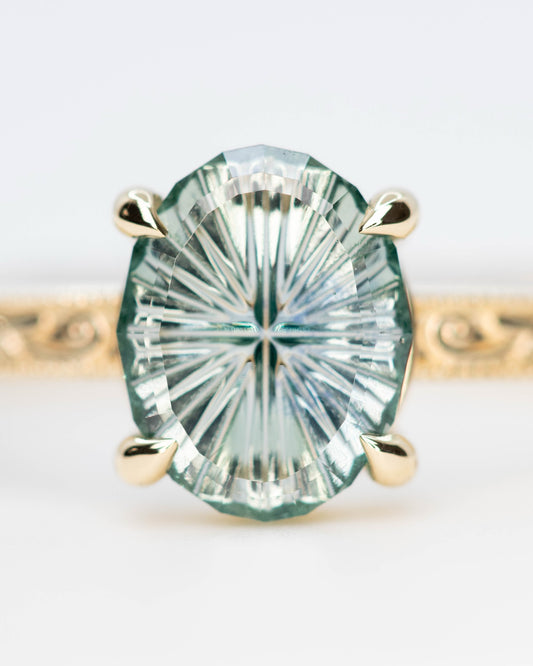 McKenzie Ring with a 2.18 Carat Green Oval Sapphire and White Accent Diamonds in 14k Yellow Gold - Ready to Size and Ship