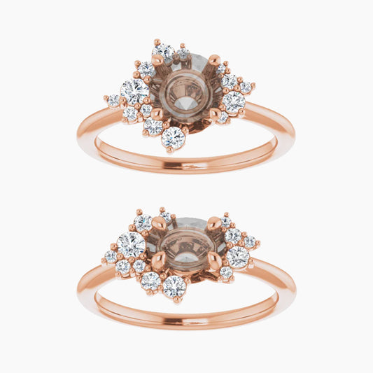 • A beautifully asymmetric cluster of stones form a partial halo around the center stone.