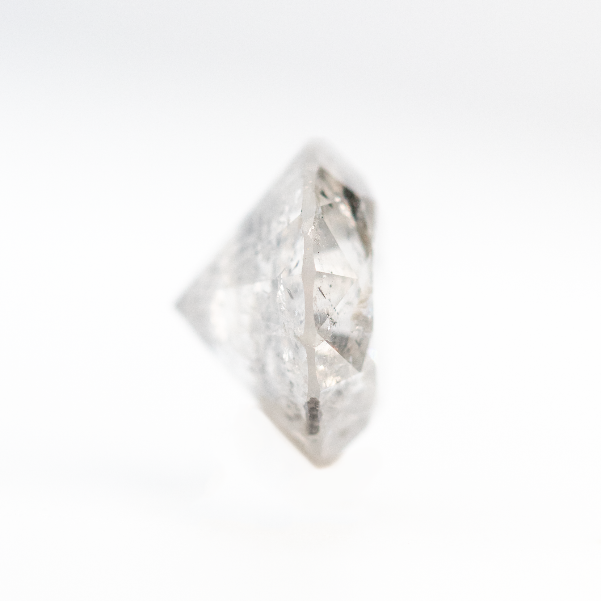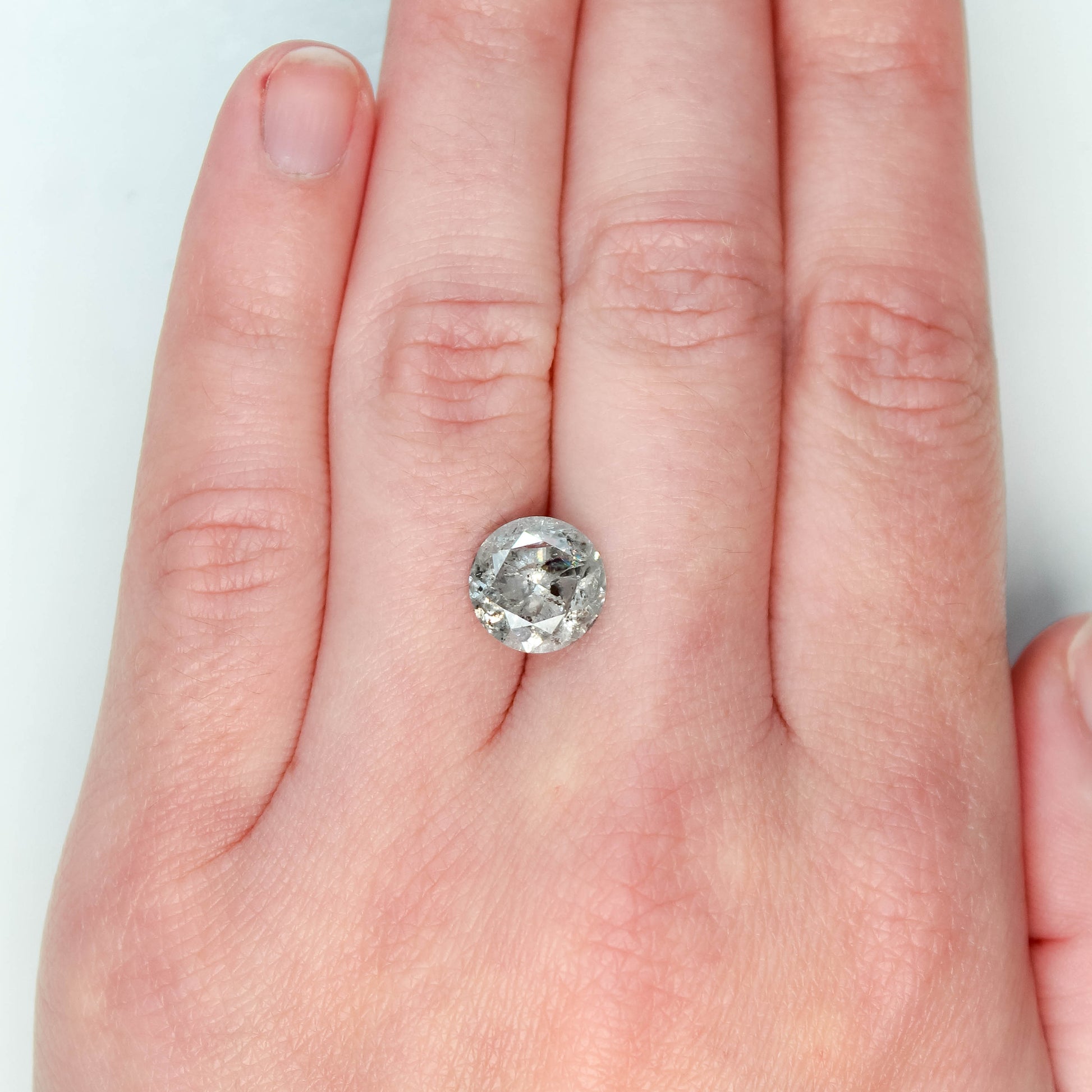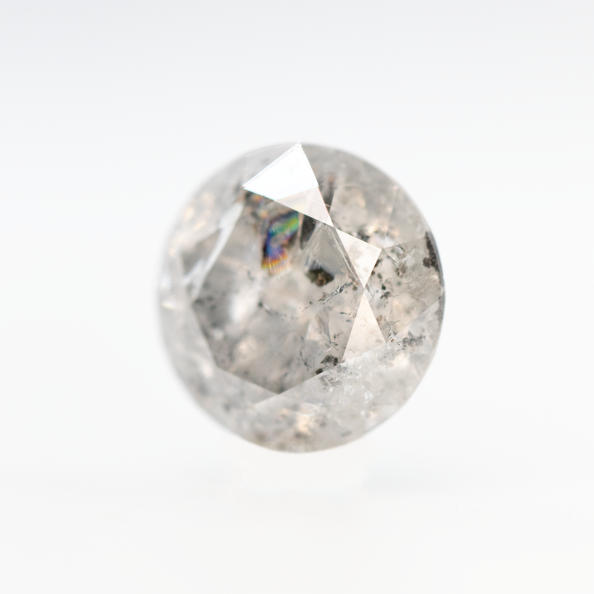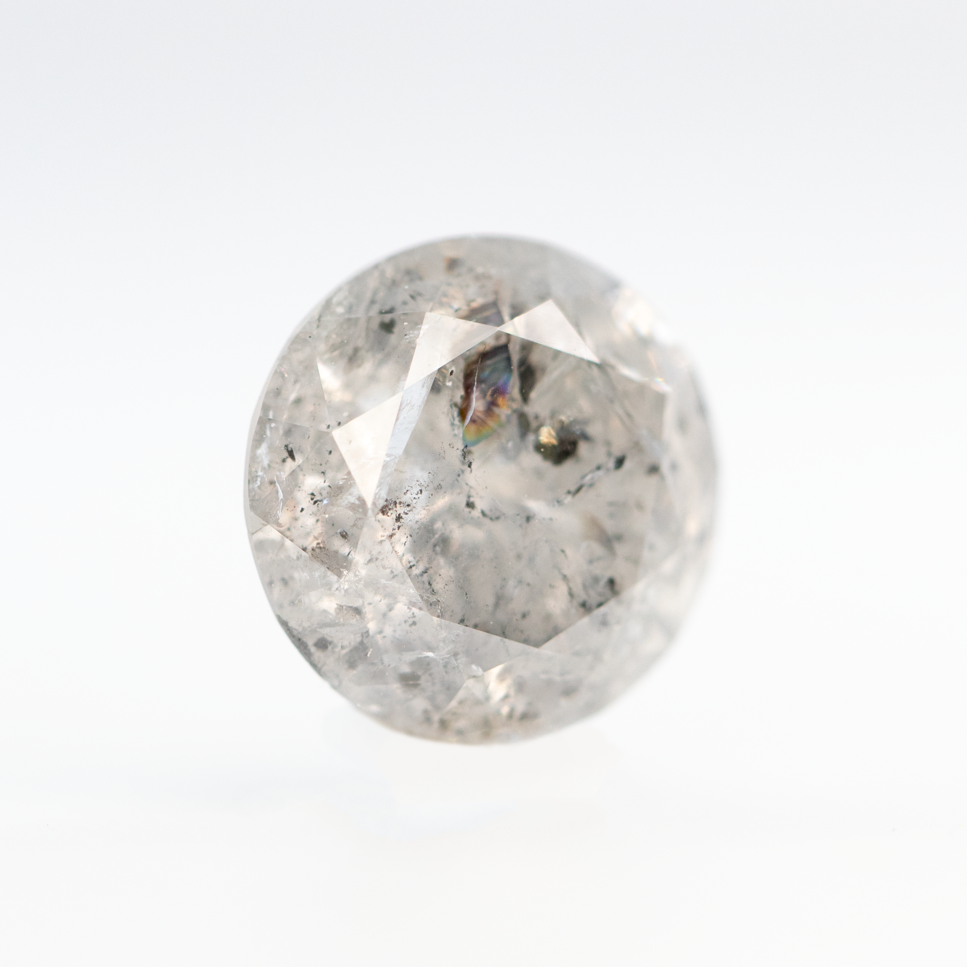 - Color and notes: Medium gray diamond with some unique black speckle inclusions throughout as well as an iridescent peacock feather inclusion located in the corner of the stone. Semi-translucent areas allow for light to shine through and give it a bright shimmer.