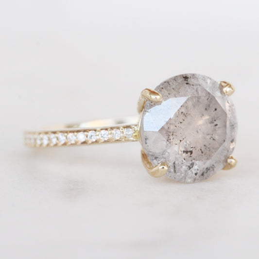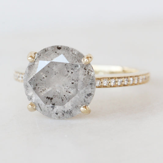 Imogene Ring with a 4.01 Carat Round Gray Salt and Pepper Diamond and White Accent Diamonds in 14k Yellow Gold - Ready to Size and Ship