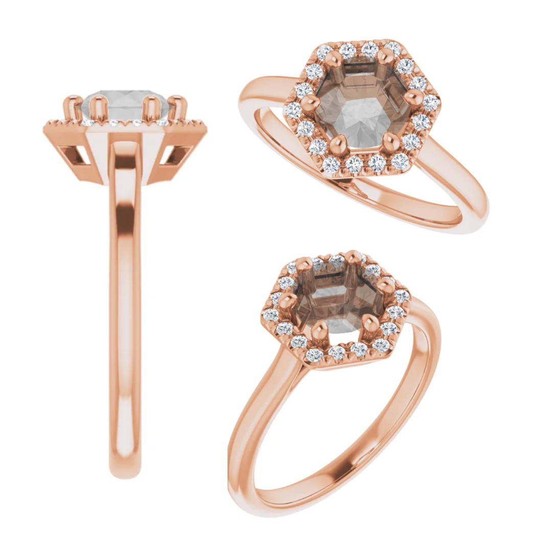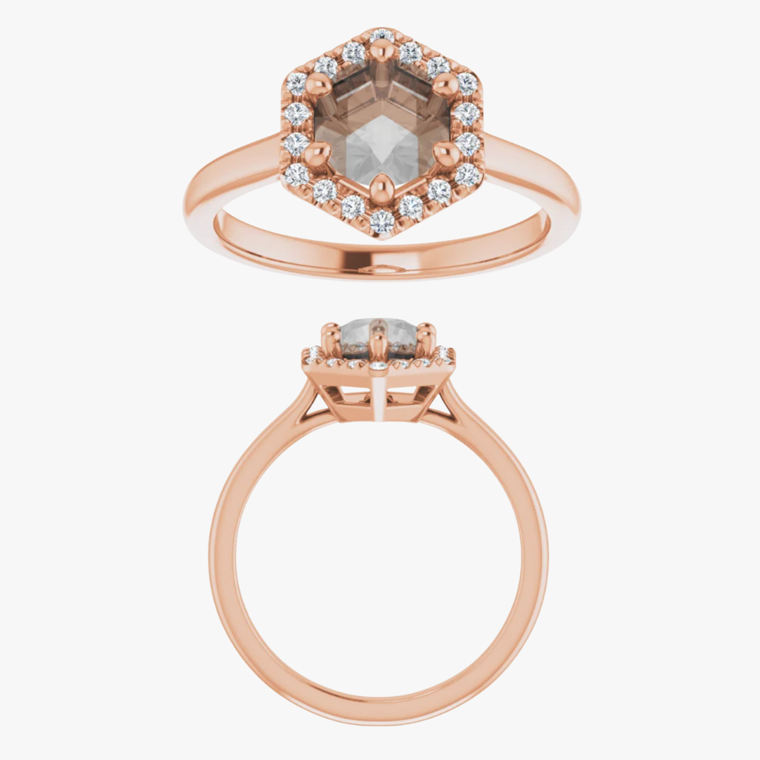 - Accent stones include a halo of 1mm accent stones surrounding the center stone.