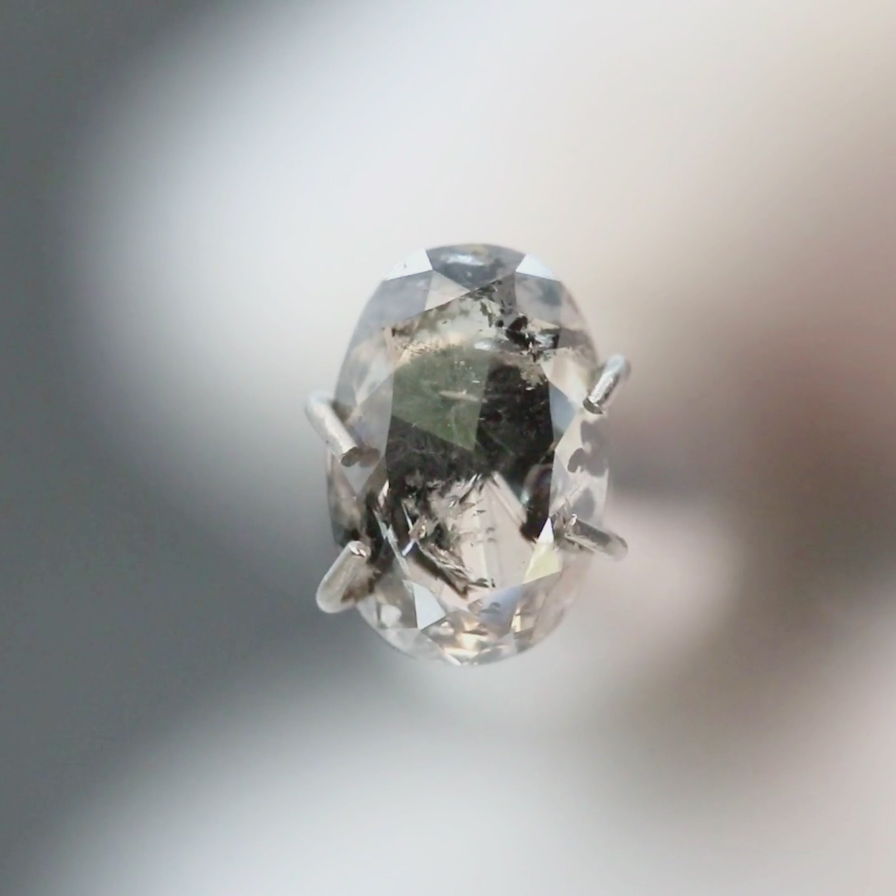 • Color and notes: Dazzling clear celestial diamond with unique black speckles that resemble ink spots. High clarity that shimmers in the light. Rose cut side up in first photo, brilliant side up featured in the second, fourth, fifth, and sixth photos.