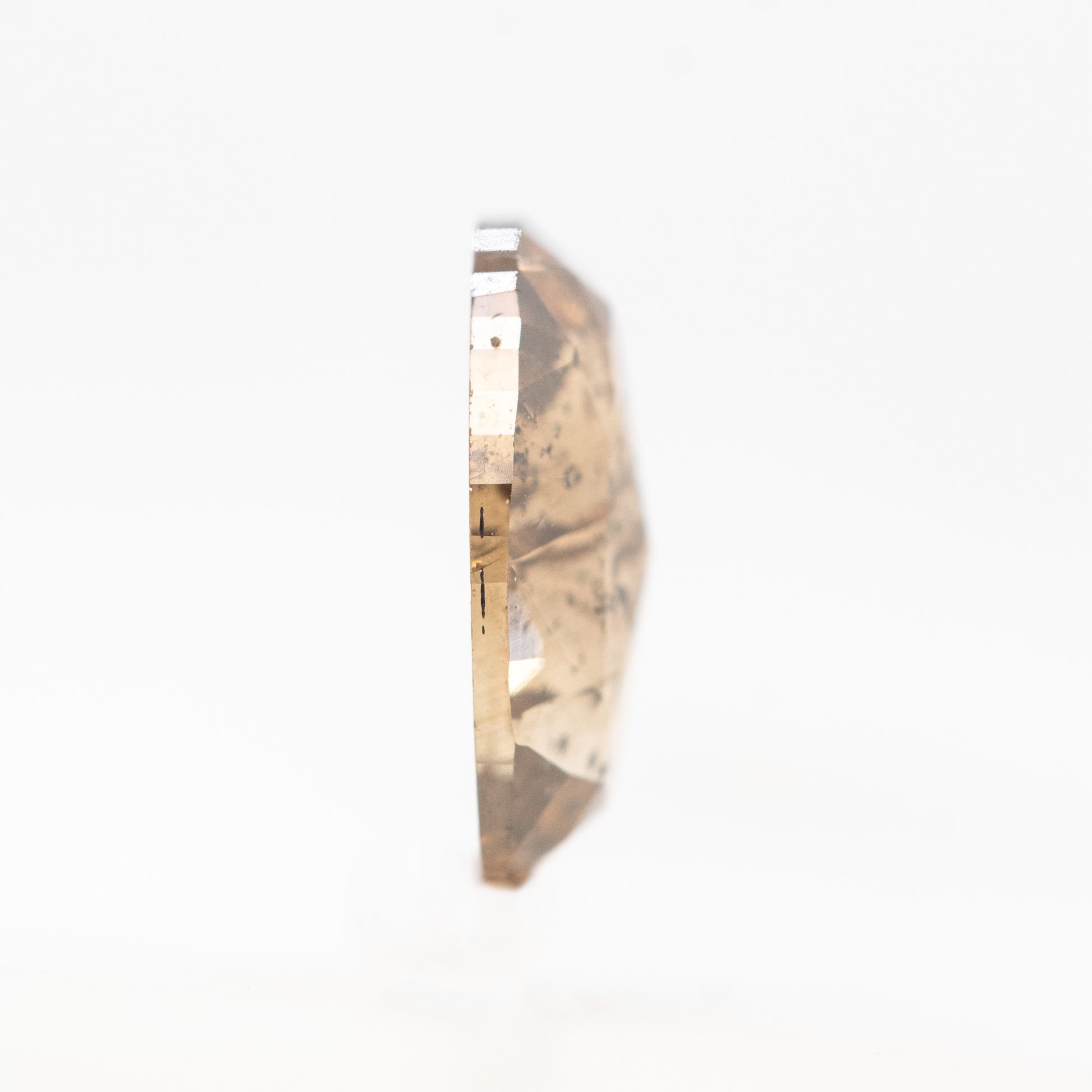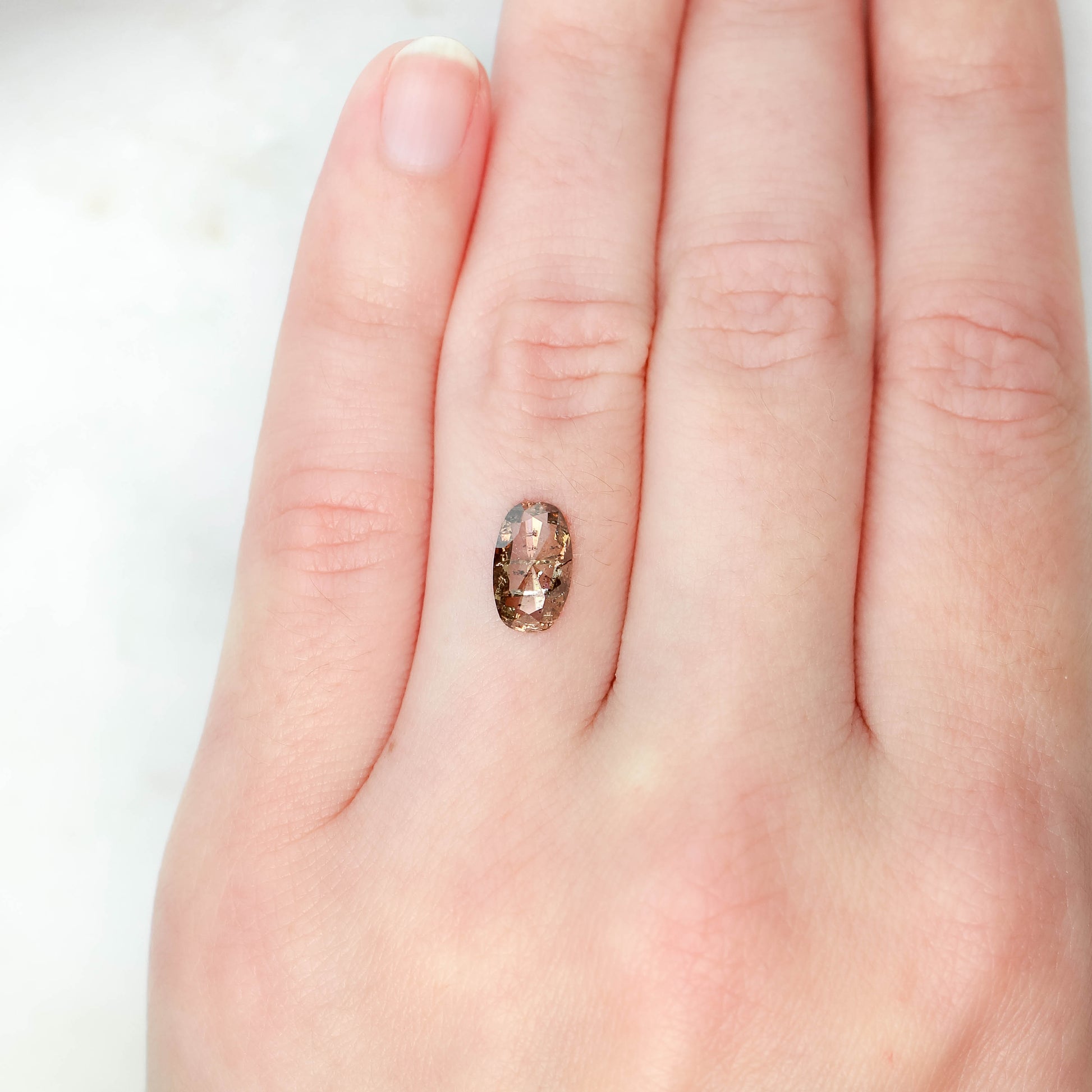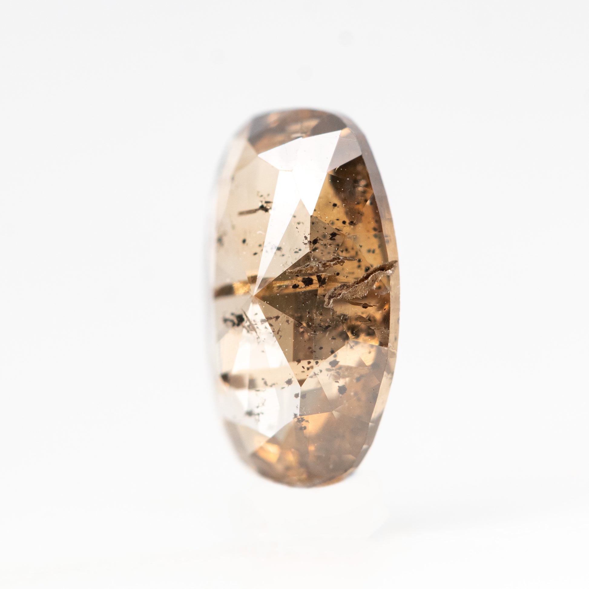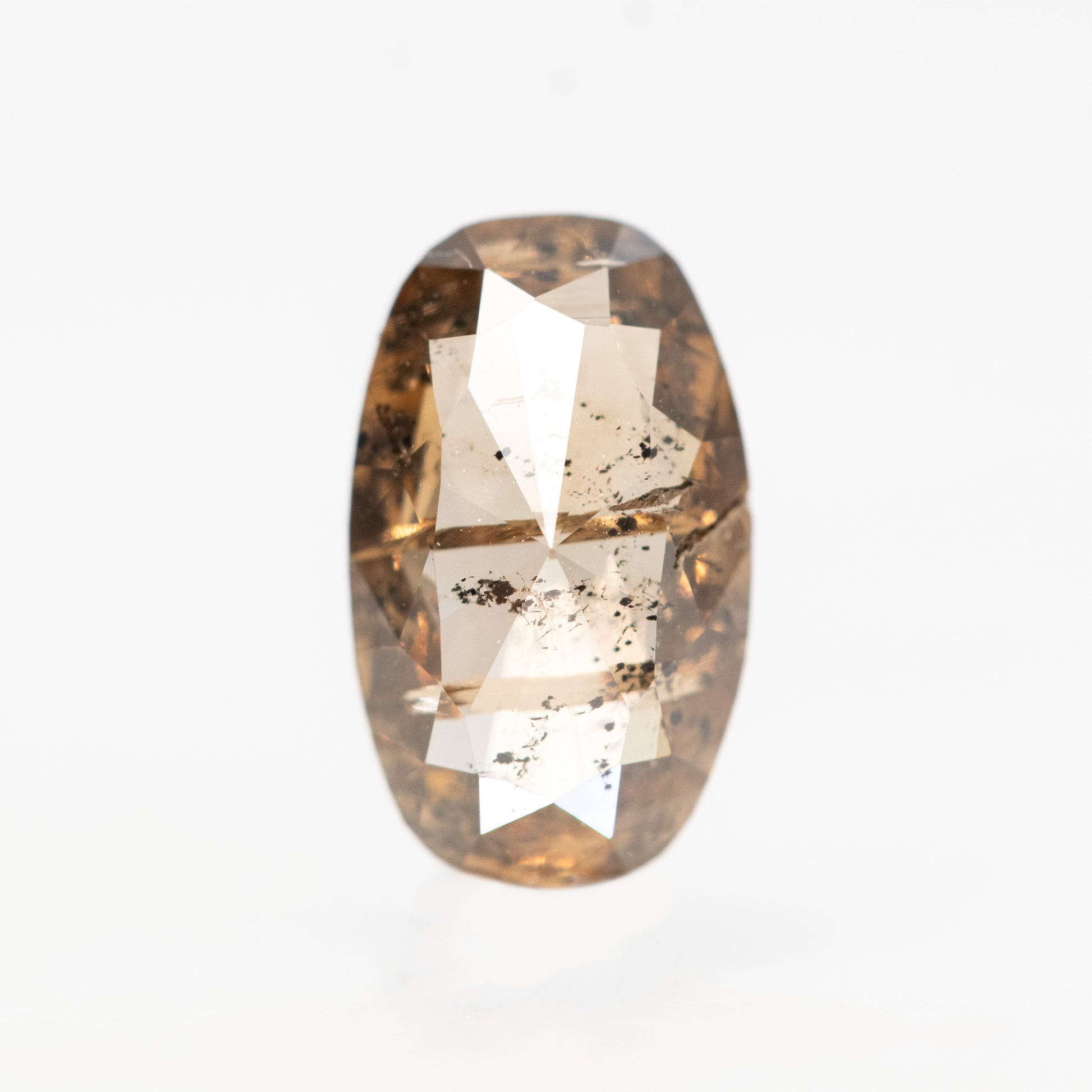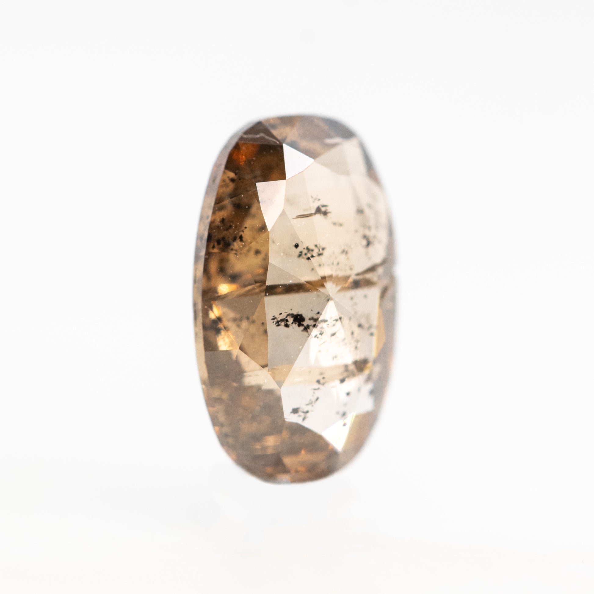 - Color and notes: This stone has a lovely clarity, and peppery black inclusions are clearly visible throughout. The warm, champagne brown tones bring an earthy feel to this diamond.
