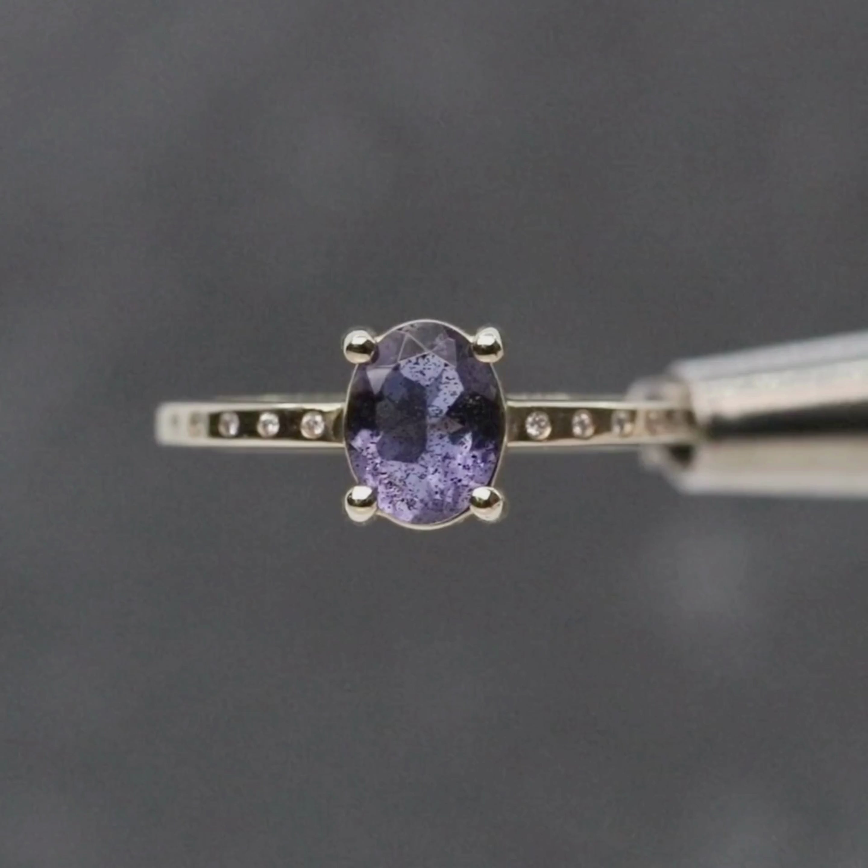 Heath Ring with a 0.74 Carat Oval Iolite and White Accent Diamonds in 14k Yellow Gold - Ready to Size and Ship