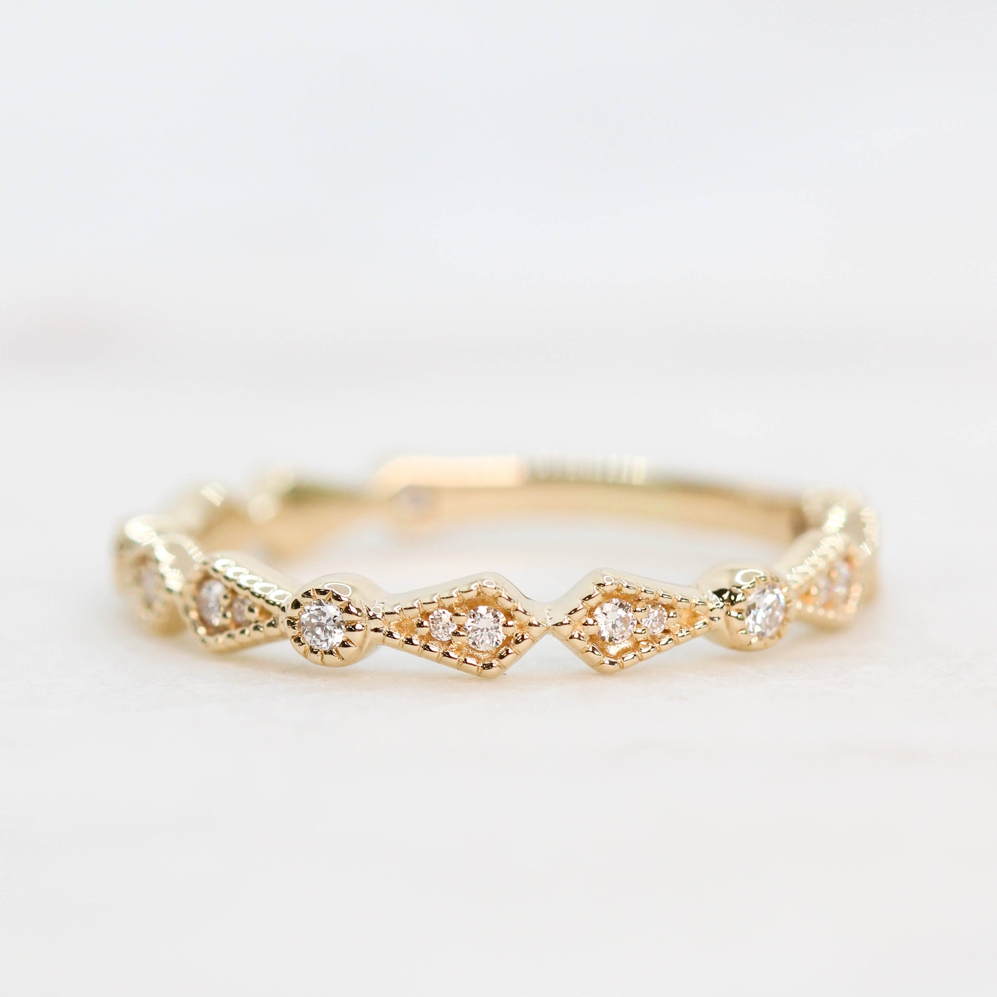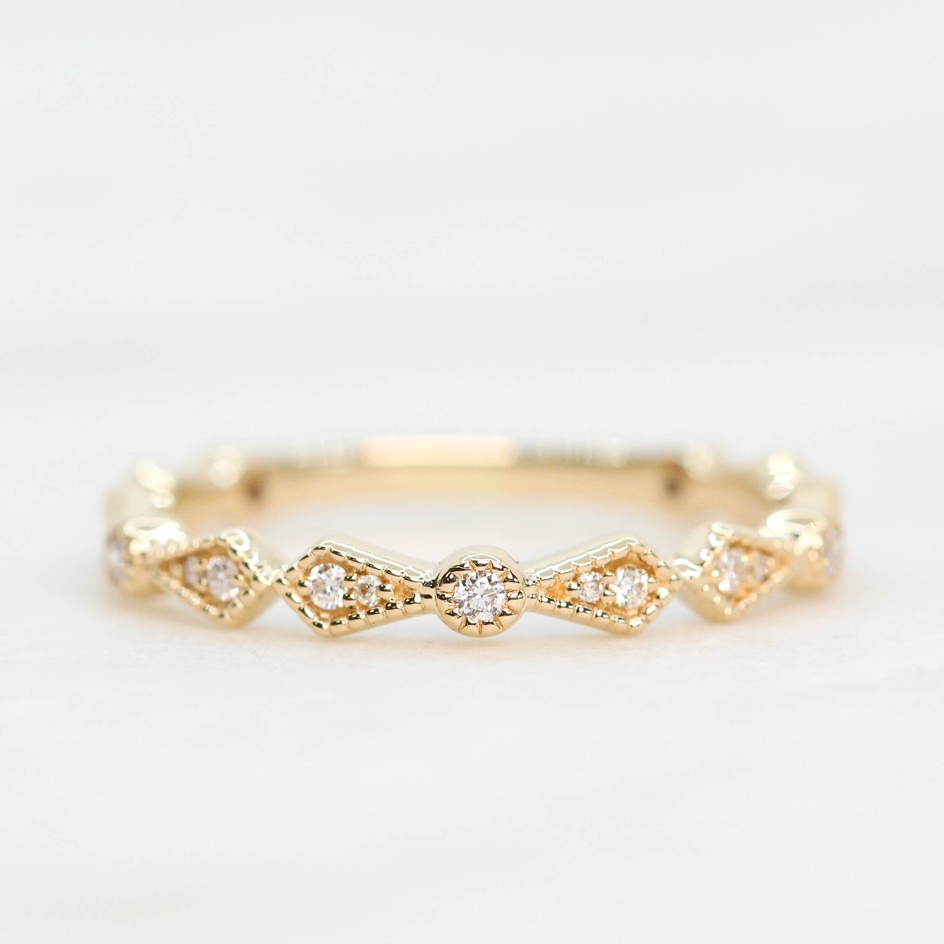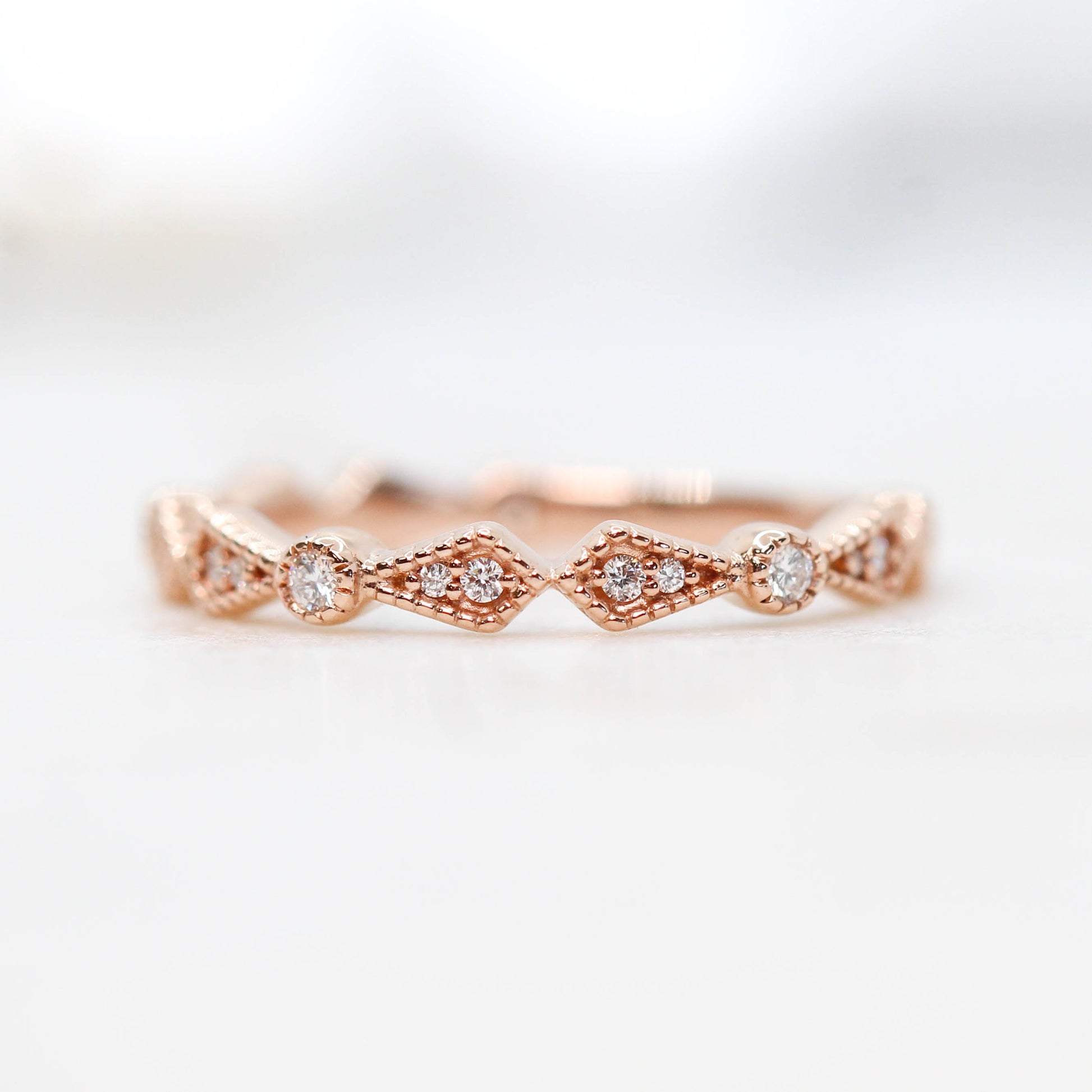 • This band is a unique geometric piece with an art deco style, complete with round diamonds and metal work details.