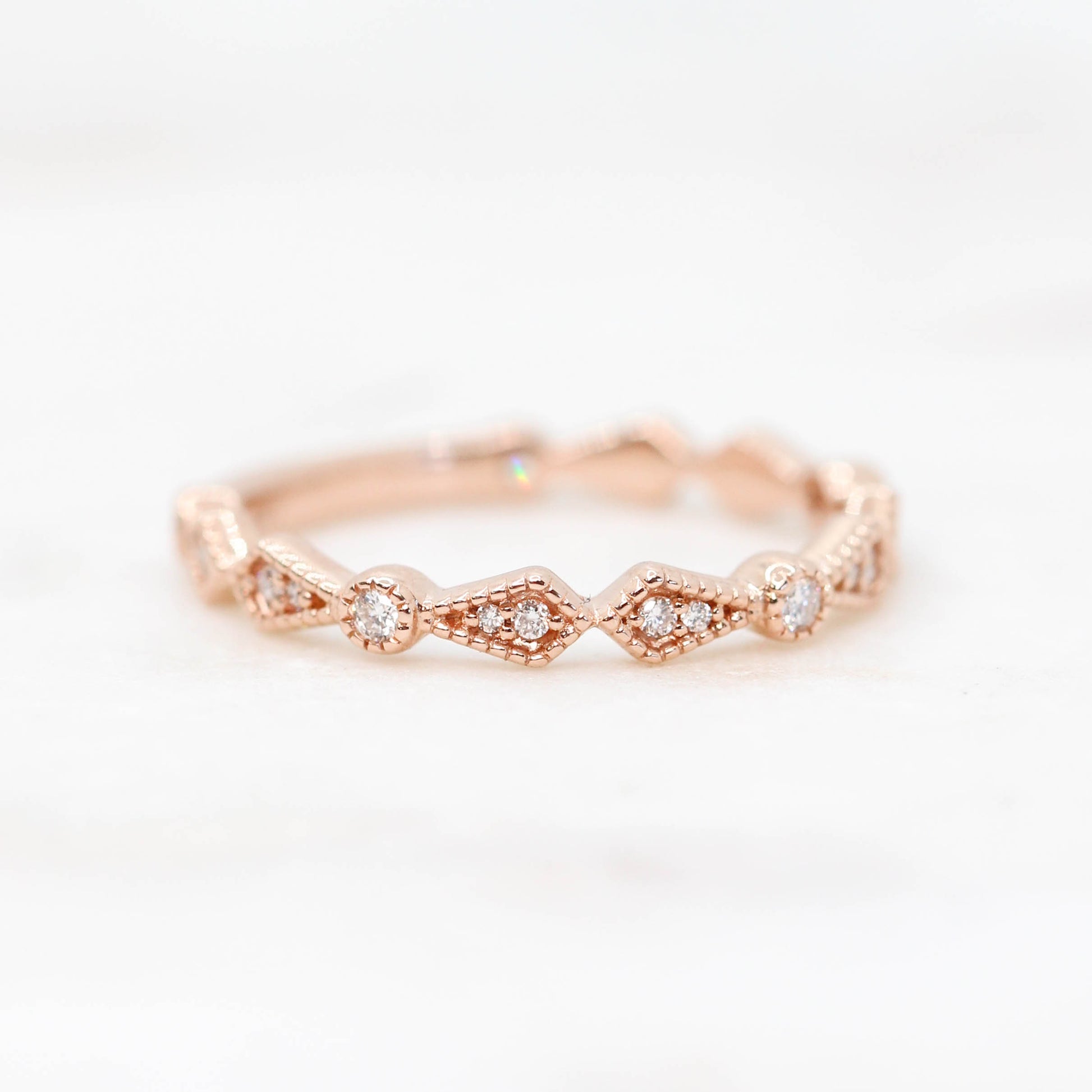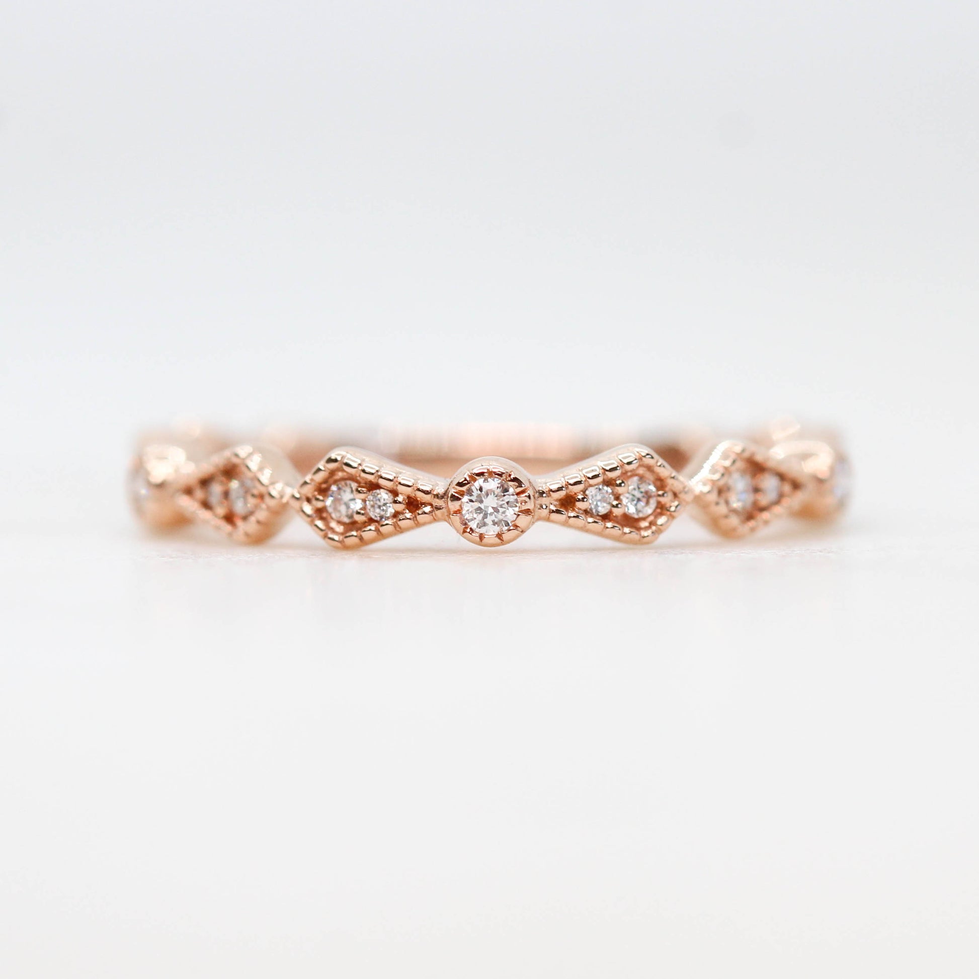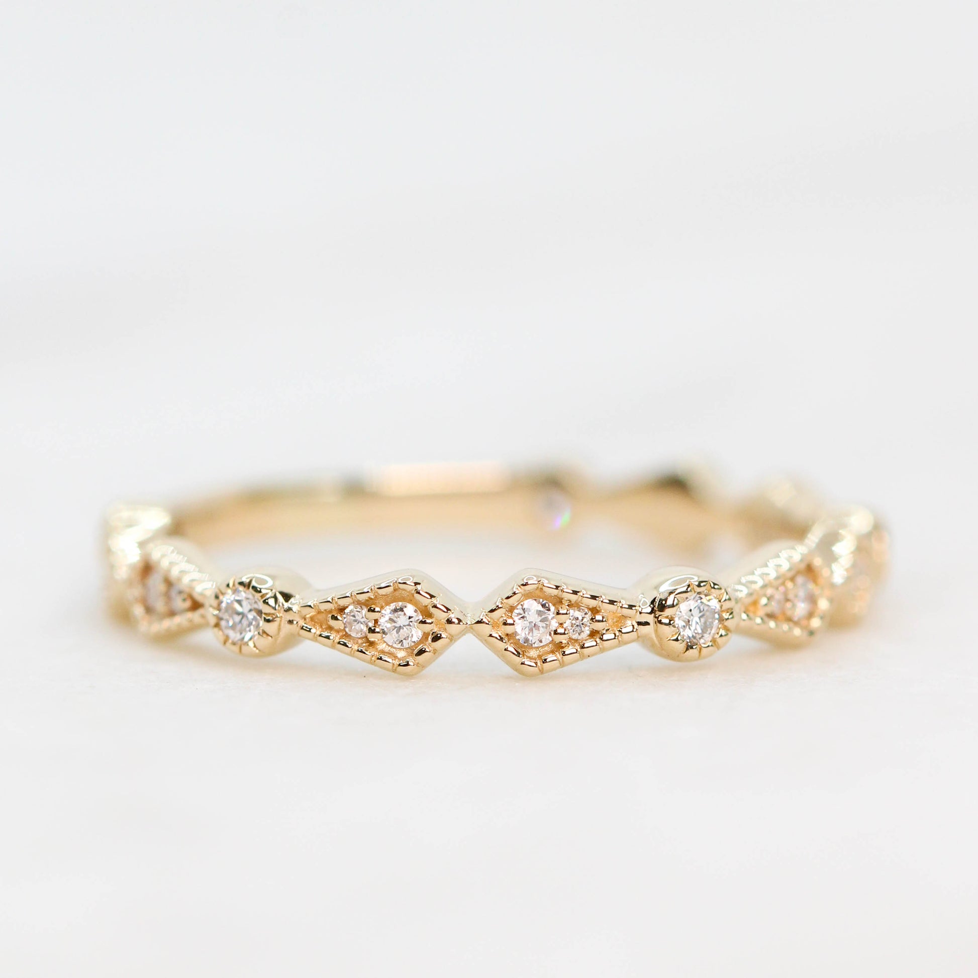 • This band is a unique geometric piece with an art deco style, complete with round diamonds and metal work details.