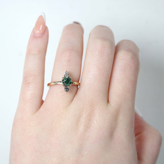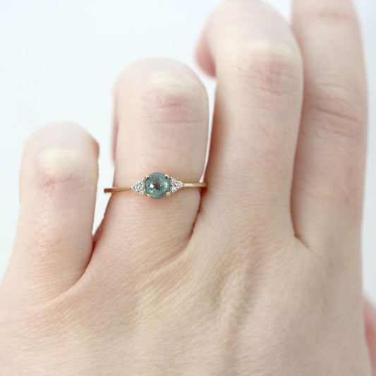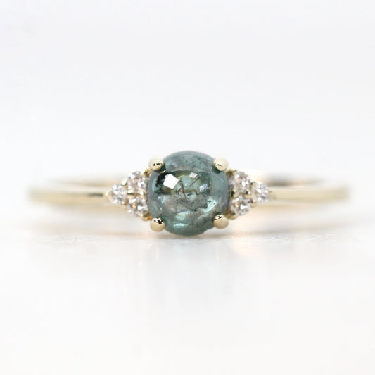 Blair Ring with a 1.09 Carat Round Teal Green Sapphire and Gray and Black Accent Diamonds in 10k Yellow Gold - Ready to Size and Ship