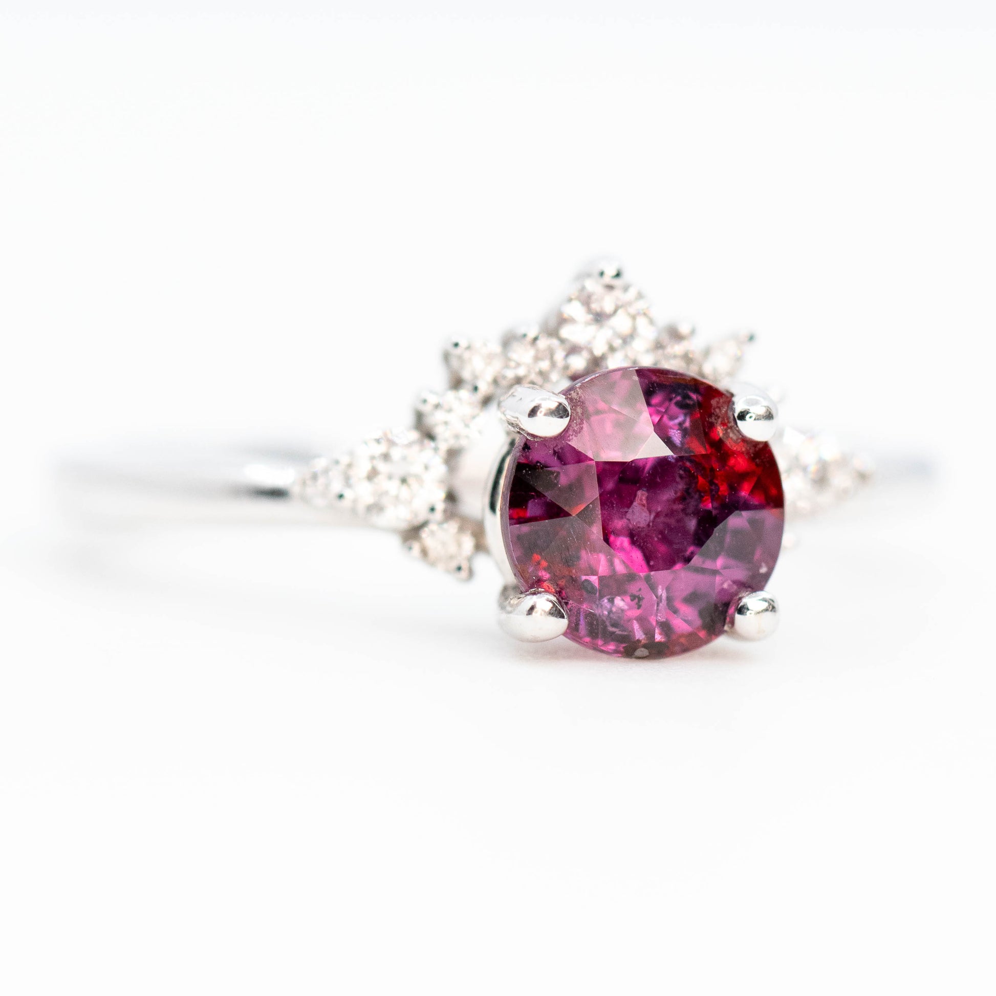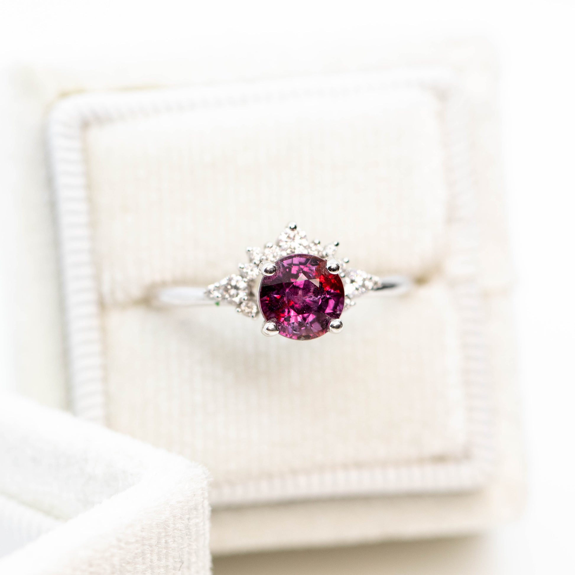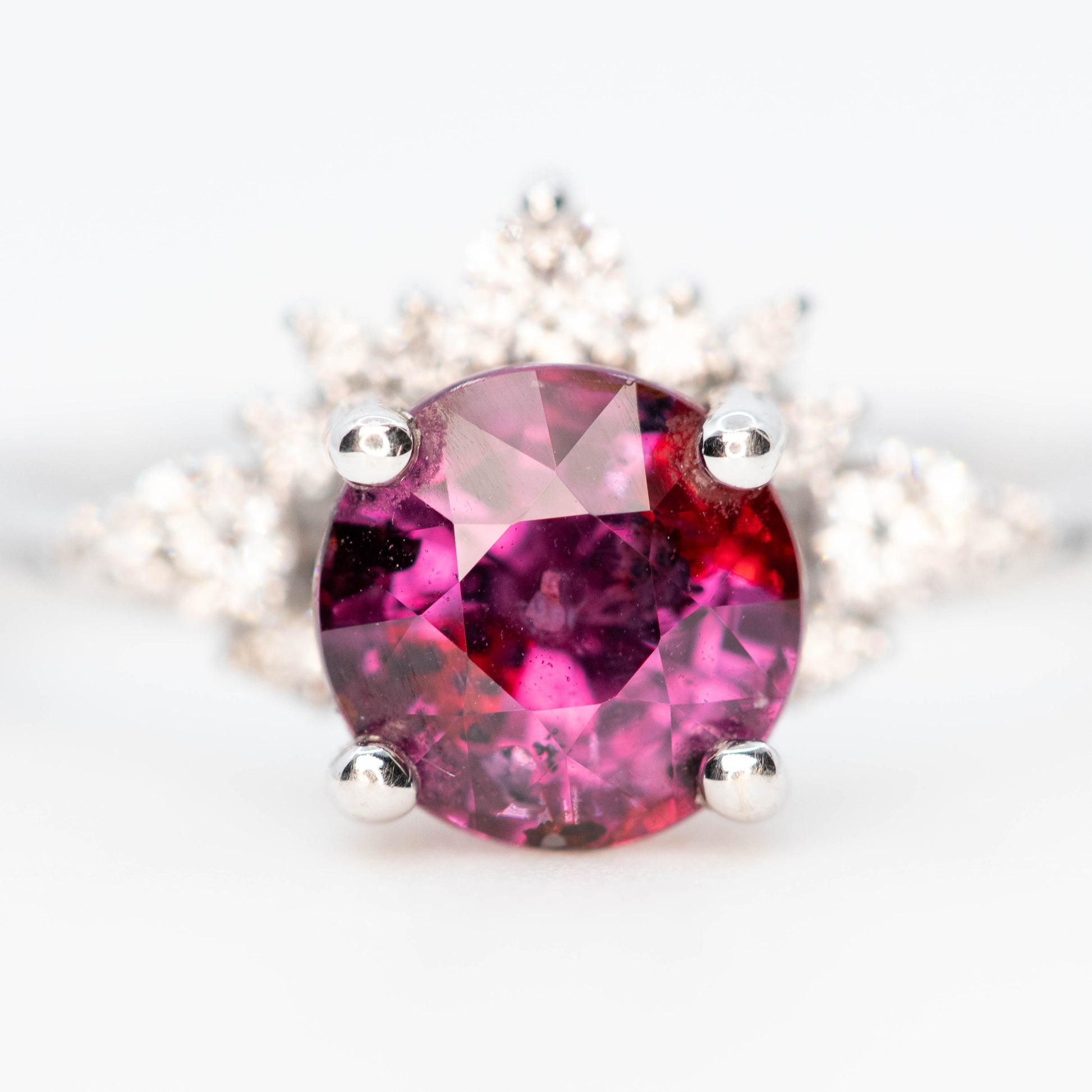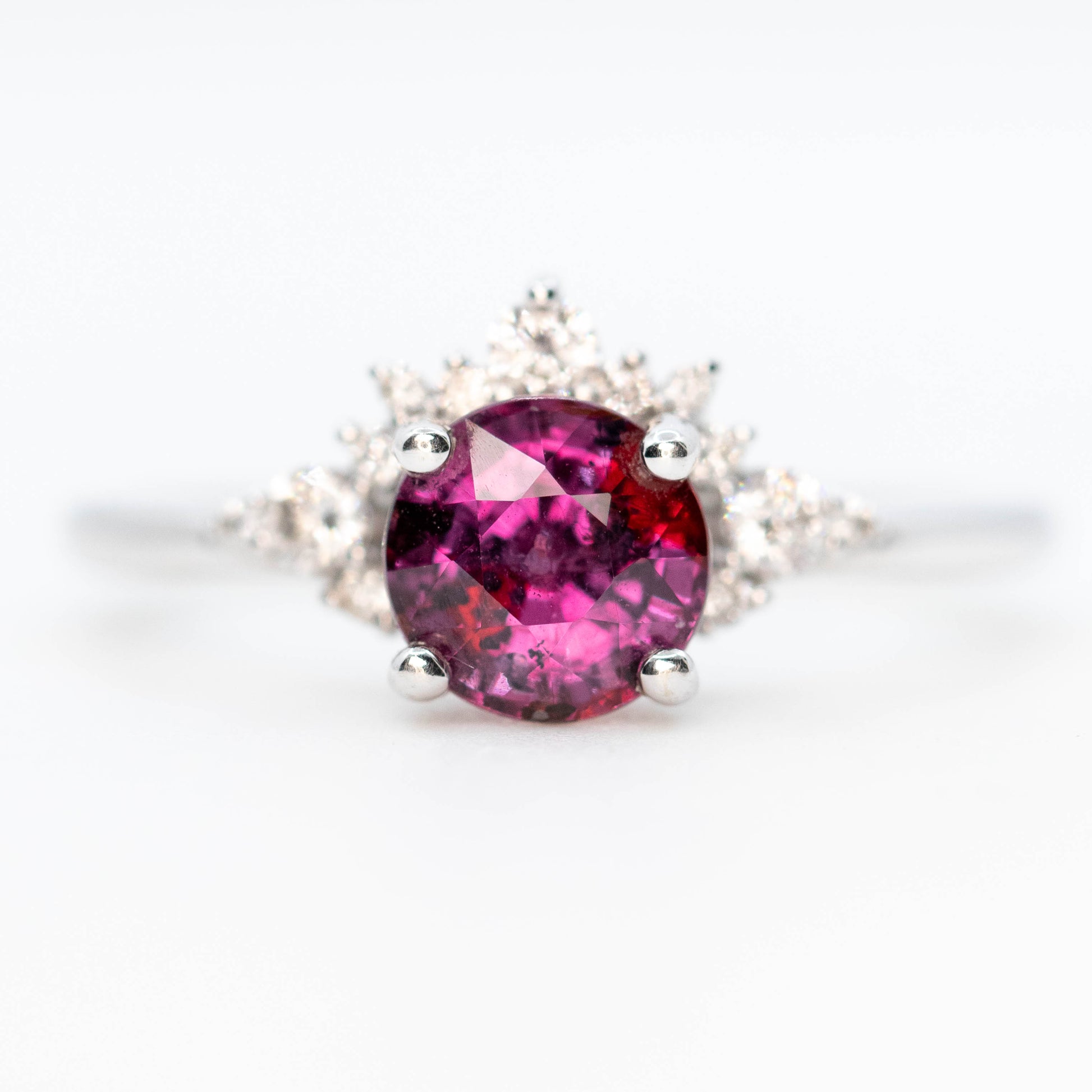 Athena Ring with a 1.72 Carat Round Berry Sapphire and White Accent Diamonds in 14k White Gold - Ready to Size and Ship