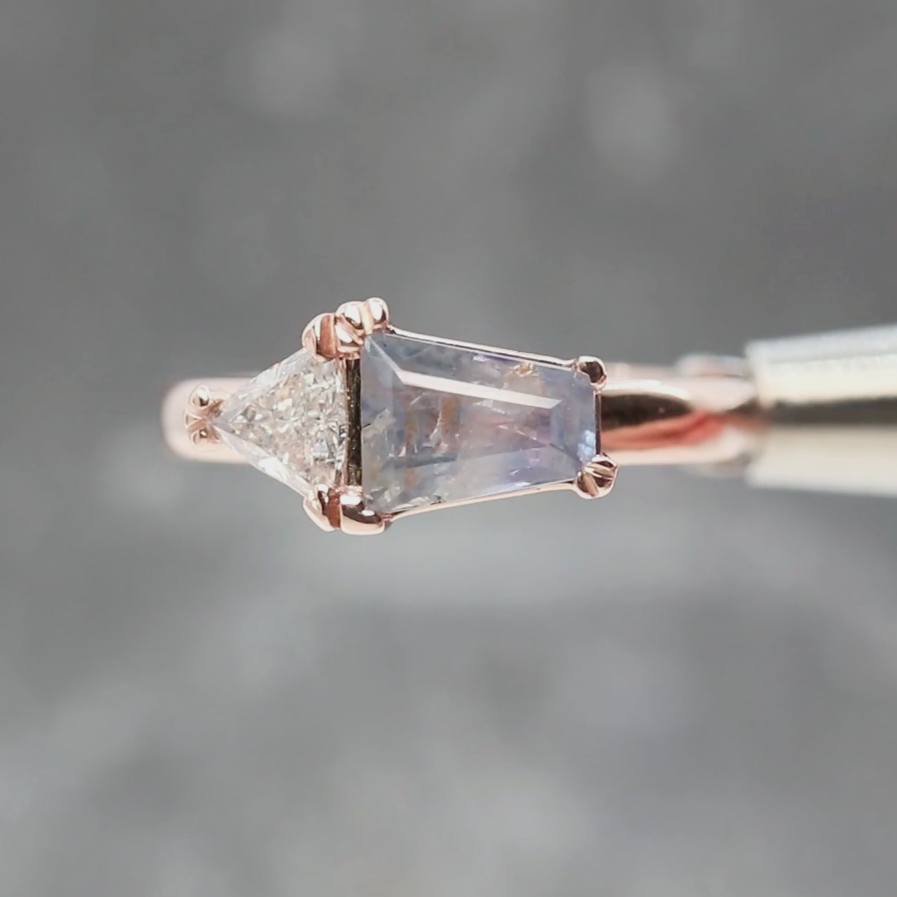 Jade Ring with a 1.39 Carat Blue Trapezoid Sapphire and a 0.40 Carat Trillion Diamond in 14k Rose Gold - Ready to Size and Ship