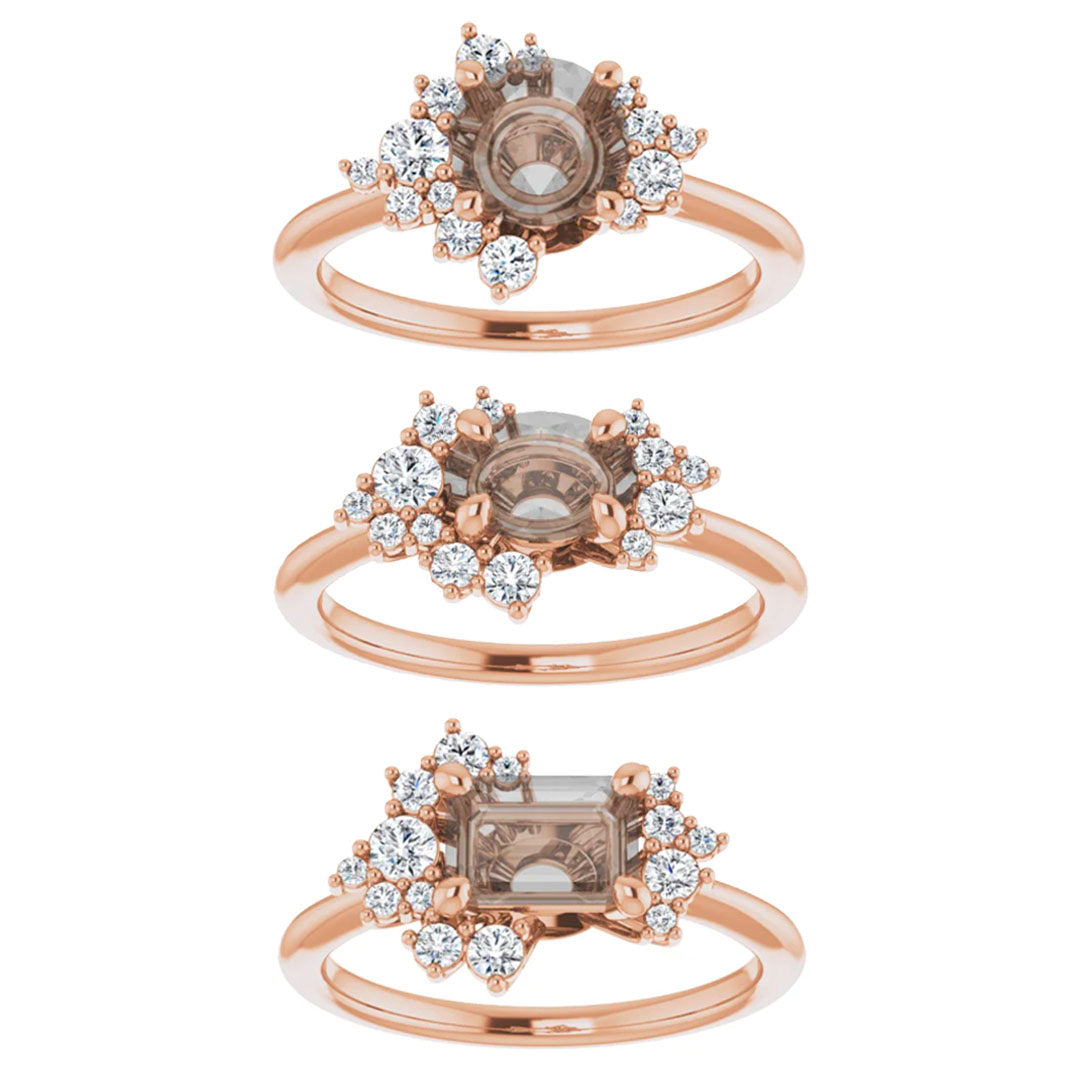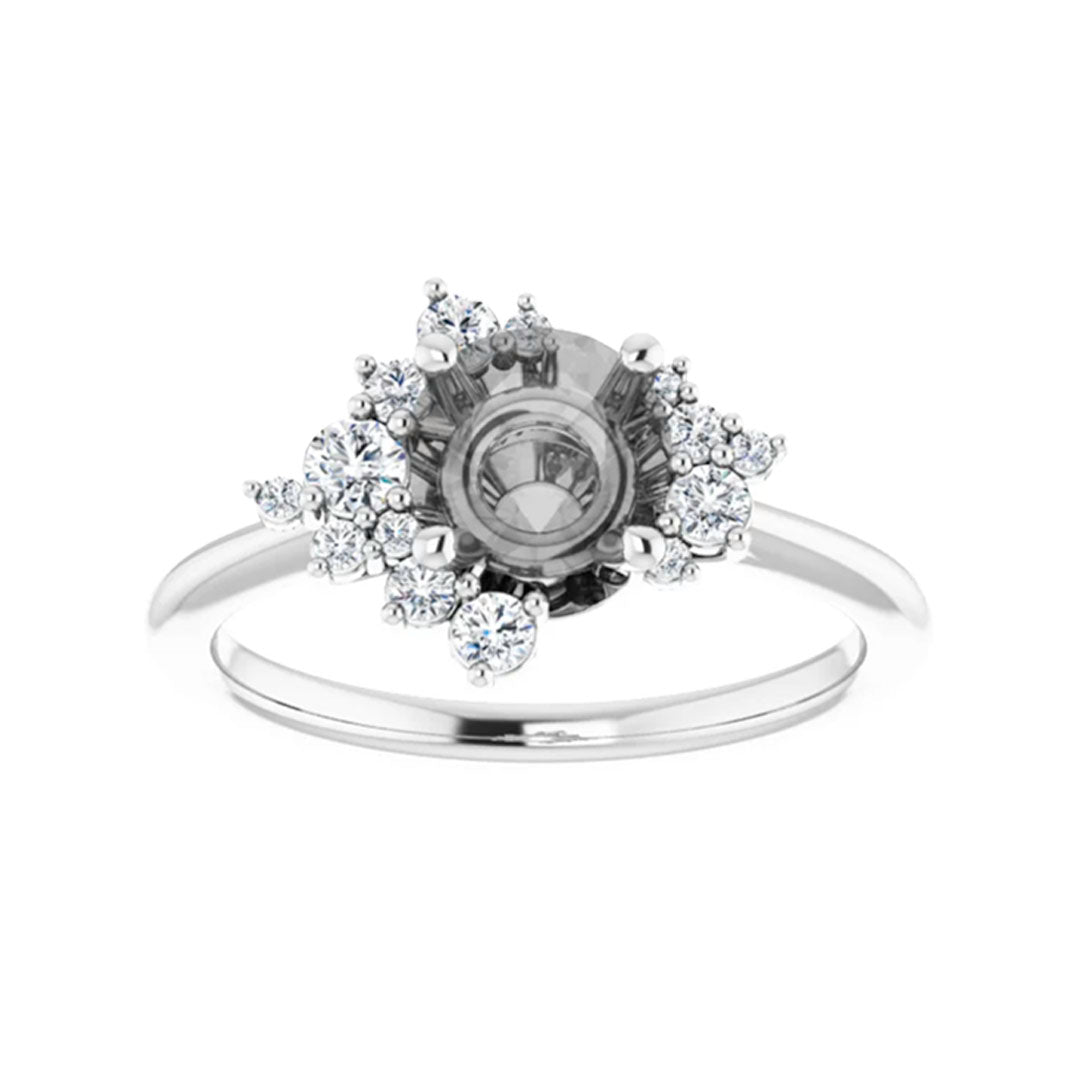 • A beautifully asymmetric cluster of stones form a partial halo around the center stone.