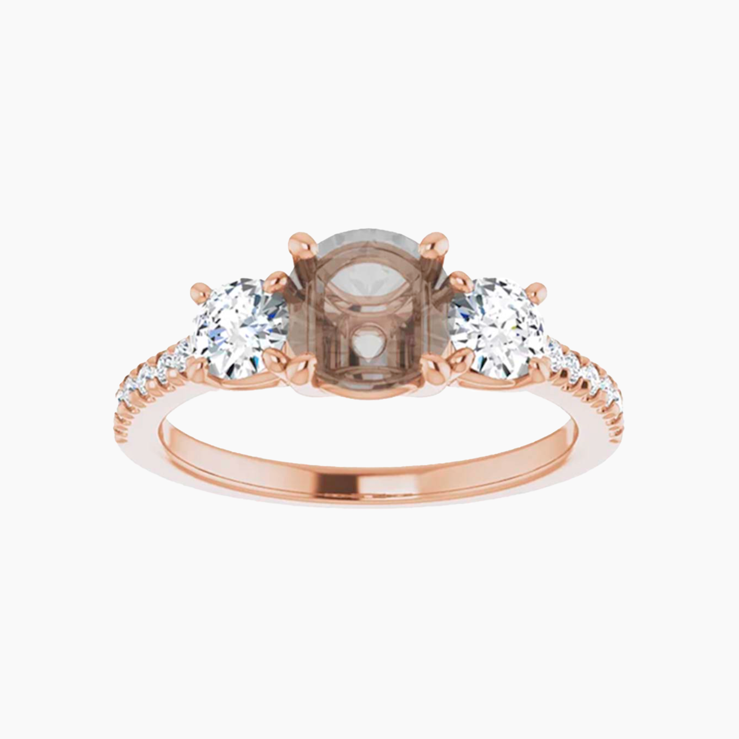 • A pave setting going about halfway down the band with a round side stone on each side of the center stone.