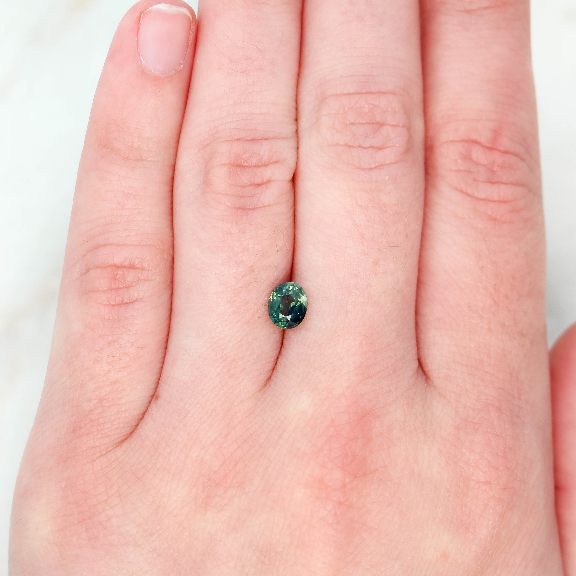 • Color and notes: This lovely teal sapphire has spots of yellow and darker blue tones mixed throughout. It has a beautiful clarity and sparkle.