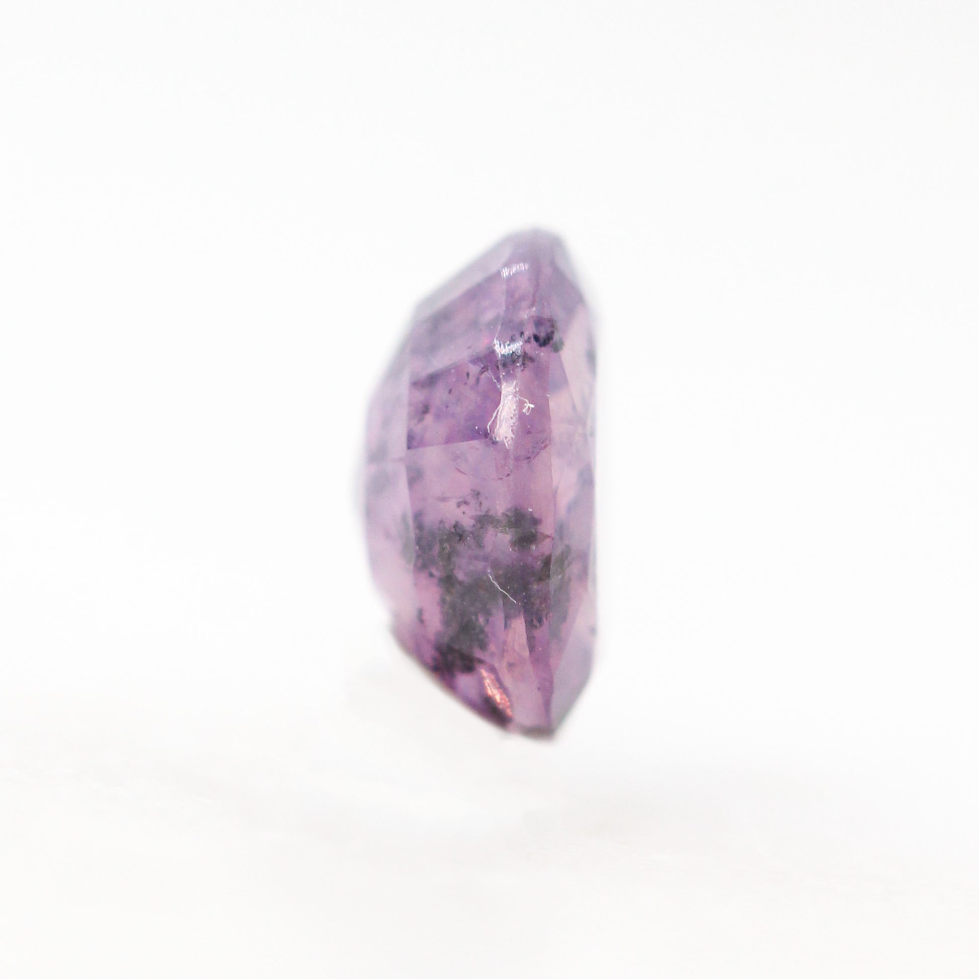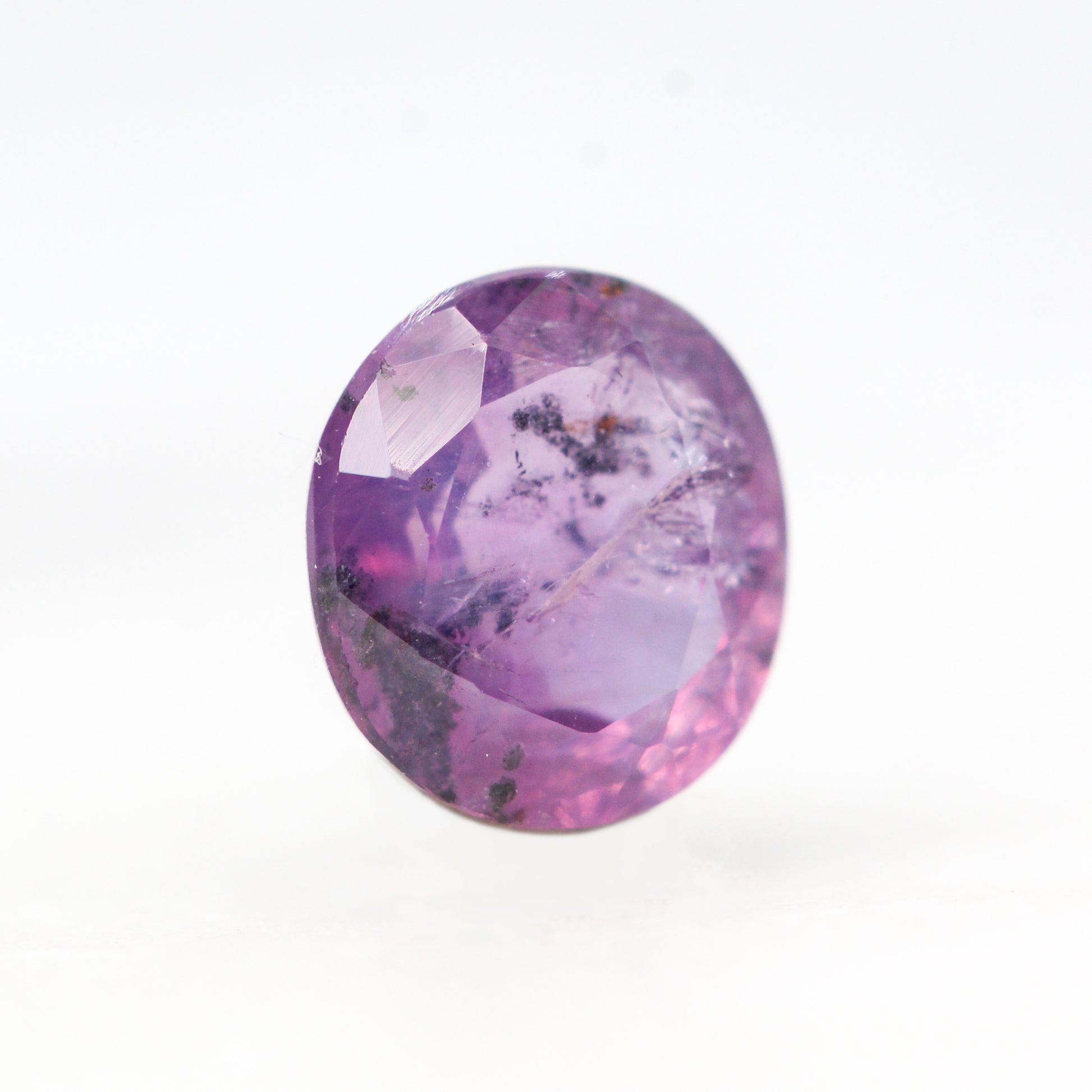 • Color and notes: Purple sapphire with notes of pink and berry tones. Thick black inclusions are scattered throughout the stone. Nice clarity with a white sparkle.