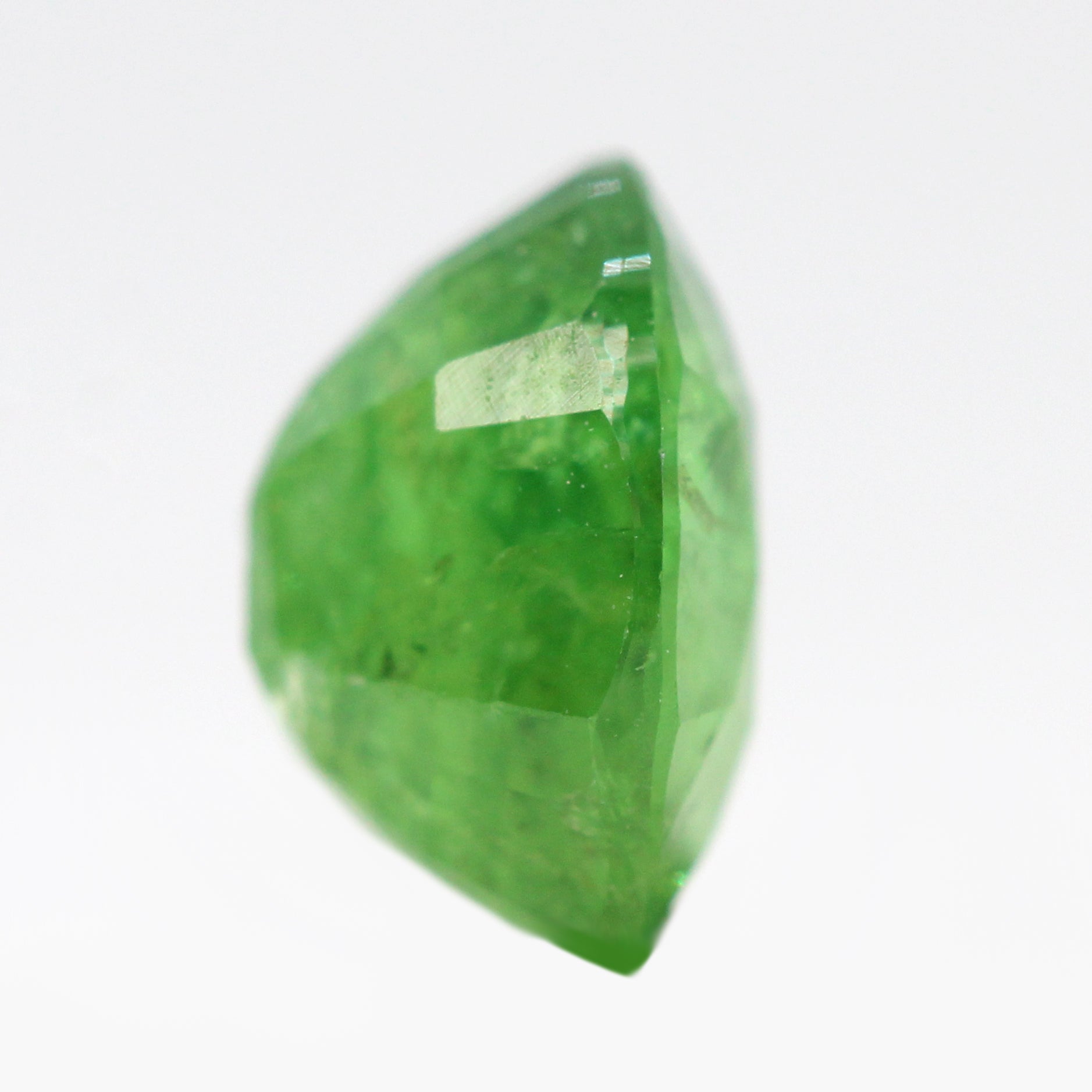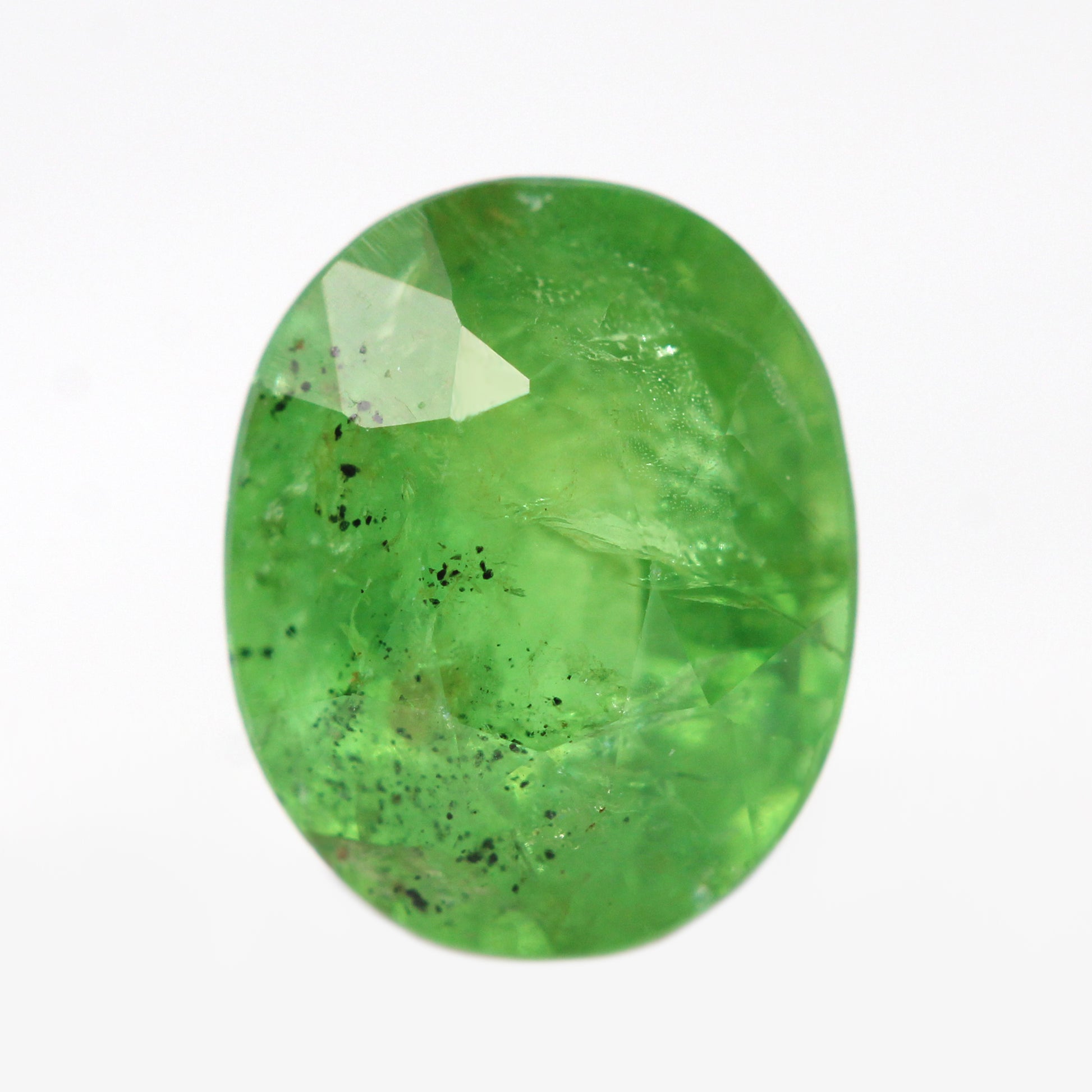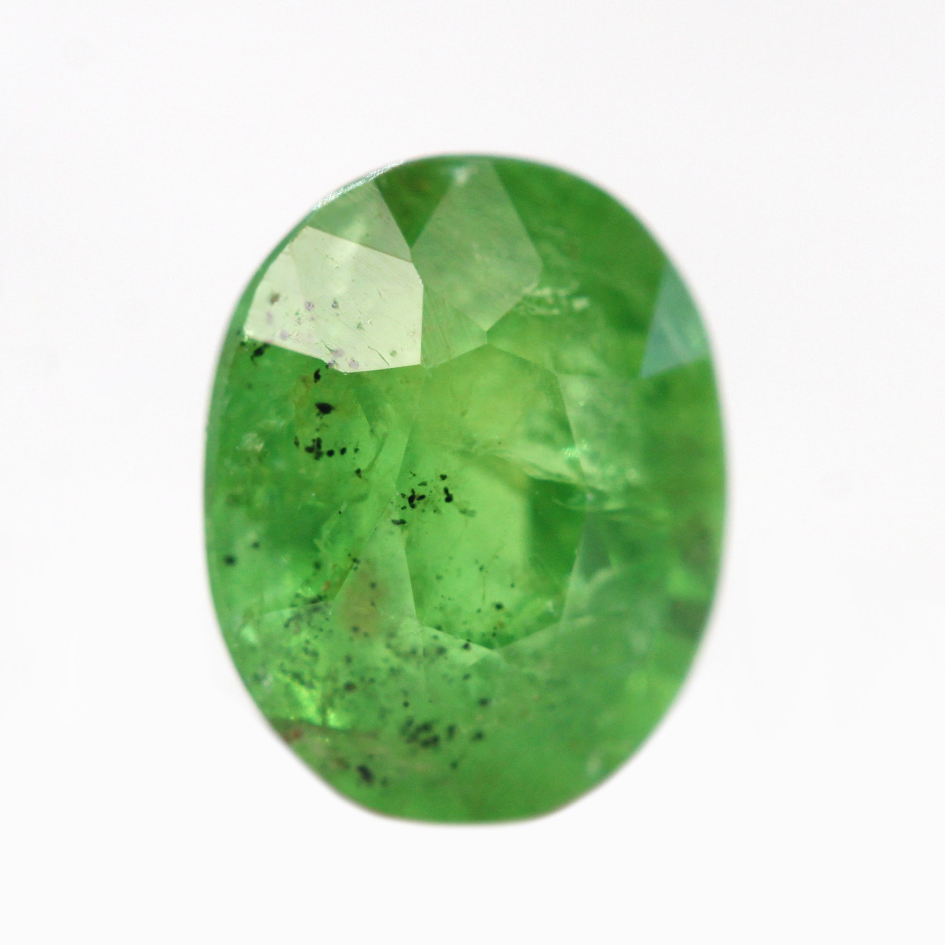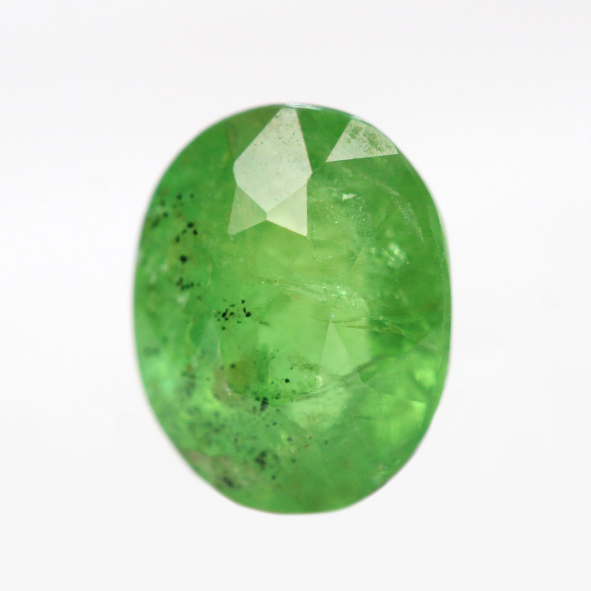 - Color and notes: Vibrant, spring green color with some unique black and brown freckle inclusions on the side of the stone. Nice clarity with a stunning reflective shimmer.