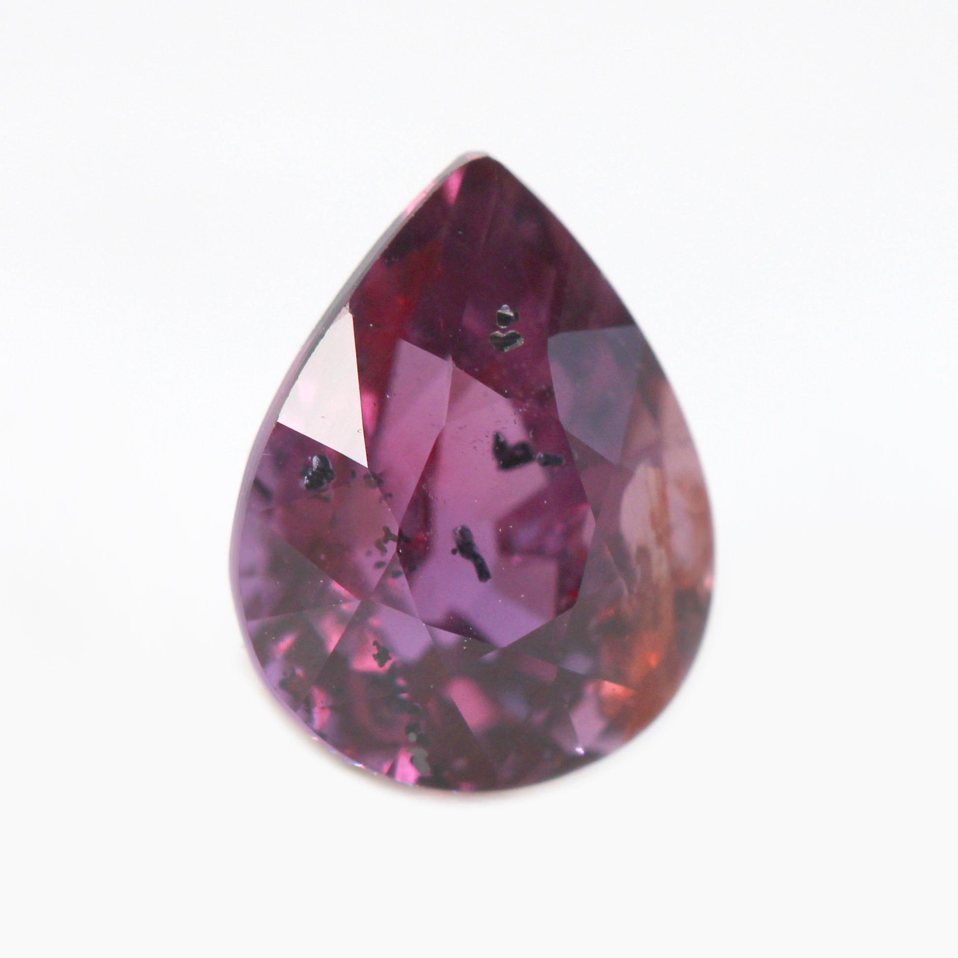 - Color and notes: Unique gem with an overall magenta tone and a stunning blend of red and pink hues. Has some unique black speckle and red inclusions throughout. Nice clarity that allows for light to shine through and create a vibrant shimmer. Has a small chip that can be seen in the center of the last photo.