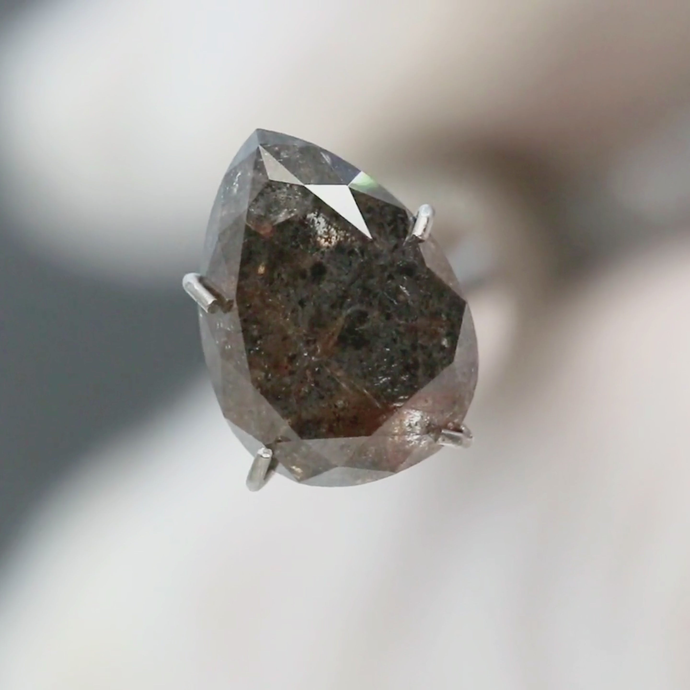 - Color and notes: Stunning natural black diamond with a subtle charcoal tone. Has a warm brown inclusion in the center that makes it seem as though it is glowing from within. Rose cut featured in second, fifth, and sixth photos.