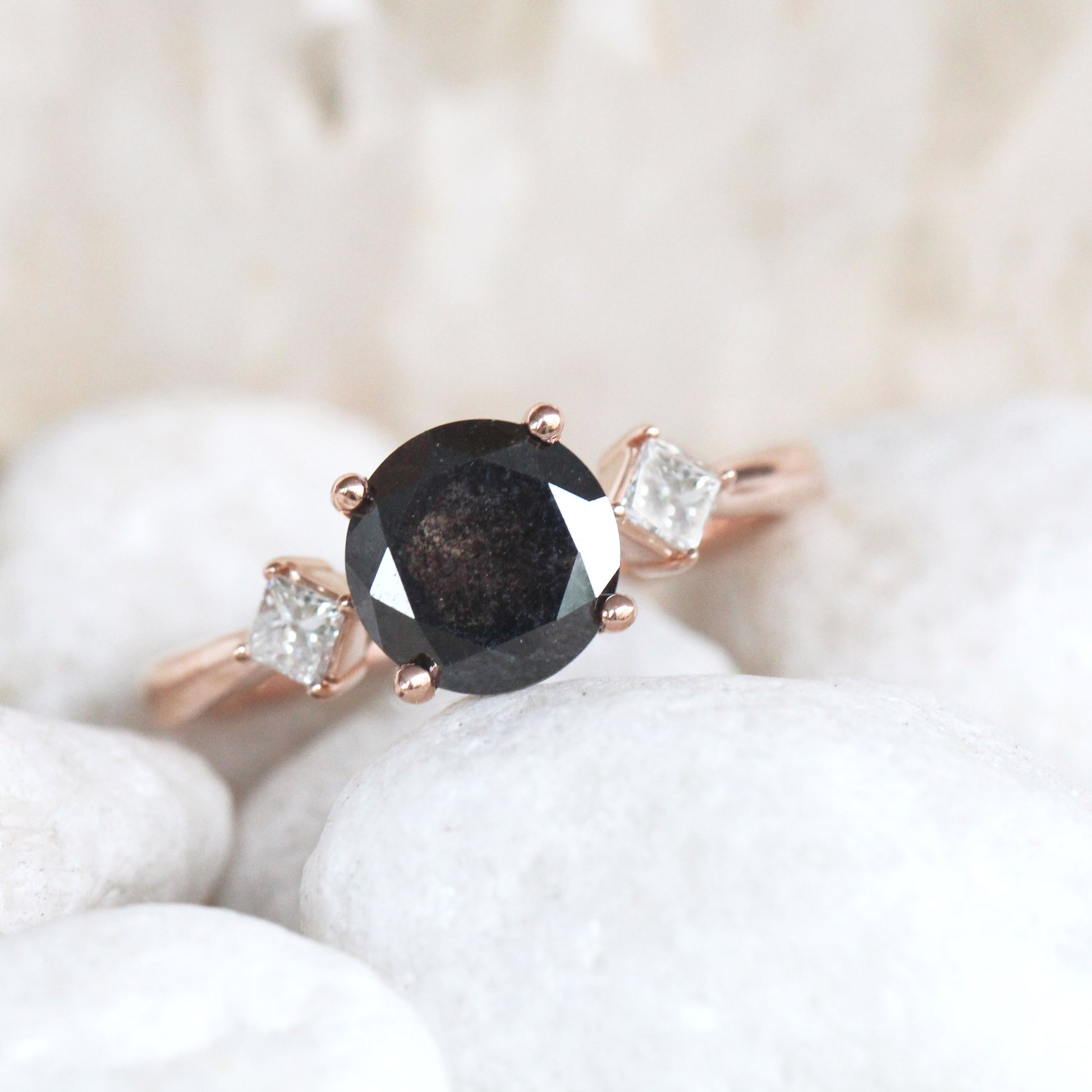 We often work with amazing and stunning natural diamonds that we call Celestial diamonds, which the industry sometimes calls salt and pepper diamonds, or galaxy diamonds. We worked with these diamonds before they were somewhat normal on the scene. Everything about the diamond is a real diamond, and possibly even more real than your "standard" diamond that may have been heat treated or had its inclusions microscopically removed/filled. The perfectly imperfect stones are each unique, and since they are not your standard mass-purchased stone in our industry, it isn't worth the effort for "bad guys" to make fakes that look like these.