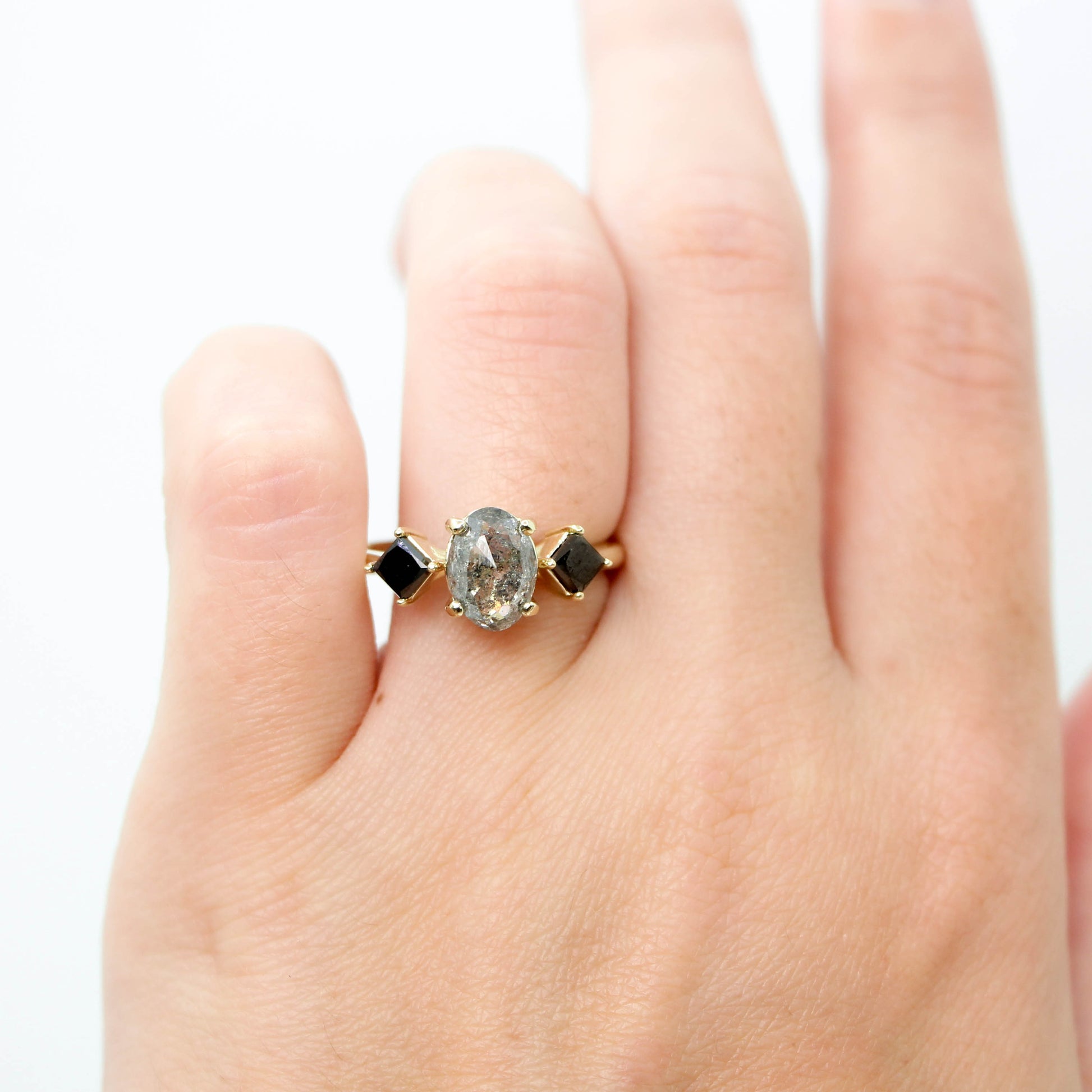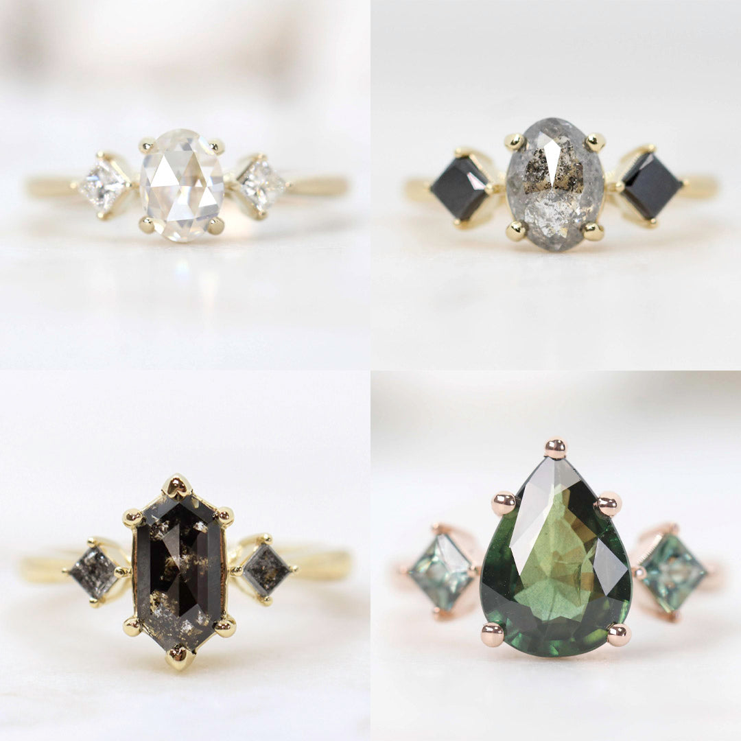 At Midwinter Co. Jewelry, we are a sustainable and tiny but trusted small business to create your unique and alternative bride type engagement rings. We are a leader in the salt and pepper diamond world, a quiet luxury brand that works one on one with you to design the most unique, gorgeous, modern jewelry. Midwinter Co. is also one of the only brands that specializes in acutely unique gemstones such as bi-color sapphires, teal green blue sapphires, mossy aquamarine, mossy agate, black tourmaline in quartz, gold in quartz, tourmaline in unique colors, gray sapphires, gray spinel, dark gray spinel, dark gray diamonds, black diamonds, black speckled diamonds, celestial diamonds, galaxy diamonds, dendritic agate, dendritic opal, dendritic quartz, branchy gemstones, quartz with black star hollandite, alexandrite, garnet, peridot with or without tourmaline, harmony quartz aka melody quartz aka seven stone quartz, morganite, emerald, topaz, misty white diamonds, white blue diamonds, opalescent diamonds, opalescent sapphires, parti sapphires, and more. Within our walls, we carry only a small select of stock as much of our work is custom. We custom design and personalize every ring setting/mounting to fit the unique gemstones and diamonds we carry. We can design you a custom ring set based off of a drawing or screen shots, aesthetics, themes, and more. We also have bridal necklaces, bridal earrings, mothers earrings, bridesmaids earrings, modern asymmetrical sapphire diamond earrings and more. Our small team is mighty and caring. Midwinter Co. is top rated with 5/5 100% 5 star on google. Drive 25-35 minutes from Philadelphia to visit our showroom to see our in stock pieces and stones. We can create: couples rings, rings for couples, rings for twins, twins rings, ring sets for couples, matching ring sets, custom stacking rings, custom stacking ring sets, bridal sets, custom right hand rings, custom mother gemstone rings, vintage style rings, modern style engagement rings, rings for the alt-bride, etc. We are LGBTQIA+ friendly, husband and wife owned. Our brand has been featured on E! News, Refinery 29, Vogue UK & magazines nation and internationally. We hope to be a small part of your story. Thank you for being a big part of ours!