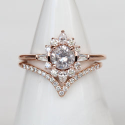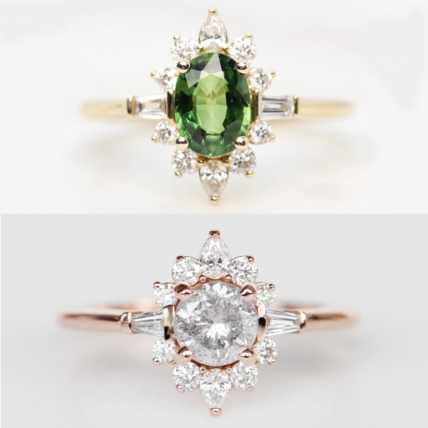 At Midwinter Co. Jewelry, we are a sustainable and tiny but trusted small business to create your unique and alternative bride type engagement rings. We are a leader in the salt and pepper diamond world, a quiet luxury brand that works one on one with you to design the most unique, gorgeous, modern jewelry. Midwinter Co. is also one of the only brands that specializes in acutely unique gemstones such as bi-color sapphires, teal green blue sapphires, mossy aquamarine, mossy agate, black tourmaline in quartz, gold in quartz, tourmaline in unique colors, gray sapphires, gray spinel, dark gray spinel, dark gray diamonds, black diamonds, black speckled diamonds, celestial diamonds, galaxy diamonds, dendritic agate, dendritic opal, dendritic quartz, branchy gemstones, quartz with black star hollandite, alexandrite, garnet, peridot with or without tourmaline, harmony quartz aka melody quartz aka seven stone quartz, morganite, emerald, topaz, misty white diamonds, white blue diamonds, opalescent diamonds, opalescent sapphires, parti sapphires, and more. Within our walls, we carry only a small select of stock as much of our work is custom. We custom design and personalize every ring setting/mounting to fit the unique gemstones and diamonds we carry. We can design you a custom ring set based off of a drawing or screen shots, aesthetics, themes, and more. We also have bridal necklaces, bridal earrings, mothers earrings, bridesmaids earrings, modern asymmetrical sapphire diamond earrings and more. Our small team is mighty and caring. Midwinter Co. is top rated with 5/5 100% 5 star on google. Drive 25-35 minutes from Philadelphia to visit our showroom to see our in stock pieces and stones. We can create: couples rings, rings for couples, rings for twins, twins rings, ring sets for couples, matching ring sets, custom stacking rings, custom stacking ring sets, bridal sets, custom right hand rings, custom mother gemstone rings, vintage style rings, modern style engagement rings, rings for the alt-bride, etc. We are LGBTQIA+ friendly, husband and wife owned. Our brand has been featured on E! News, Refinery 29, Vogue UK & magazines nation and internationally. We hope to be a small part of your story. Thank you for being a big part of ours!
