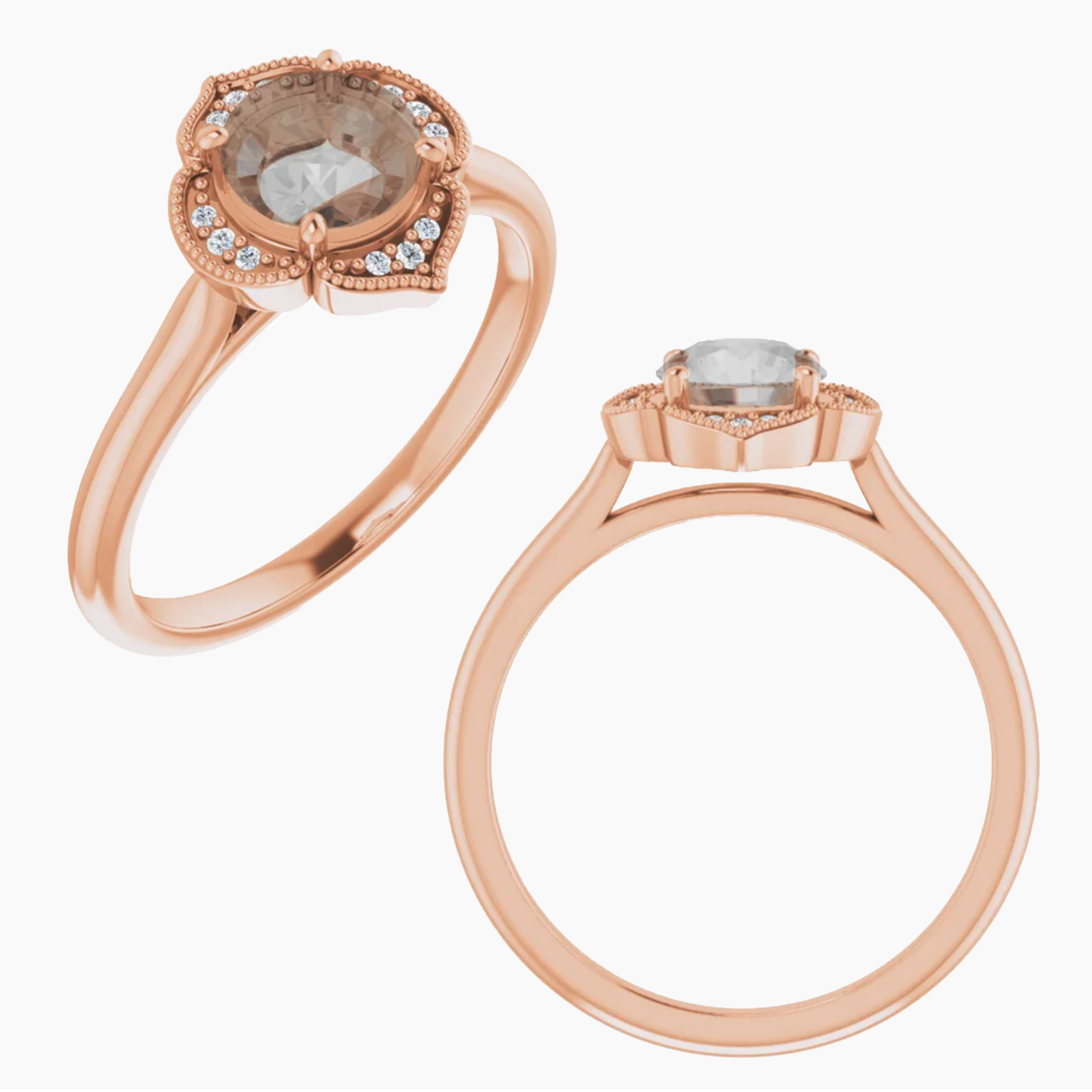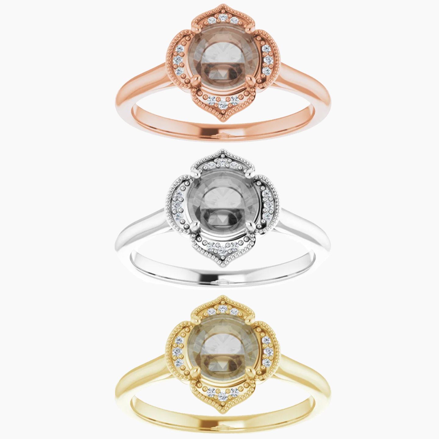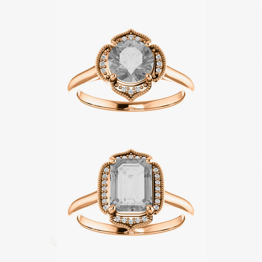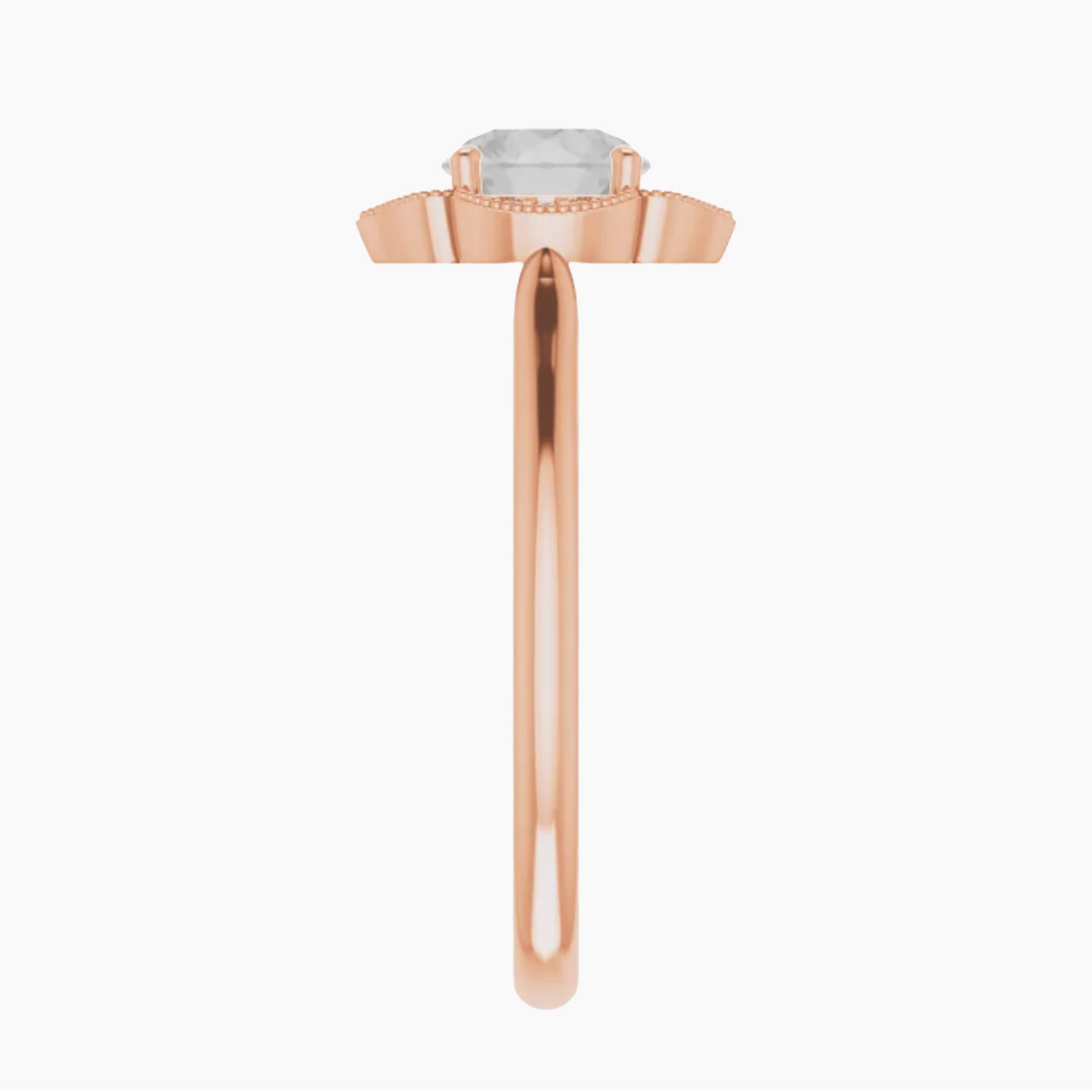 - Milgrain details and accent stones form a unique halo with an art deco feel.