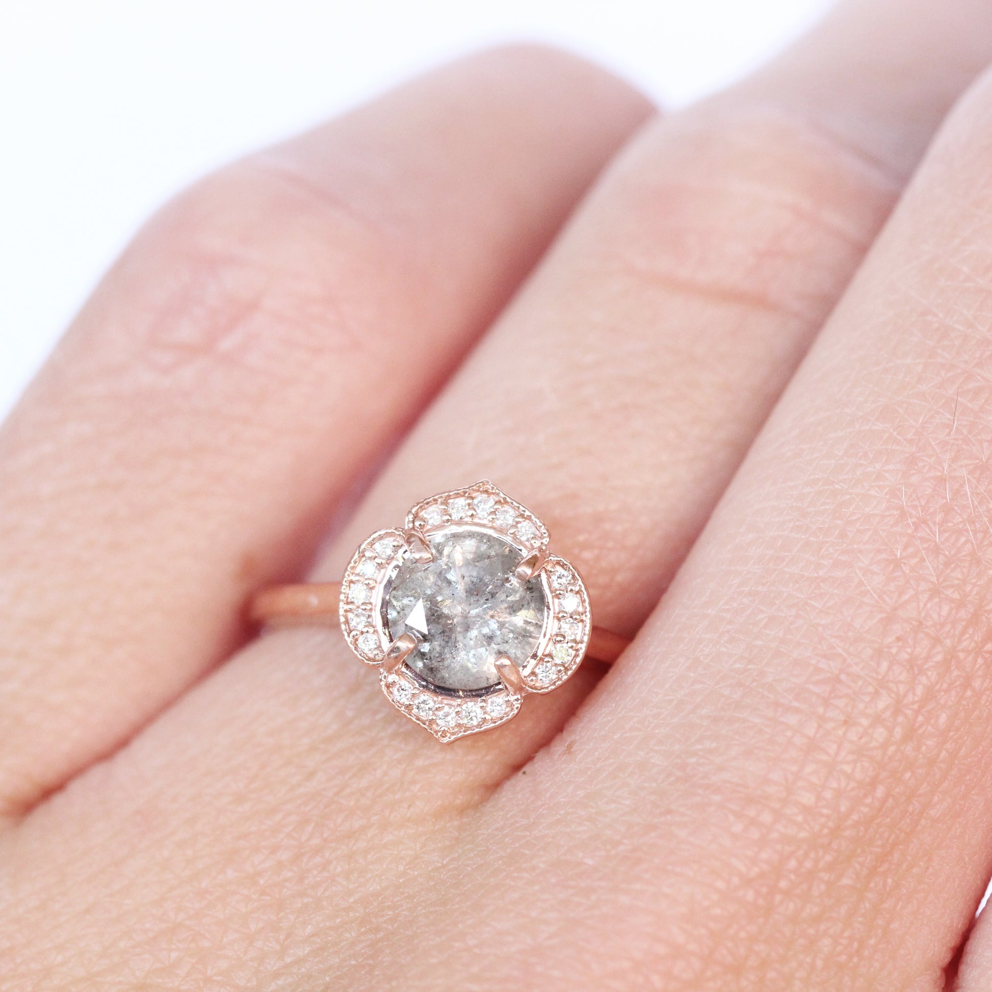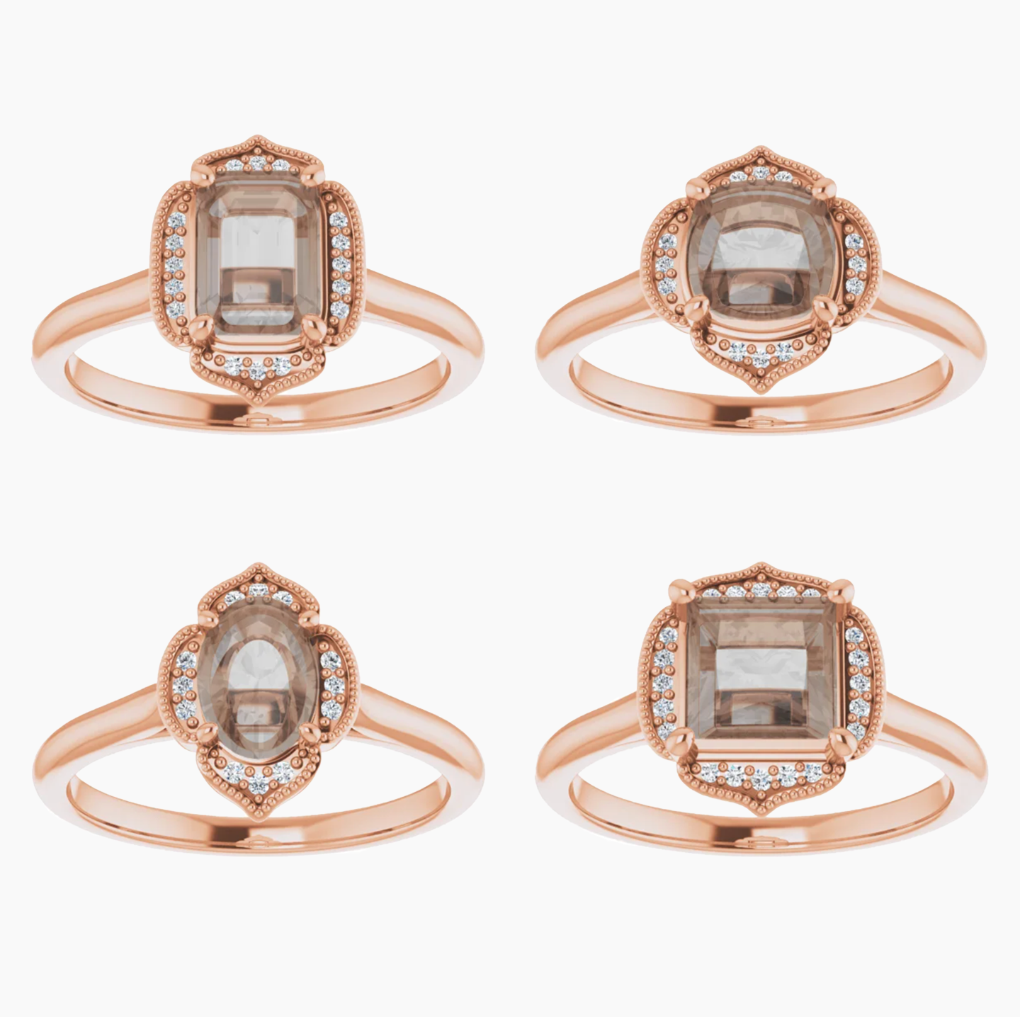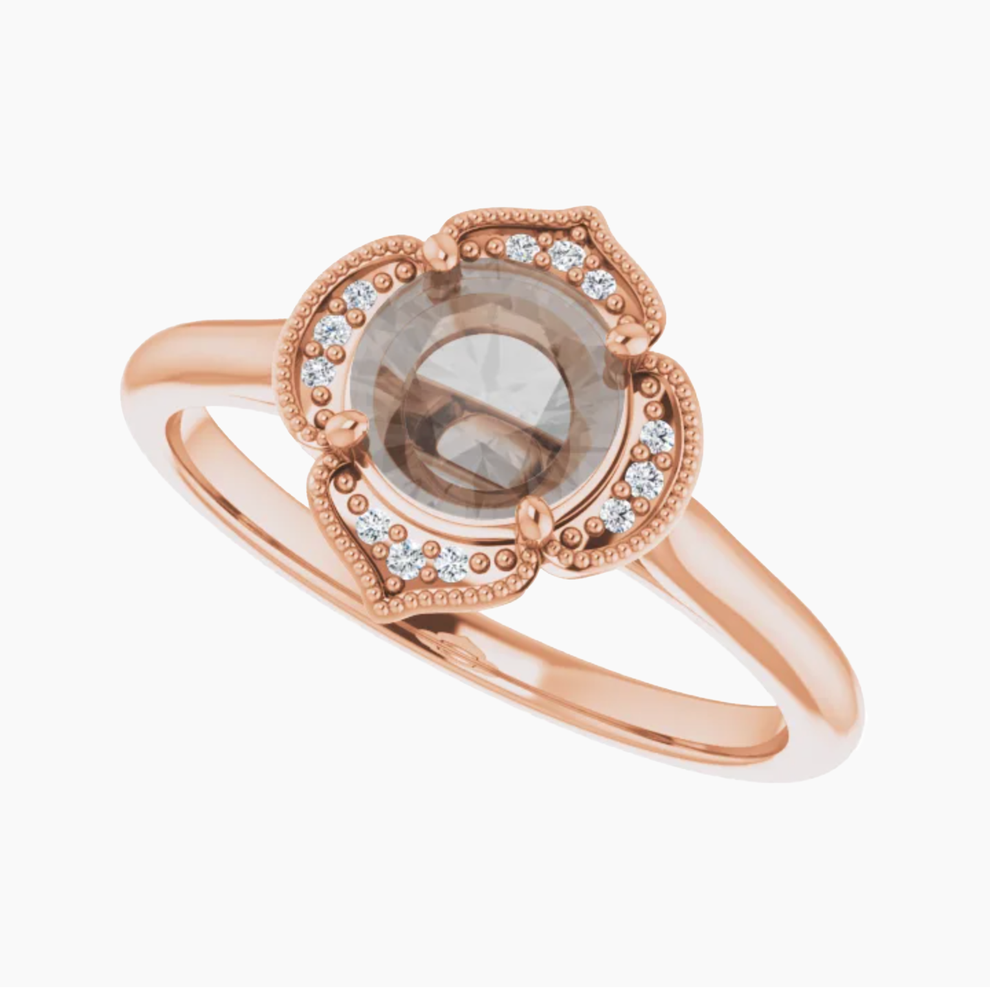 - Milgrain details and accent stones form a unique halo with an art deco feel.