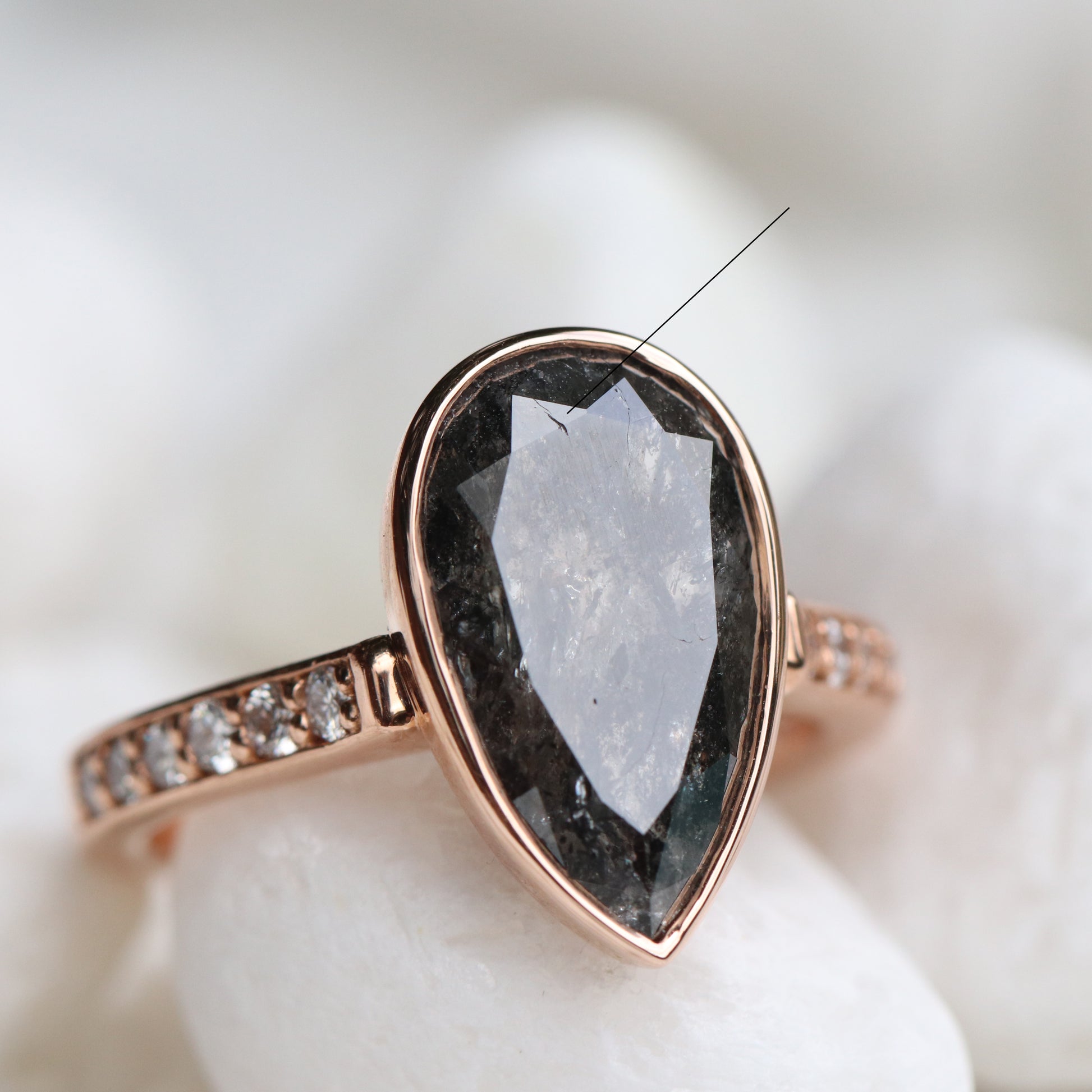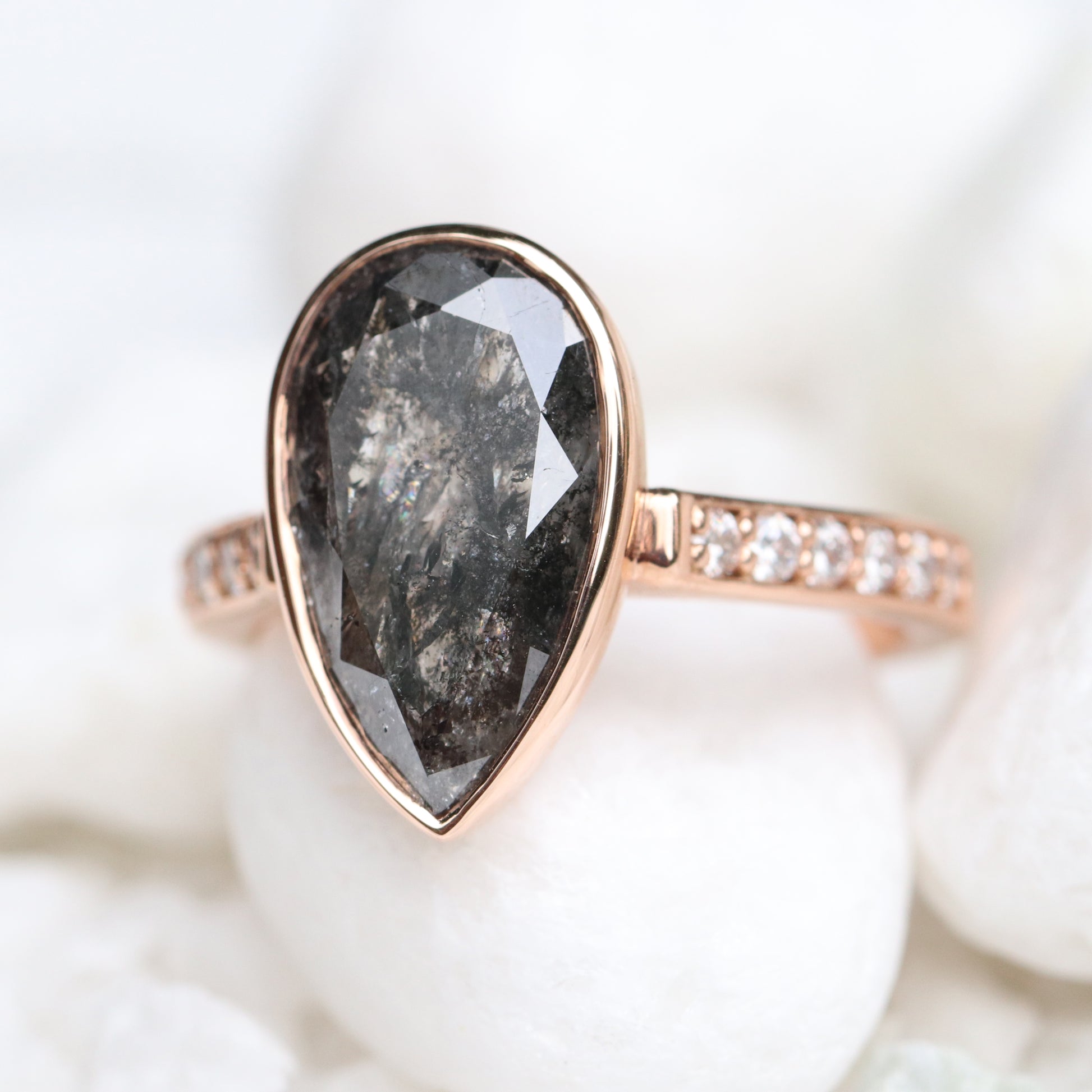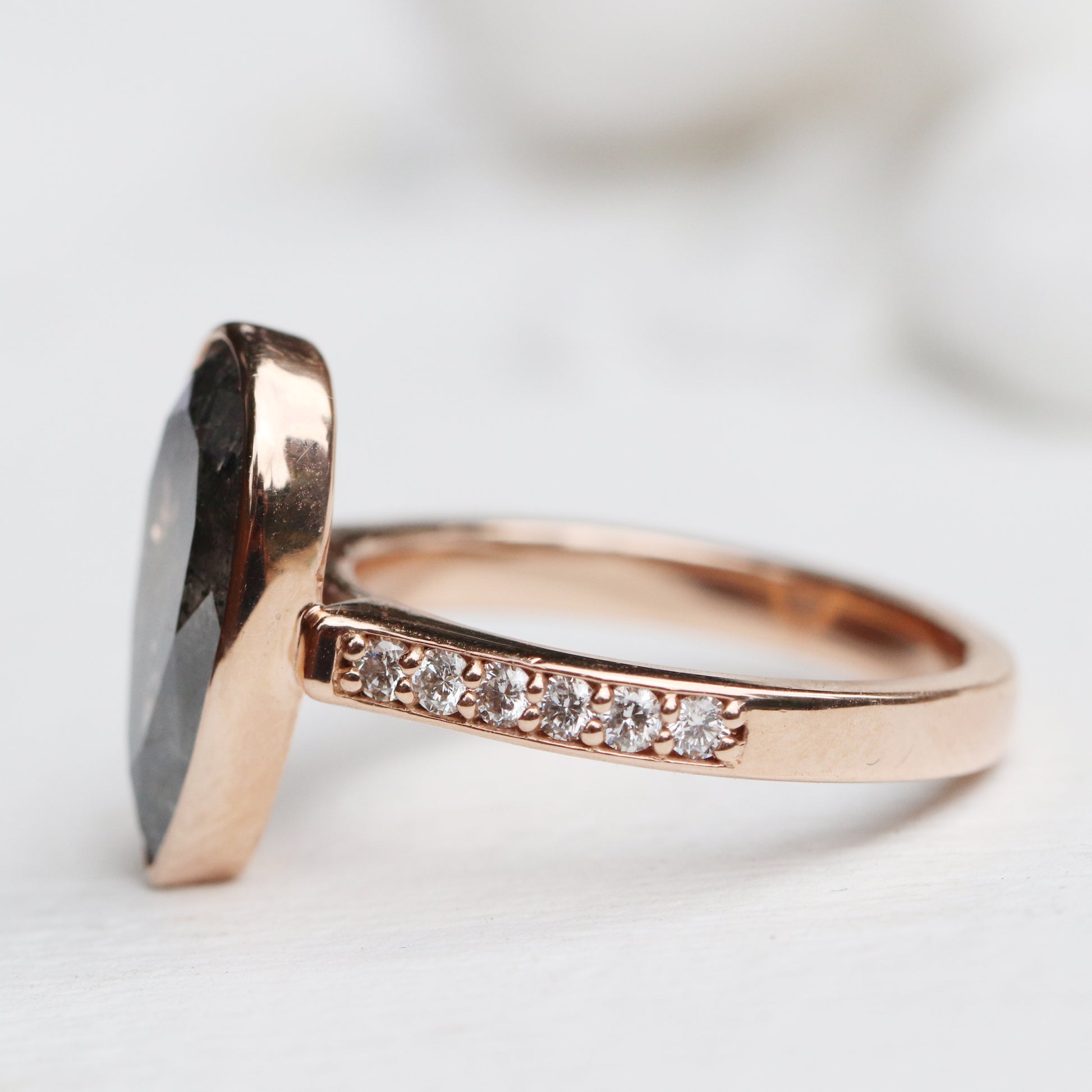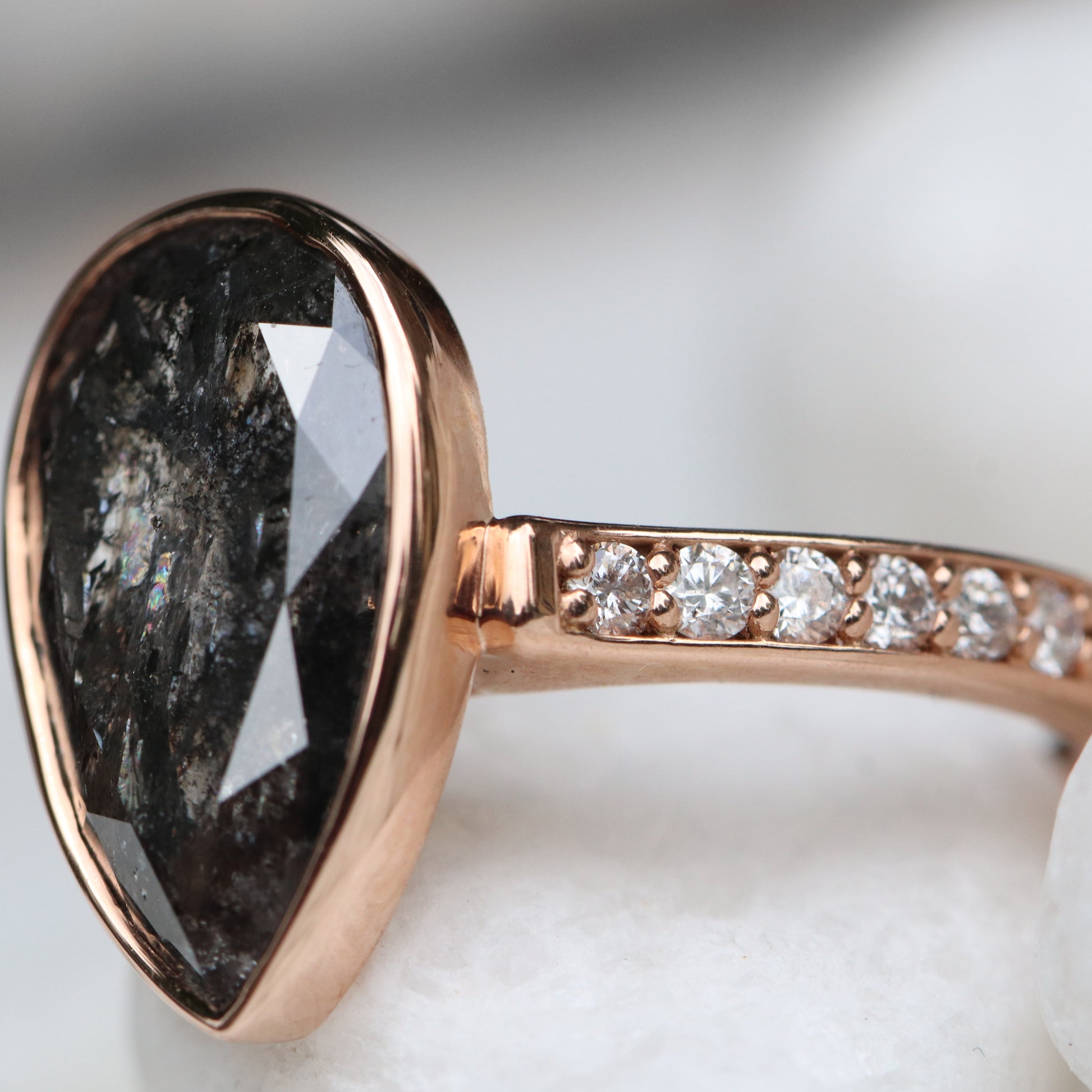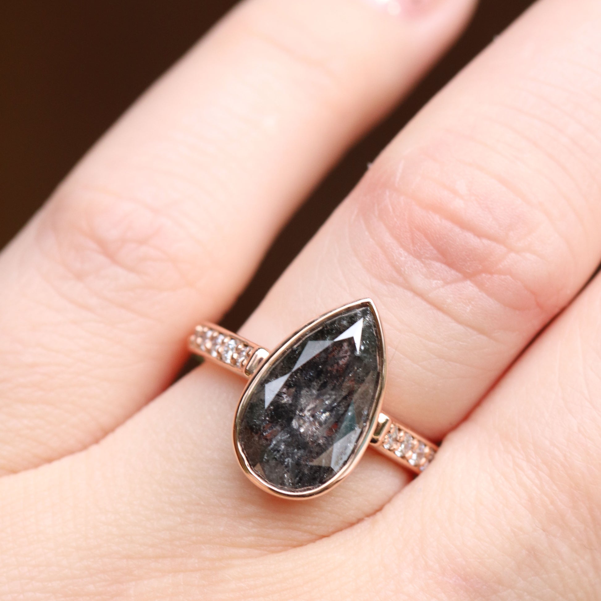 Project: Custom Corie Bezel Set Salt and Pepper Black Pear Diamond in 14k