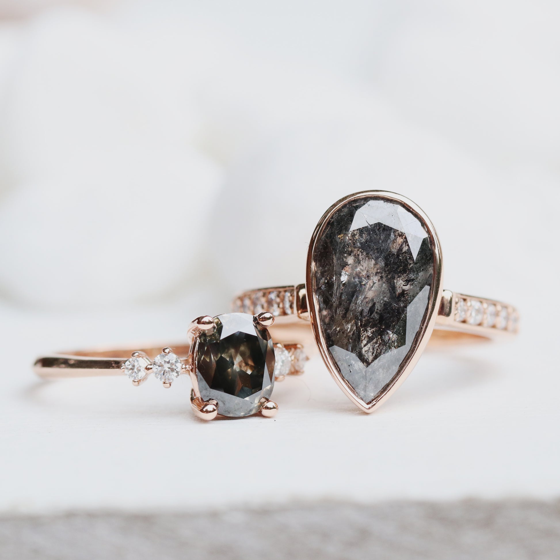 At Midwinter Co. Jewelry, we are a sustainable and tiny but trusted small business to create your unique and alternative bride type engagement rings. We are a leader in the salt and pepper diamond world, a quiet luxury brand that works one on one with you to design the most unique, gorgeous, modern jewelry. Midwinter Co. is also one of the only brands that specializes in acutely unique gemstones such as bi-color sapphires, teal green blue sapphires, mossy aquamarine, mossy agate, black tourmaline in quartz, gold in quartz, tourmaline in unique colors, gray sapphires, gray spinel, dark gray spinel, dark gray diamonds, black diamonds, black speckled diamonds, celestial diamonds, galaxy diamonds, dendritic agate, dendritic opal, dendritic quartz, branchy gemstones, quartz with black star hollandite, alexandrite, garnet, peridot with or without tourmaline, harmony quartz aka melody quartz aka seven stone quartz, morganite, emerald, topaz, misty white diamonds, white blue diamonds, opalescent diamonds, opalescent sapphires, parti sapphires, and more. Within our walls, we carry only a small select of stock as much of our work is custom. We custom design and personalize every ring setting/mounting to fit the unique gemstones and diamonds we carry. We can design you a custom ring set based off of a drawing or screen shots, aesthetics, themes, and more. We also have bridal necklaces, bridal earrings, mothers earrings, bridesmaids earrings, modern asymmetrical sapphire diamond earrings and more. Our small team is mighty and caring. Midwinter Co. is top rated with 5/5 100% 5 star on google. Drive 25-35 minutes from Philadelphia to visit our showroom to see our in stock pieces and stones. We can create: couples rings, rings for couples, rings for twins, twins rings, ring sets for couples, matching ring sets, custom stacking rings, custom stacking ring sets, bridal sets, custom right hand rings, custom mother gemstone rings, vintage style rings, modern style engagement rings, rings for the alt-bride, etc. We are LGBTQIA+ friendly, husband and wife owned. Our brand has been featured on E! News, Refinery 29, Vogue UK & magazines nation and internationally. We hope to be a small part of your story. Thank you for being a big part of ours!