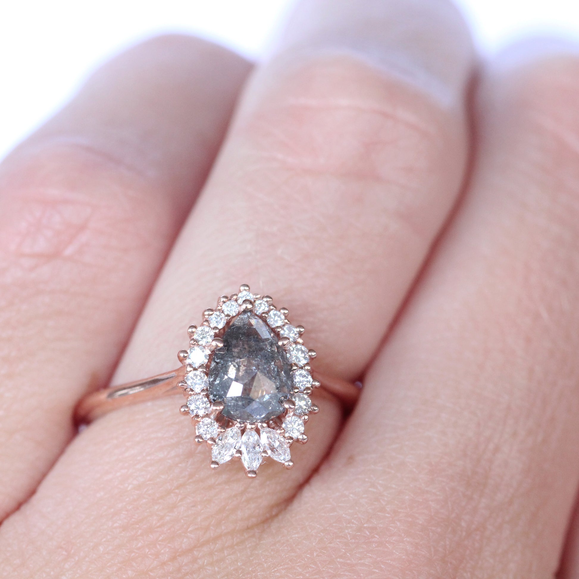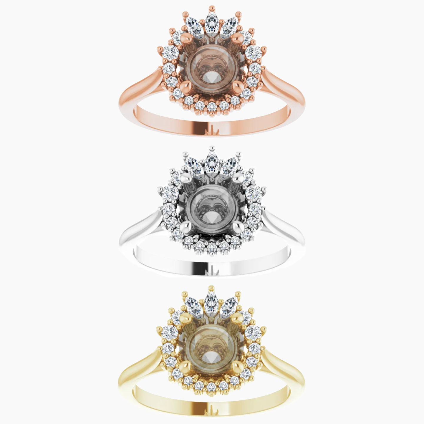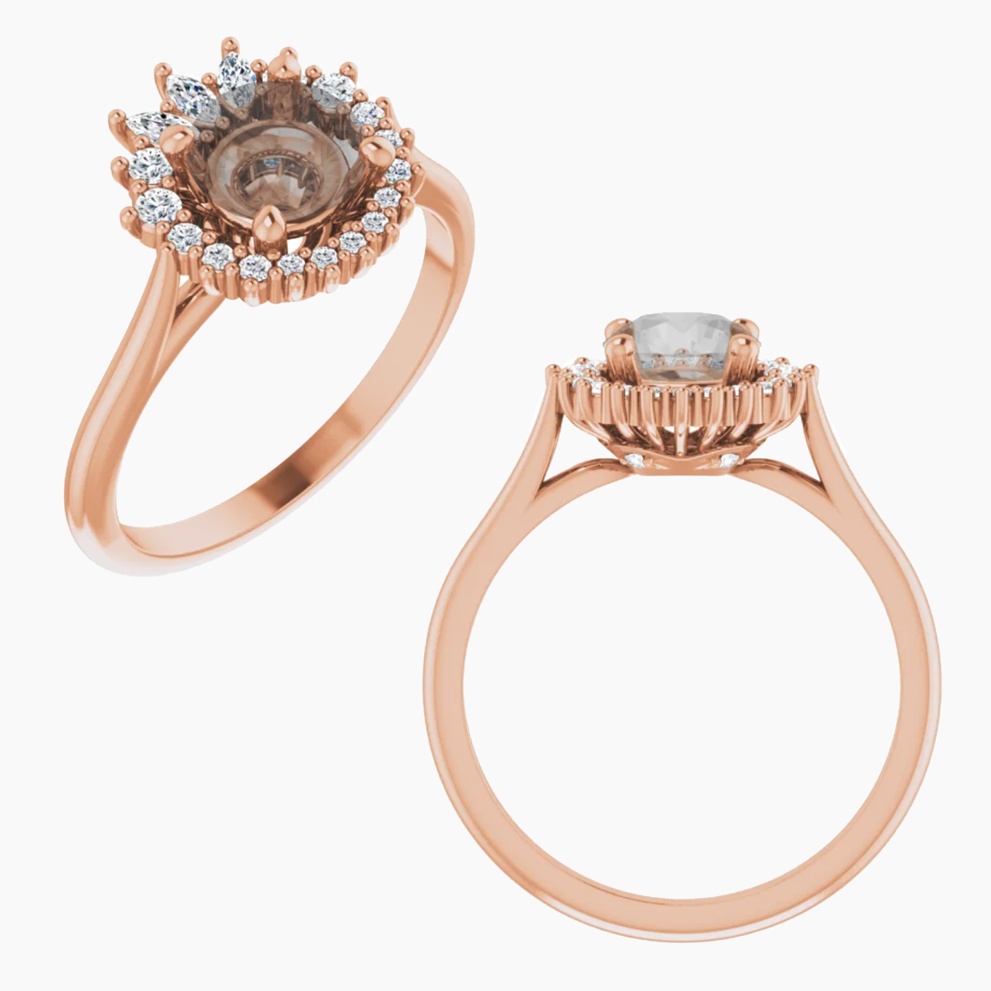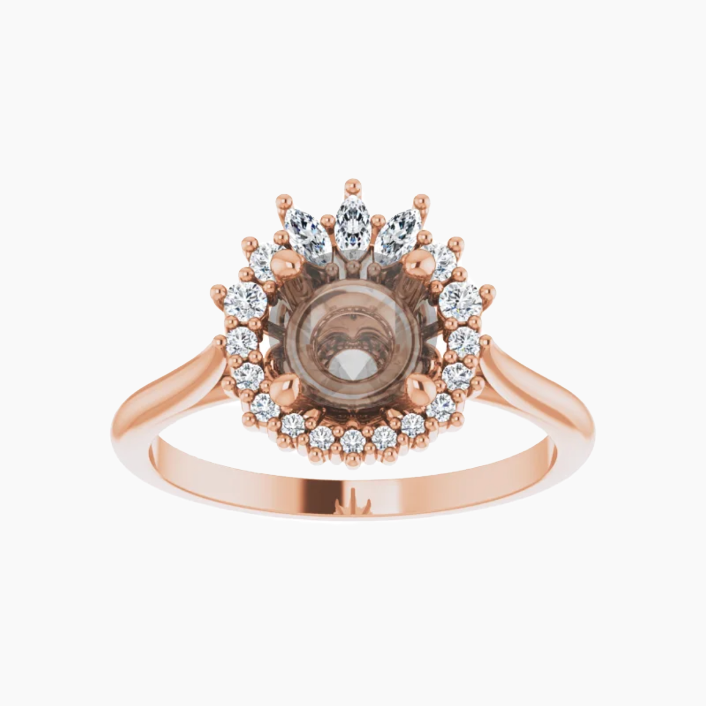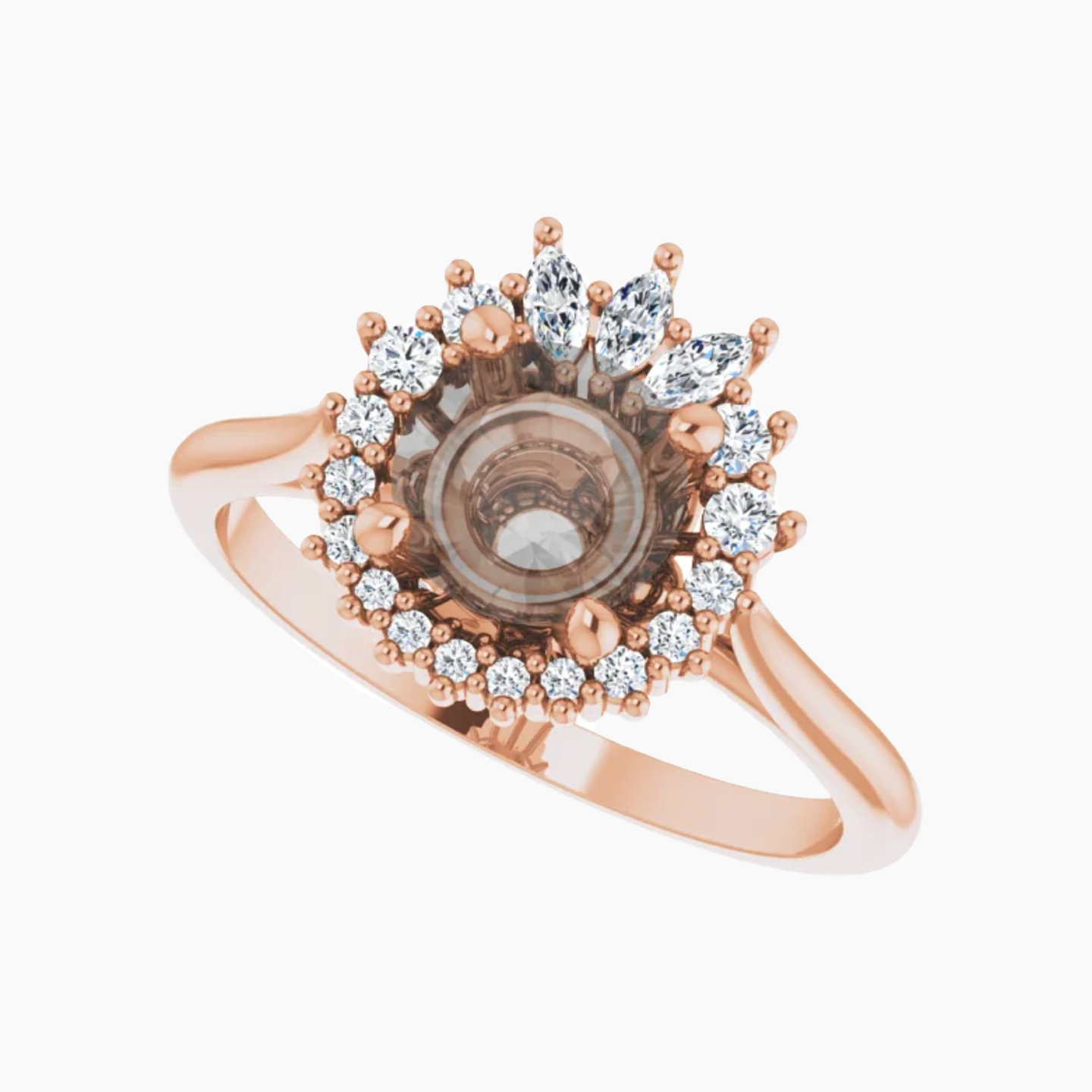 - This setting features hidden stones in the basket, as well as a unique halo that has round stones that increase in size as they approach a cluster of marquise stones for a unique, captivating look.