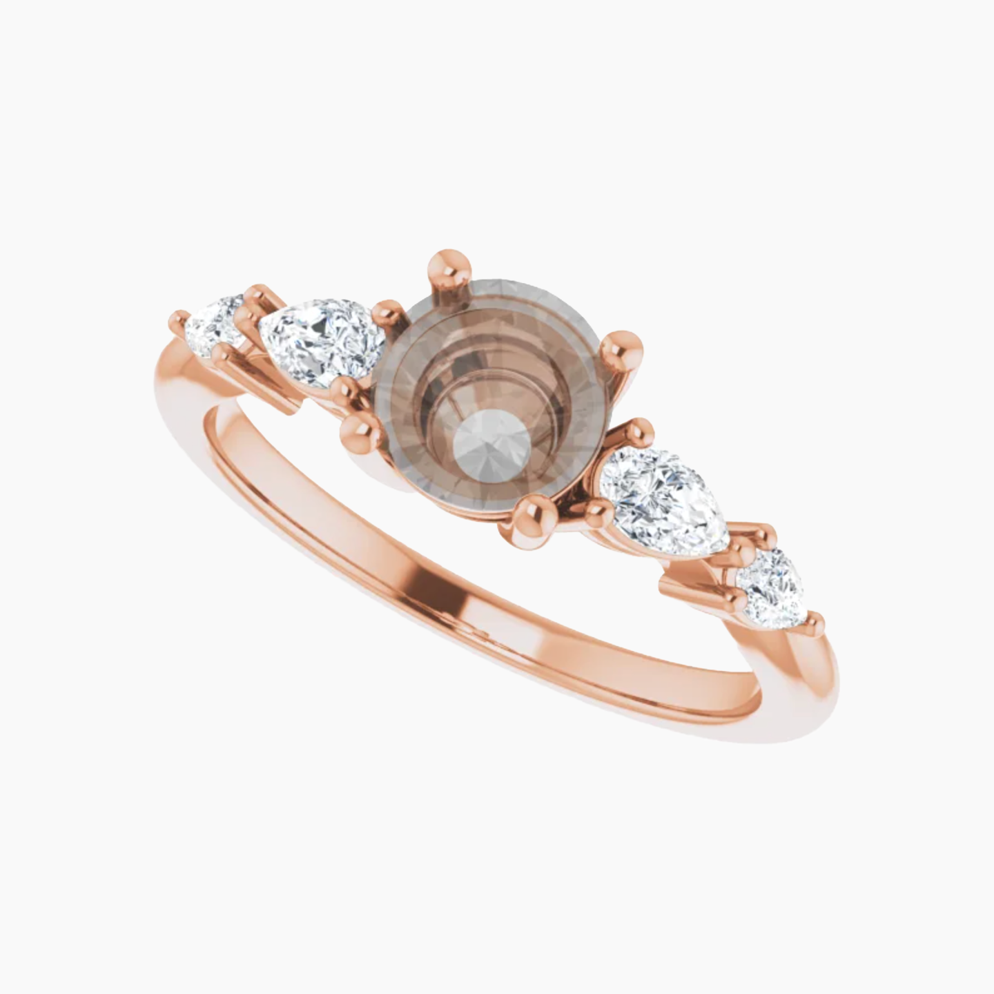 - Accent stones include two 4x2.5mm SI2-SI3 pear diamonds and two 3x2mm SI1 pear diamonds.