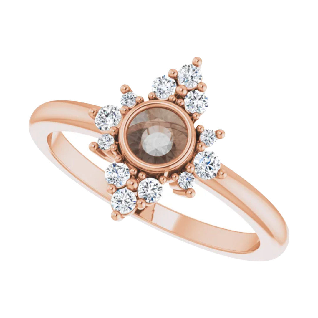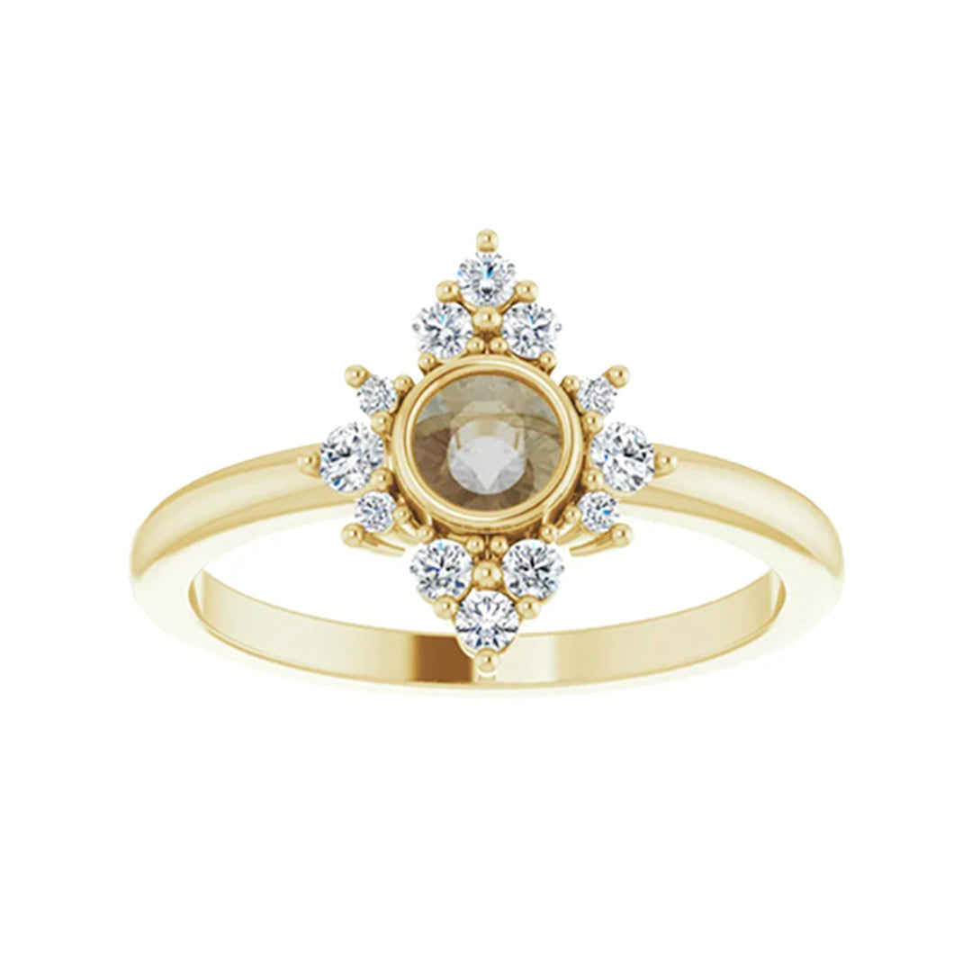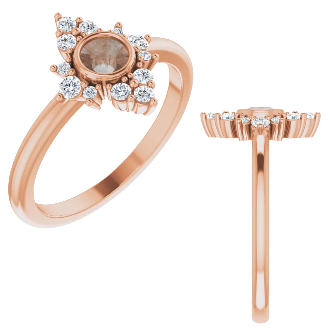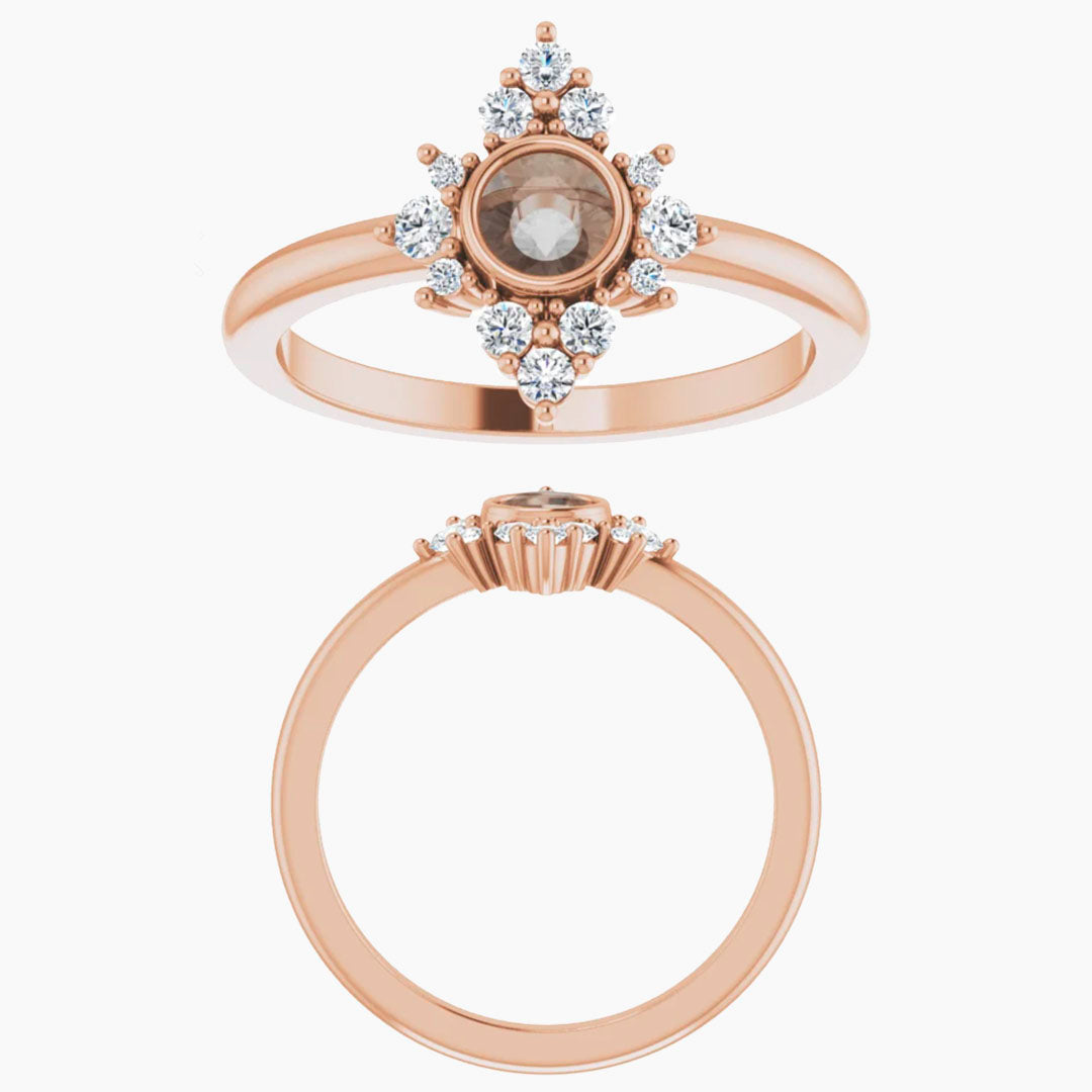 • Gorgeous bezel setting with a sparkling partial halo of stones. Sits flat on your finger and is not raised at all.