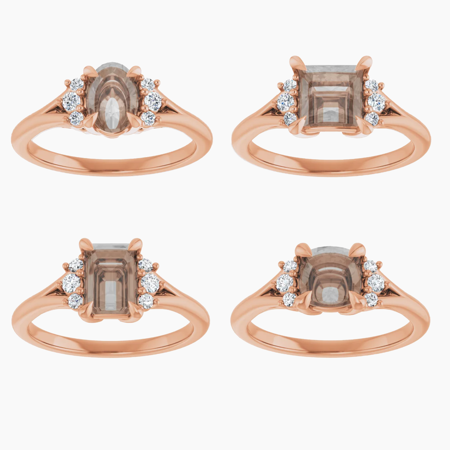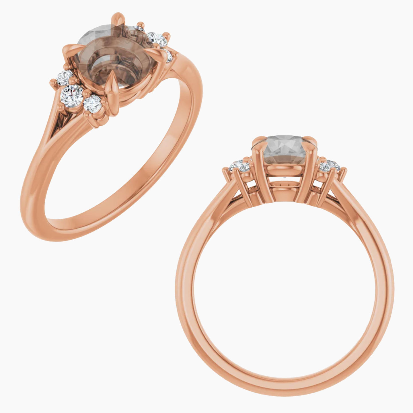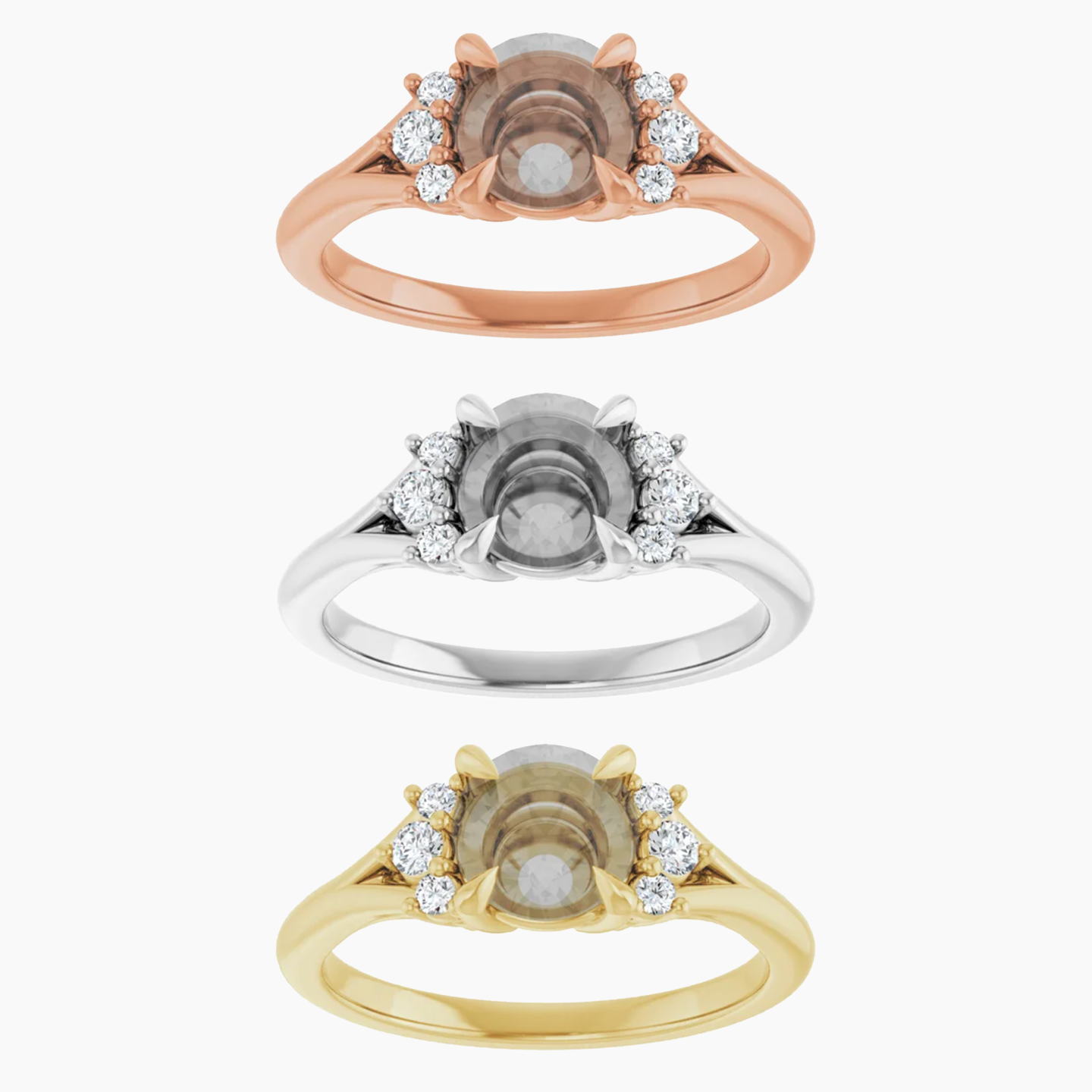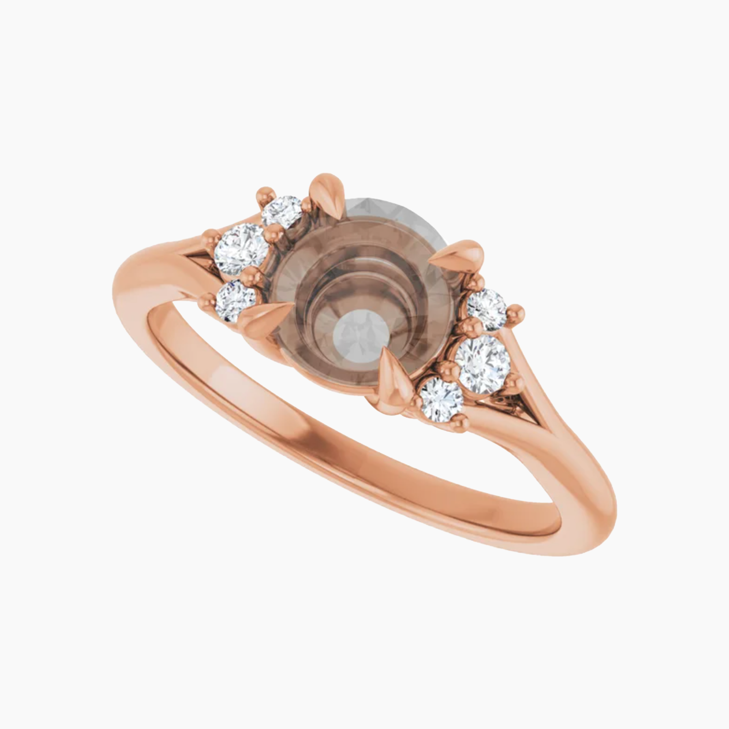 - This setting features a mix of round accent stones with a split shank detail.