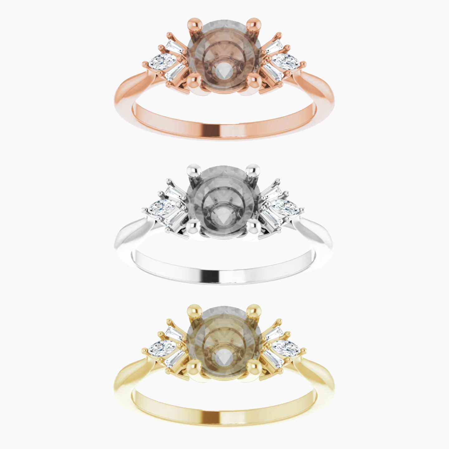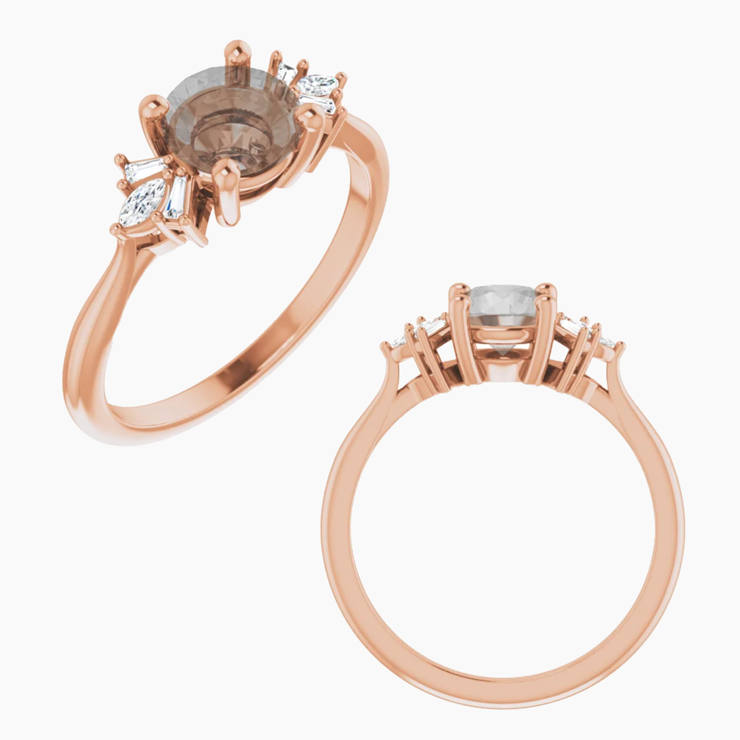 - Accent stones include two 3 x 1.5mm SI2-SI3 marquises diamonds and four 2 x 1 x .5mm SI2-SI3 tapered baguette diamonds.