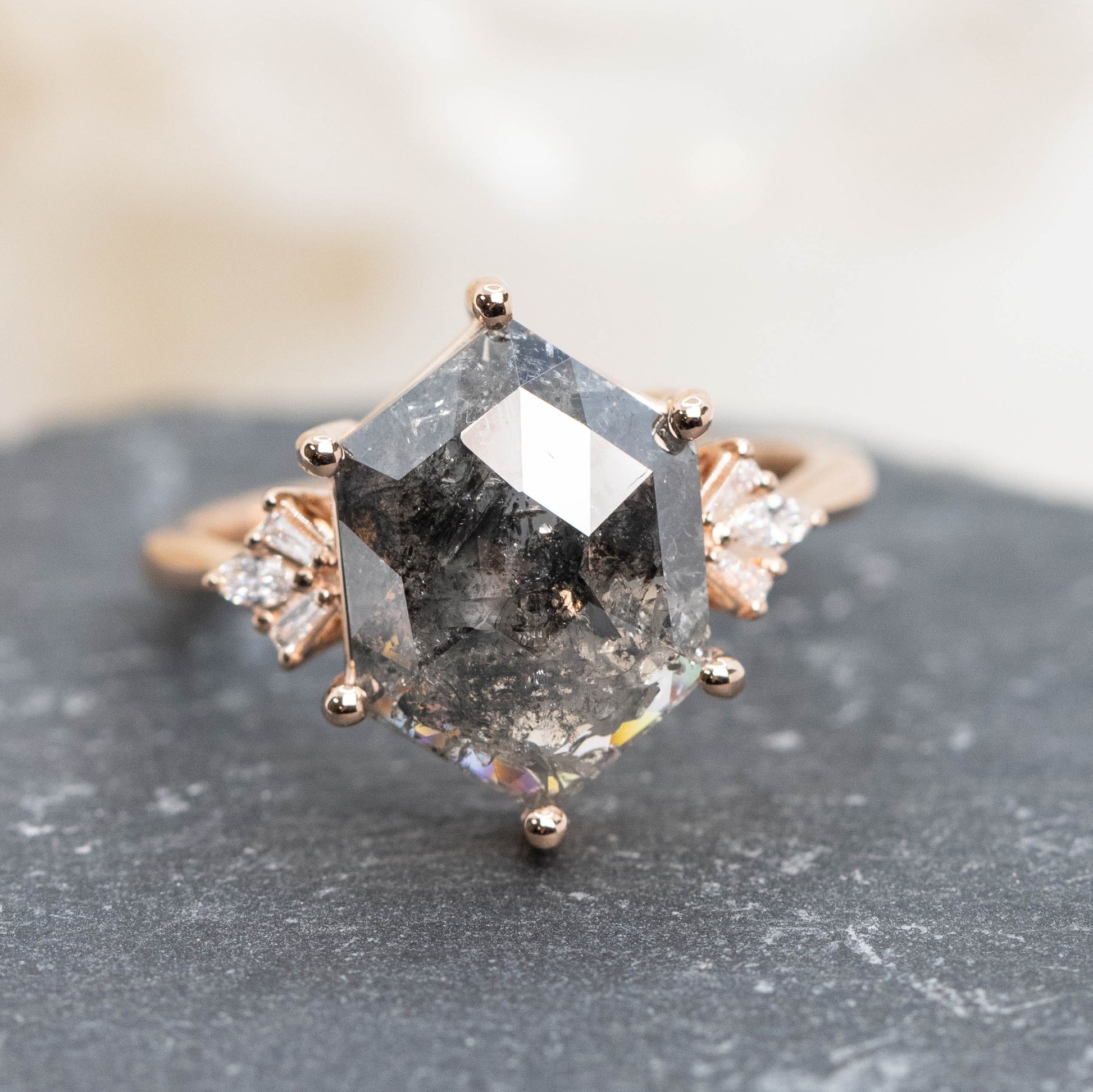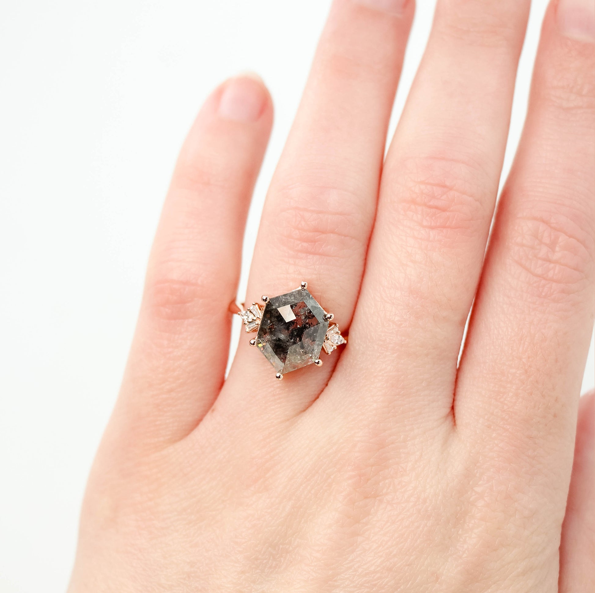 We often work with amazing and stunning natural diamonds that we call Celestial diamonds, which the industry sometimes calls salt and pepper diamonds, or galaxy diamonds. We worked with these diamonds before they were somewhat normal on the scene. Everything about the diamond is a real diamond, and possibly even more real than your "standard" diamond that may have been heat treated or had its inclusions microscopically removed/filled. The perfectly imperfect stones are each unique, and since they are not your standard mass-purchased stone in our industry, it isn't worth the effort for "bad guys" to make fakes that look like these.