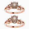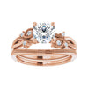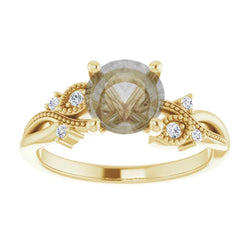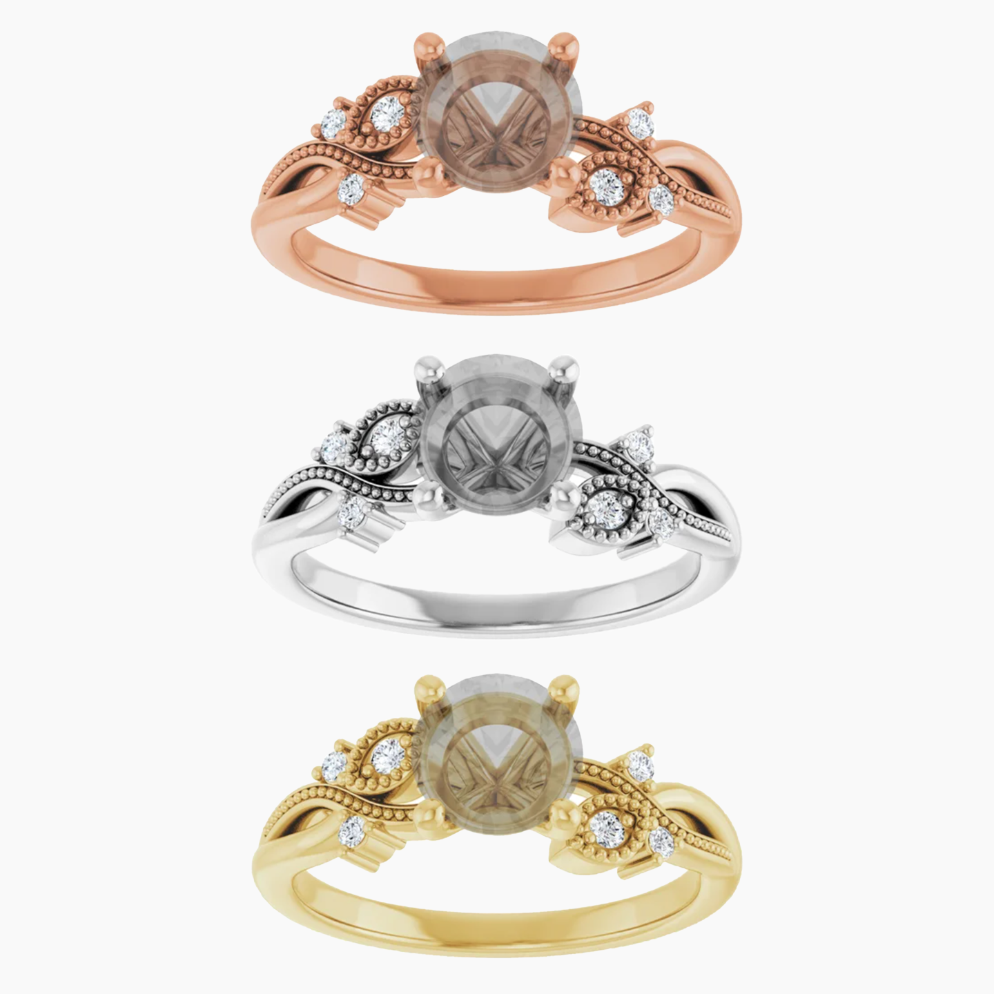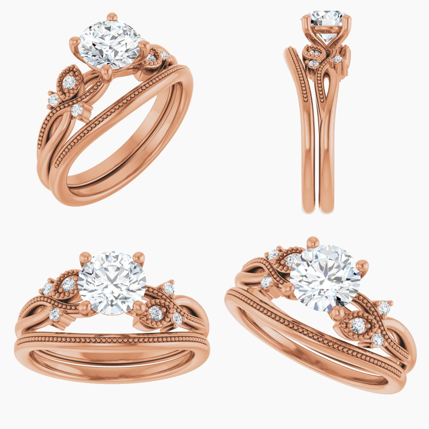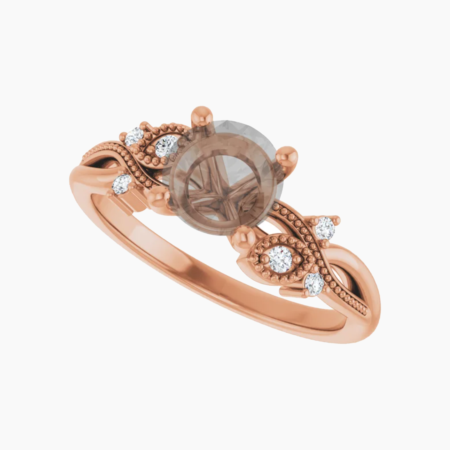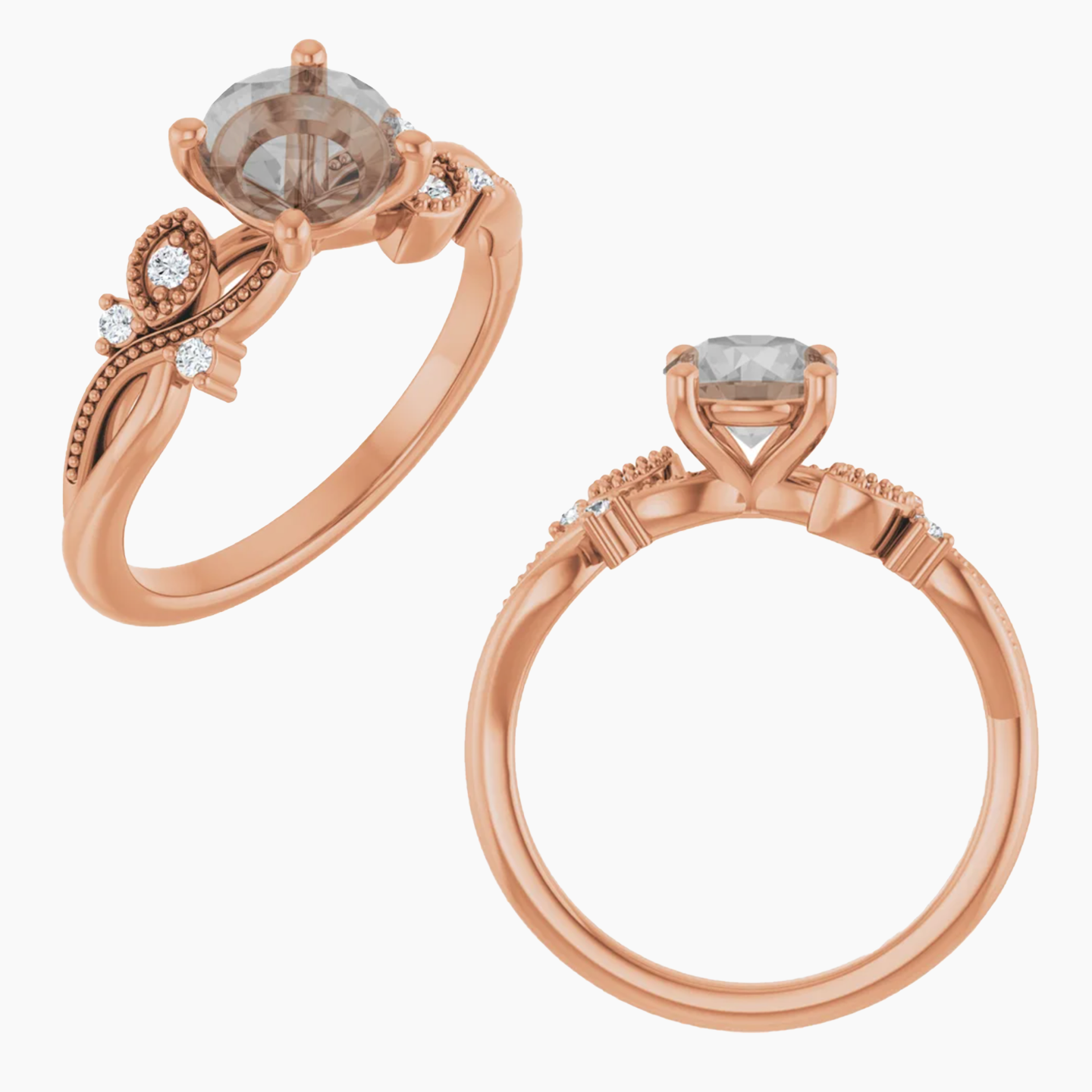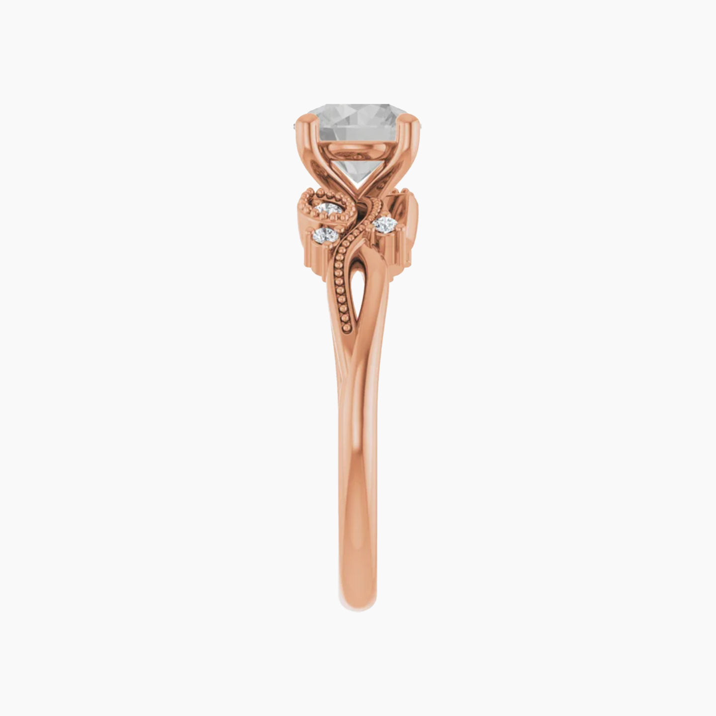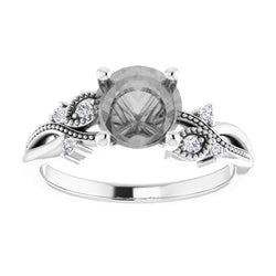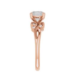 - Nature inspired setting with milgrain and stone accents going along the band on either side of the center stone. The design resembles a vine and makes up roughly half of the band, leaving the rest plain.
