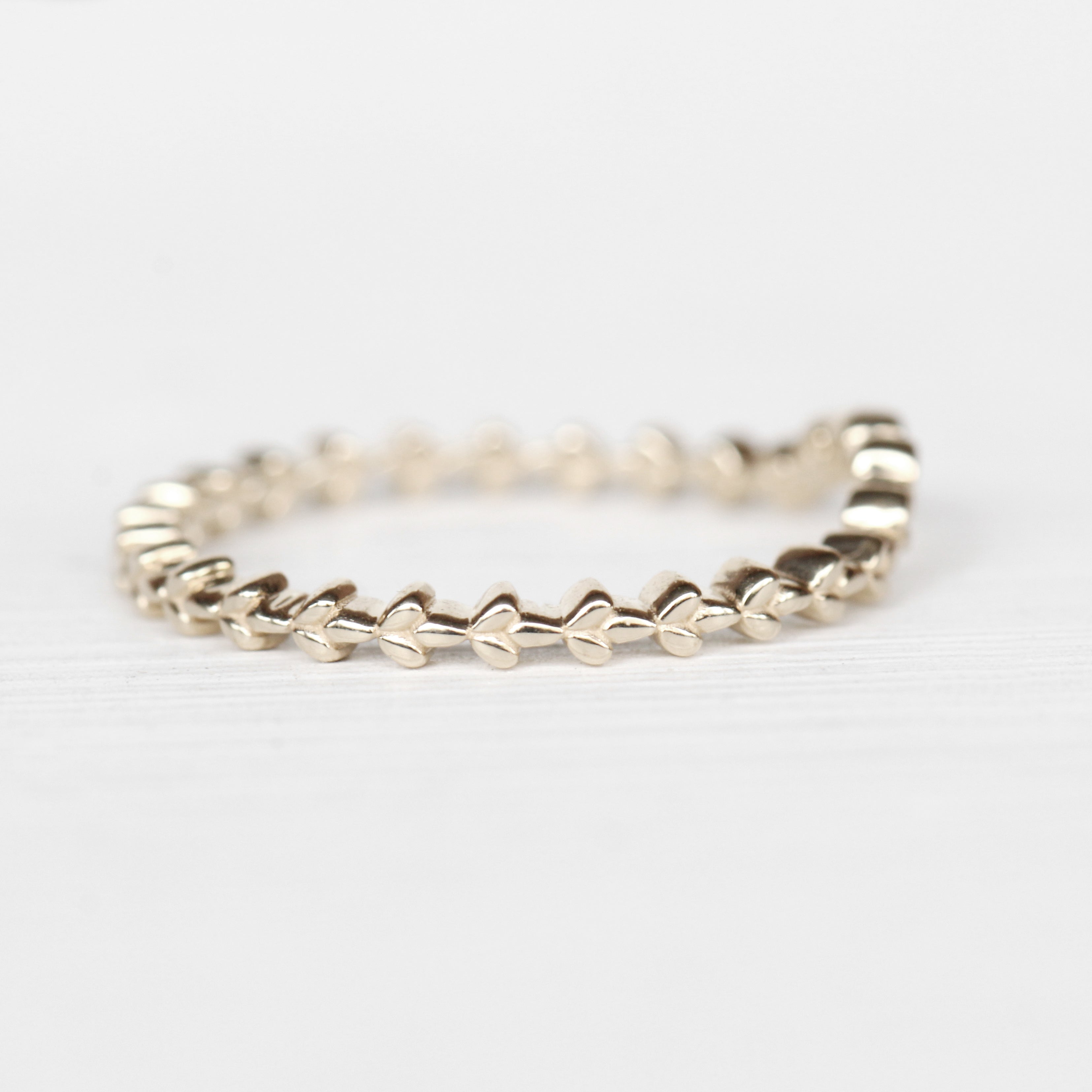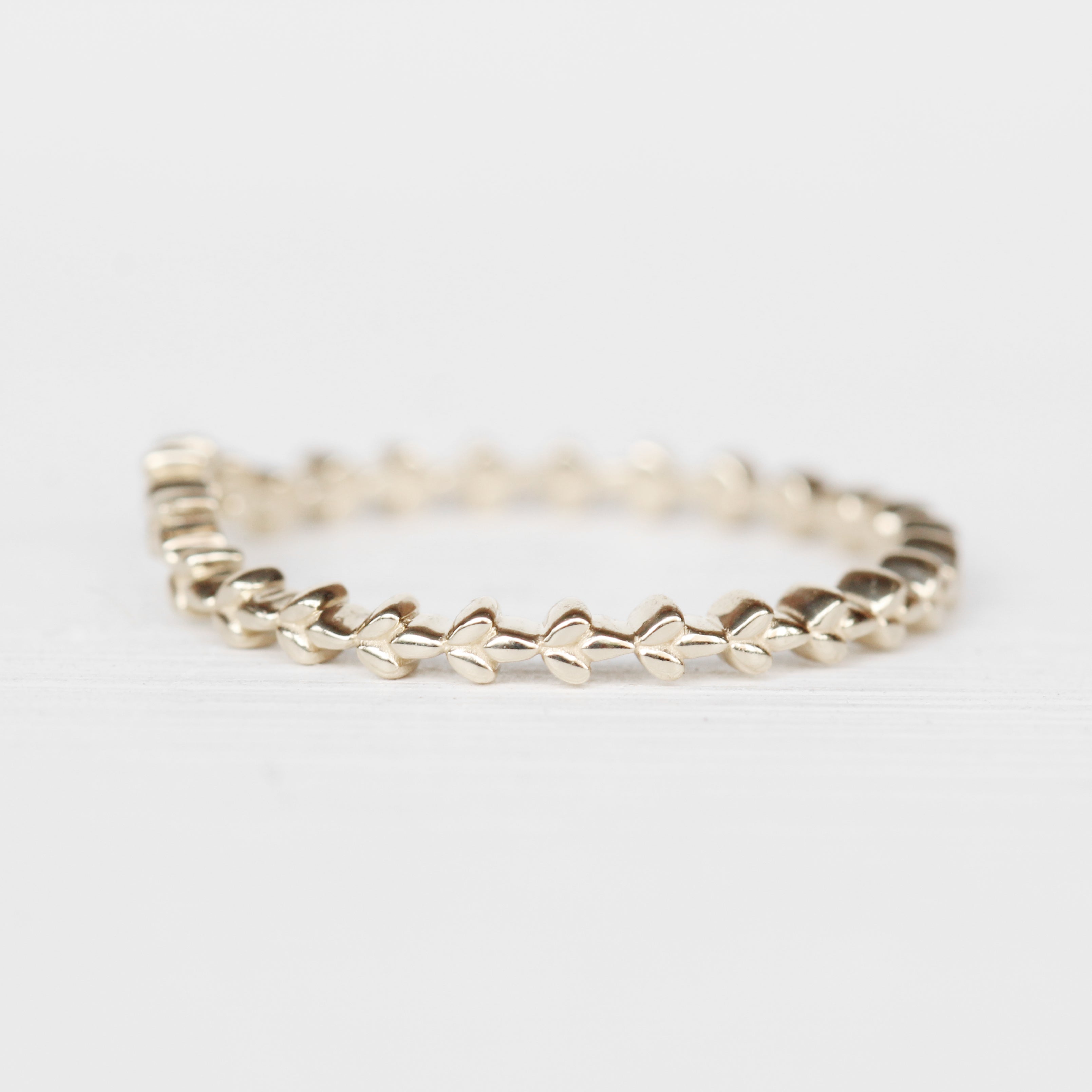 - This band features a delicate leaf design that adds a natural accent to other rings.