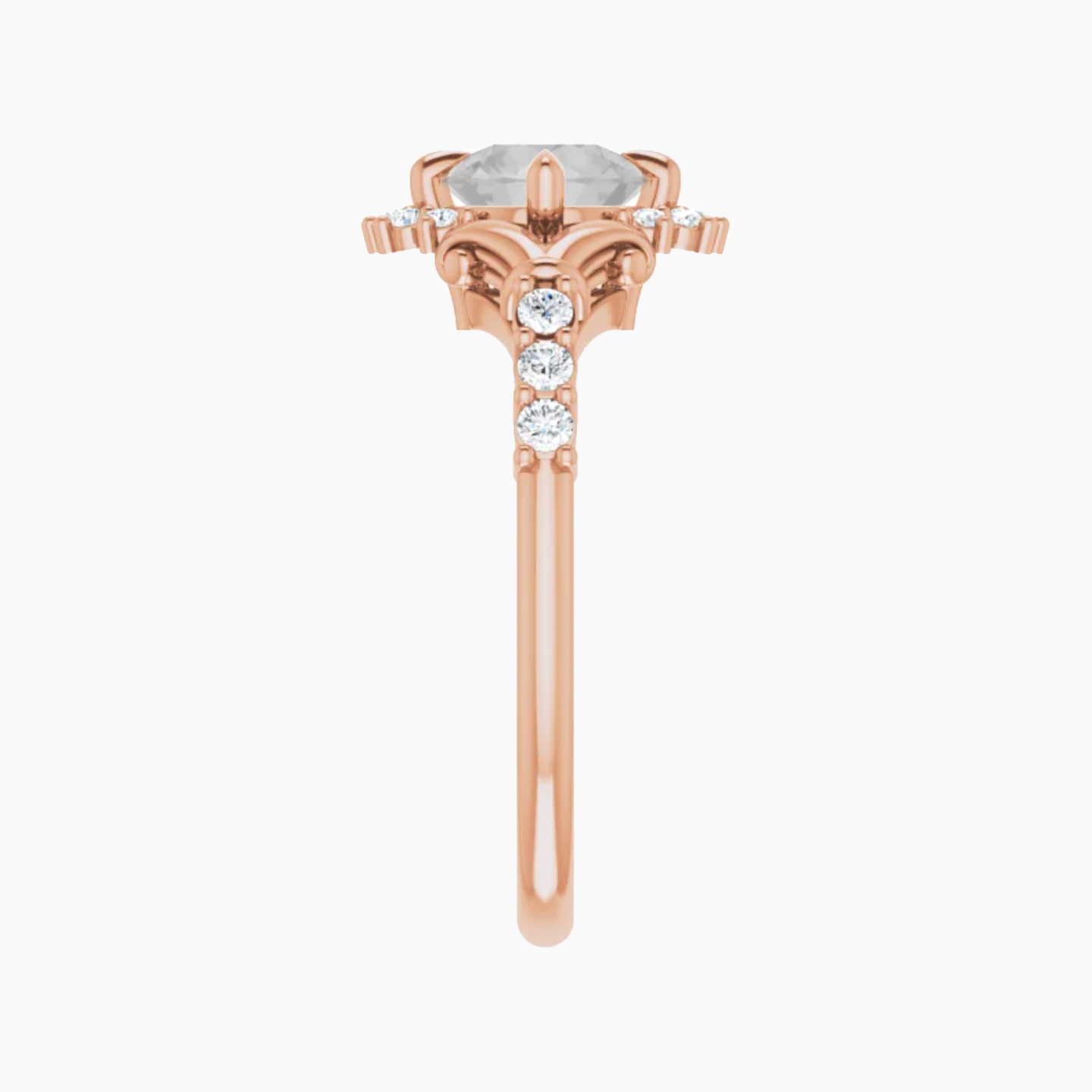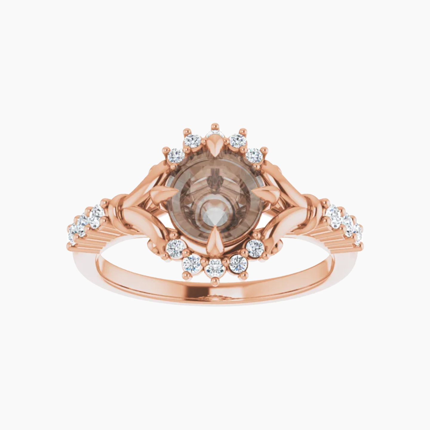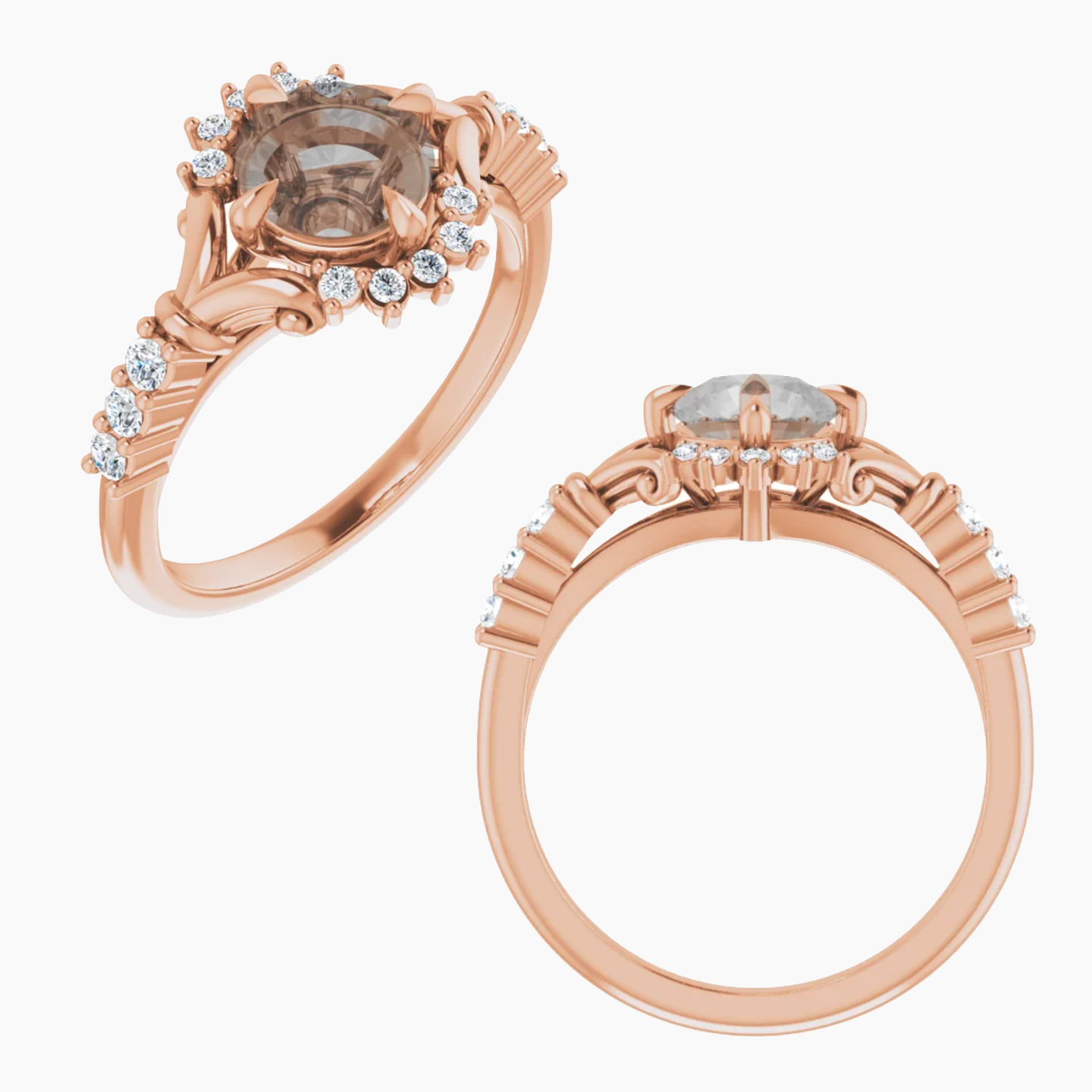 - An ornate halo, metal work details, and accent stones along the band combine to create a unique and detailed setting.