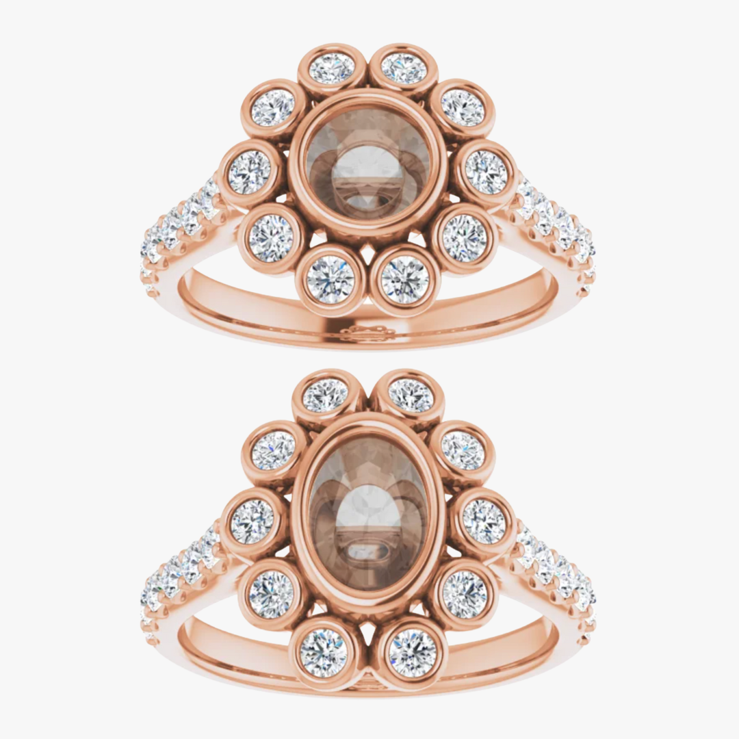 - Antique, bezel style setting with both a halo of bezel set stones, as well as stones down each side of the ring.