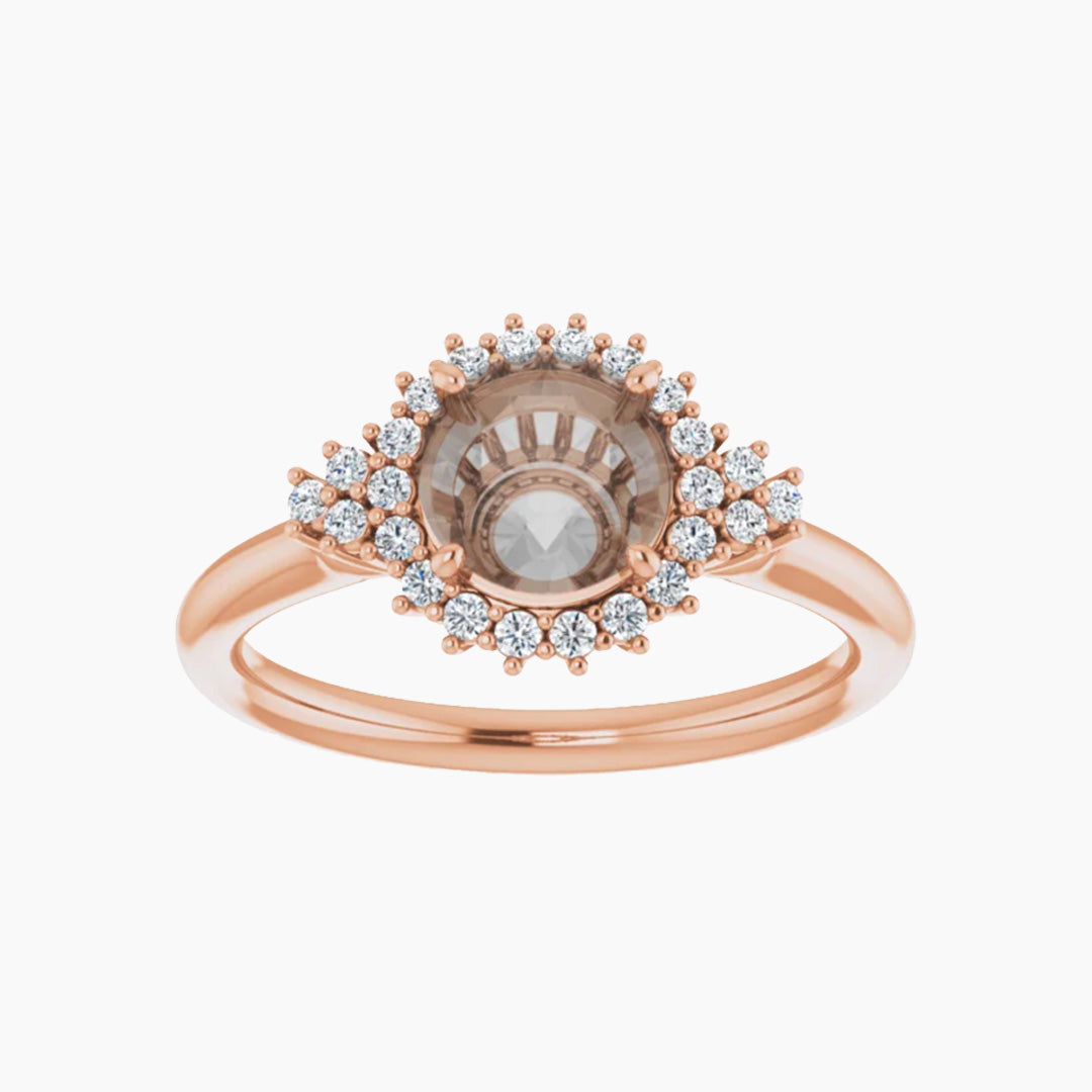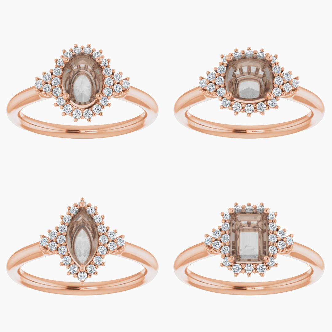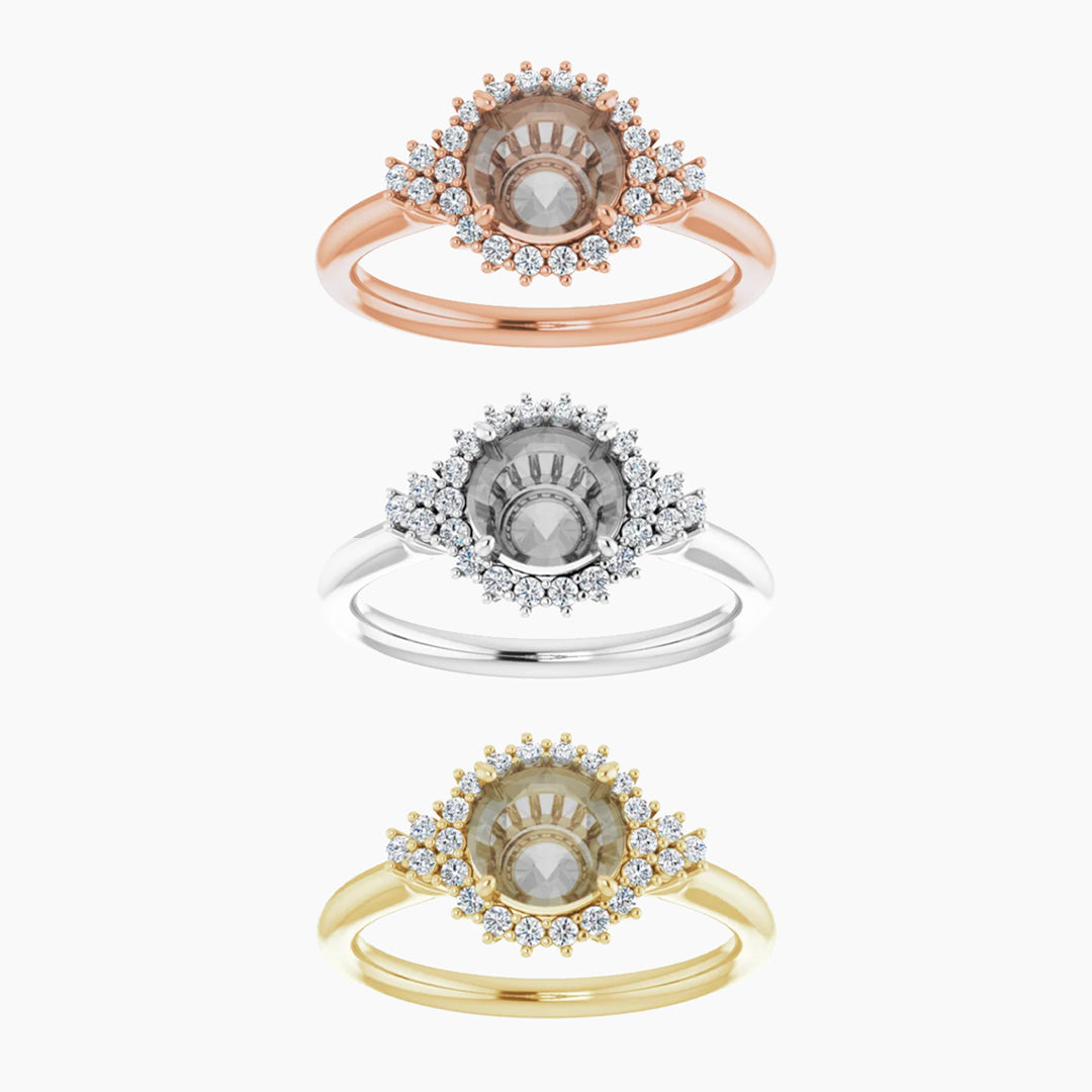 • A halo around the center stone with additional accent stones near the band give this setting lots of extra sparkle.