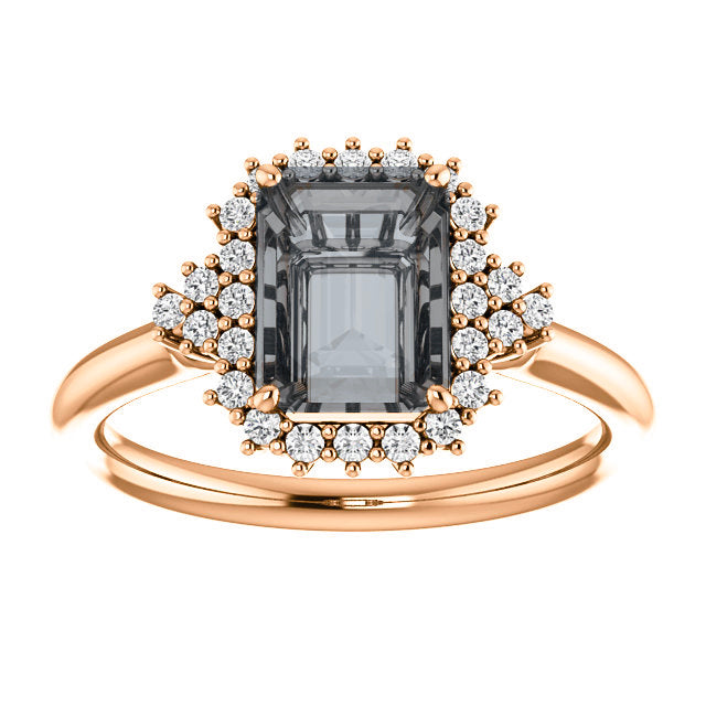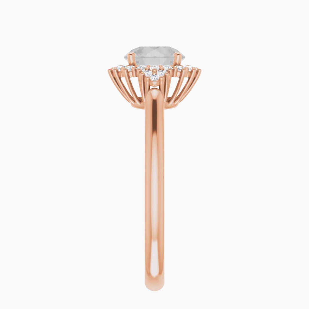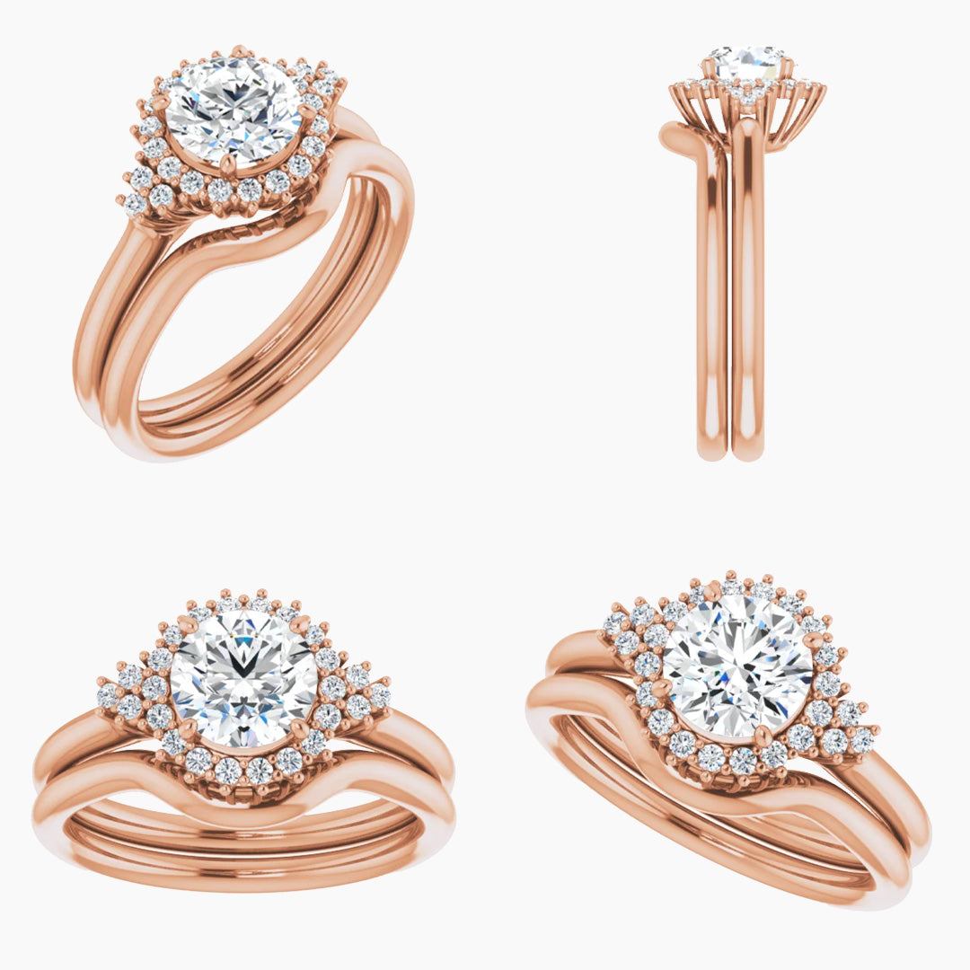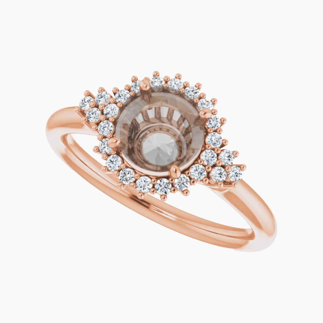 • A halo around the center stone with additional accent stones near the band give this setting lots of extra sparkle.