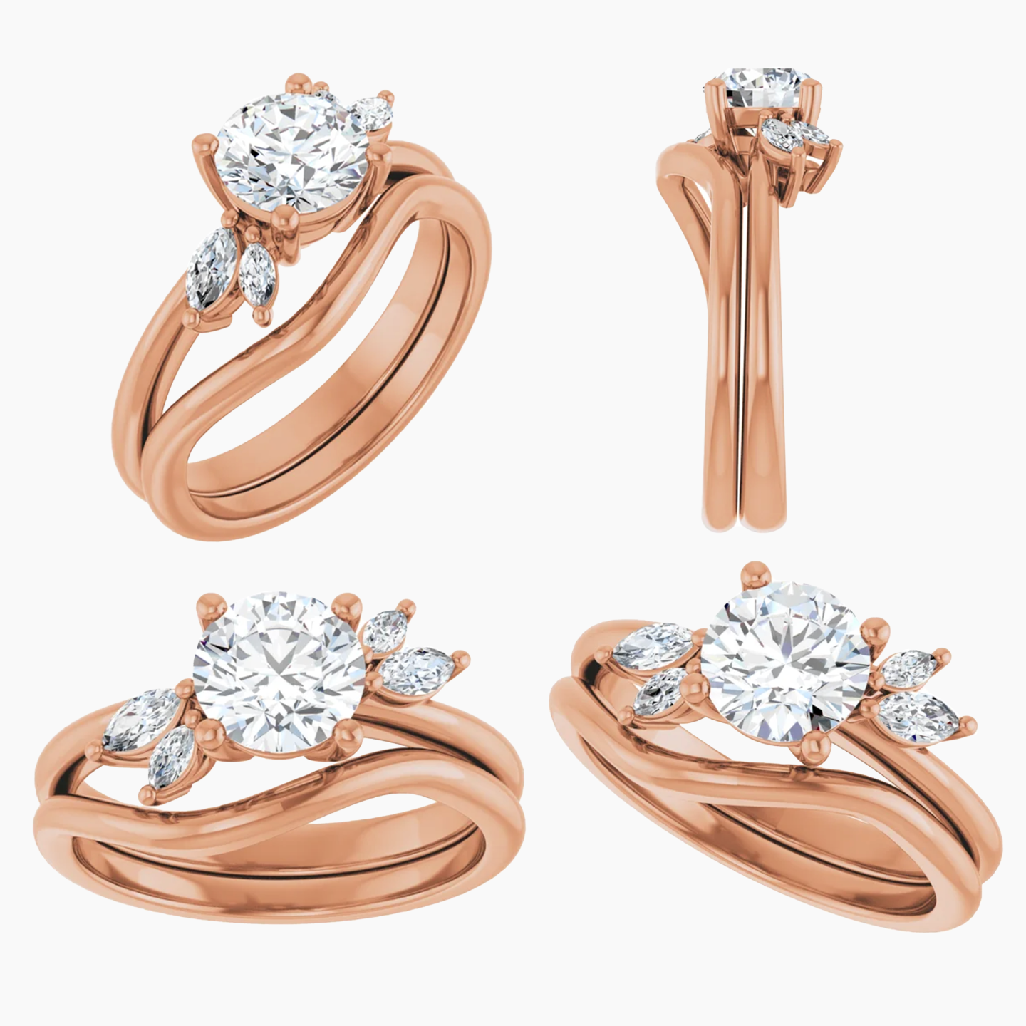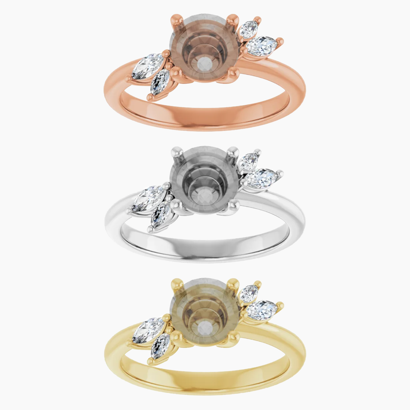 • Slightly asymmetric marquise accent stones highlight the center stone in a one of a kind way.