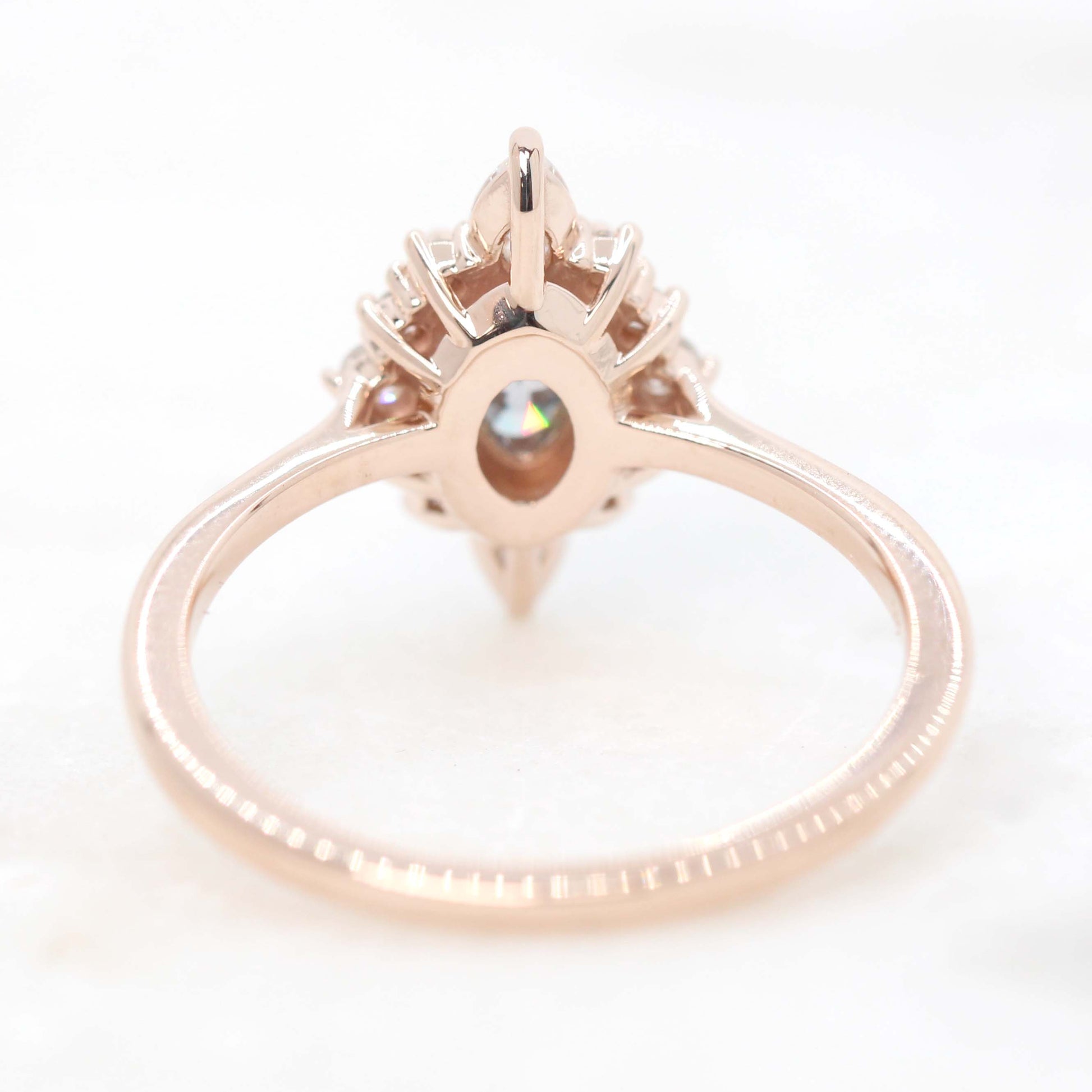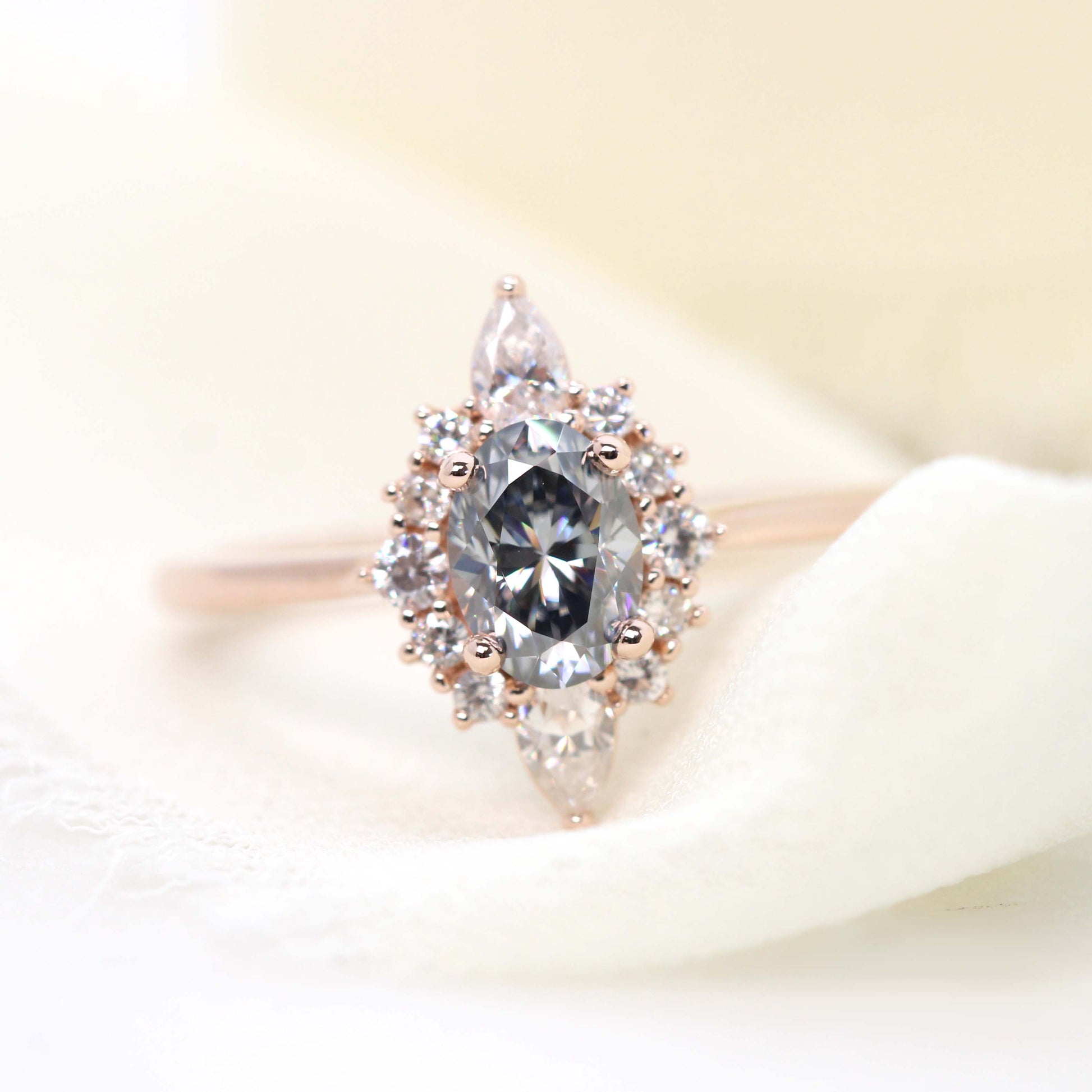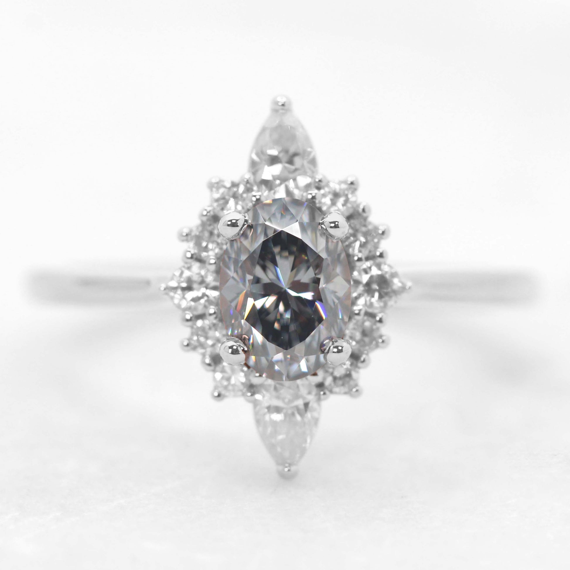 - Accent stones: Halo comprised of four 1.5mm and two 2mm round white moissanites and two 4mm x 2.5mm white pear moissanites.
