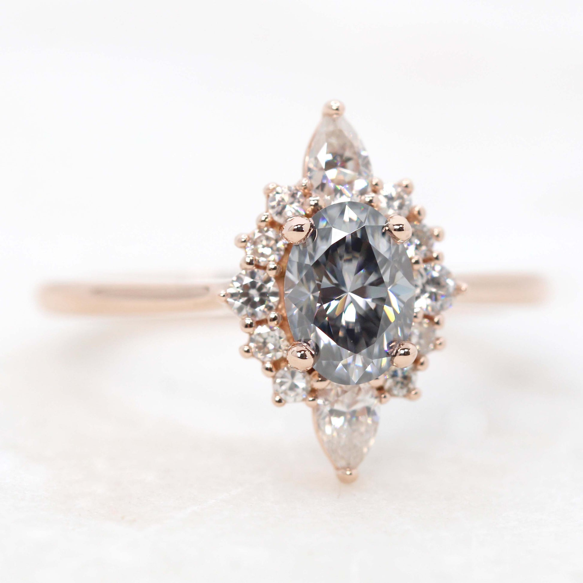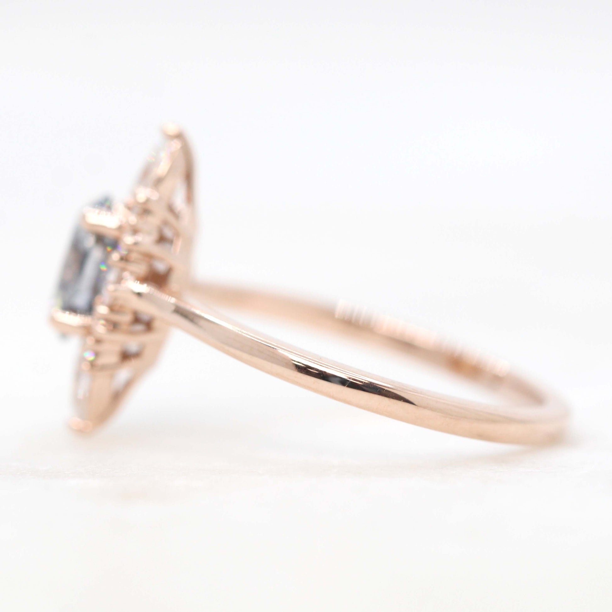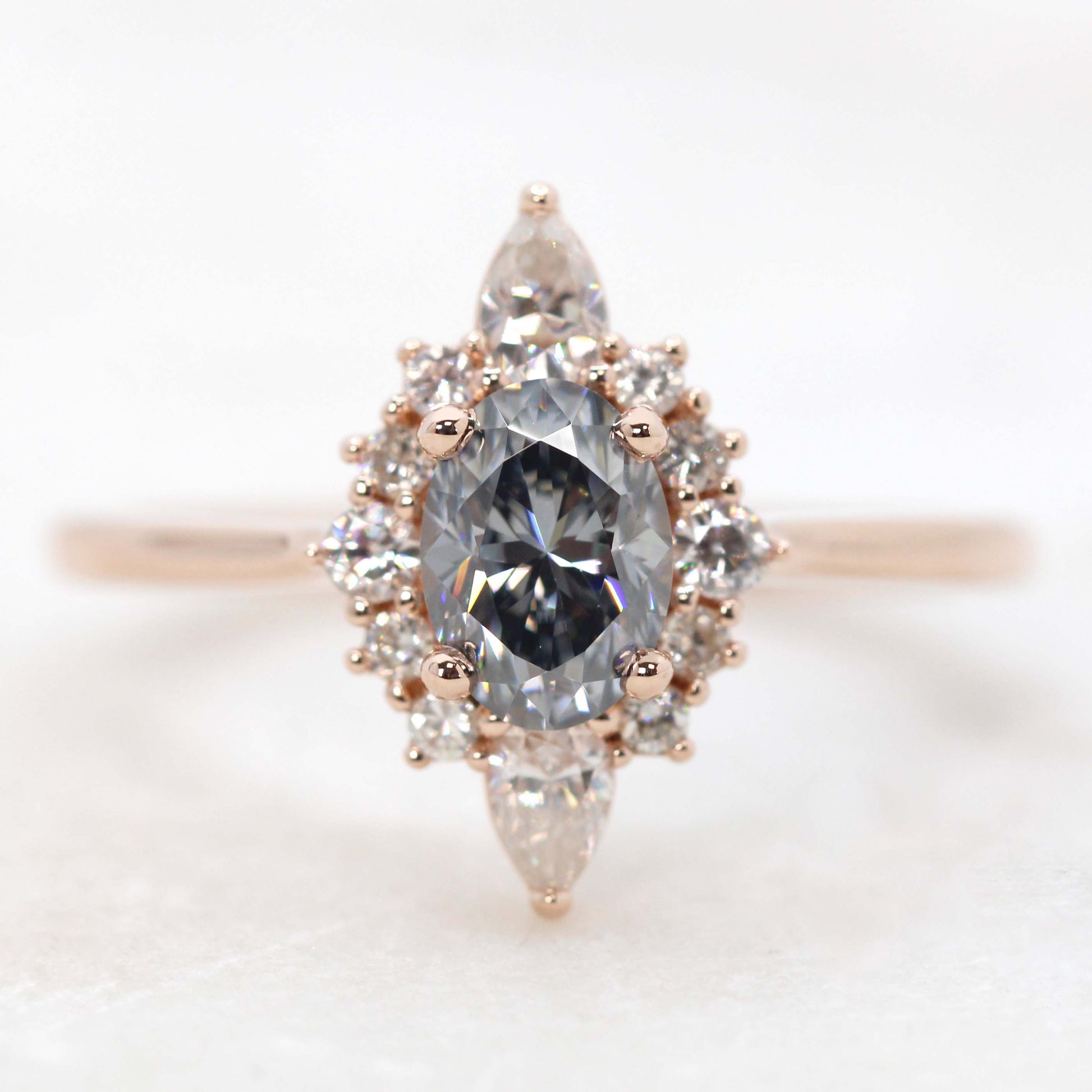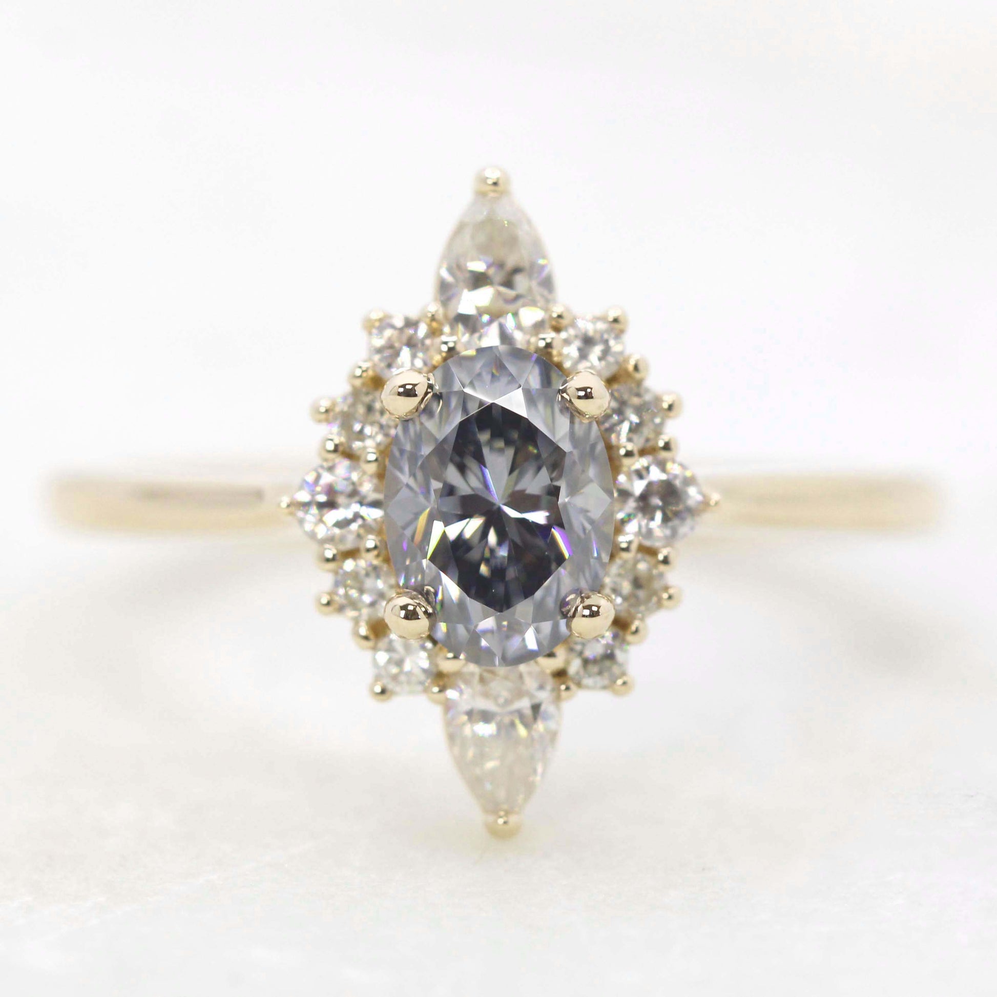 - Accent stones: Halo comprised of four 1.5mm and two 2mm round white moissanites and two 4mm x 2.5mm white pear moissanites.