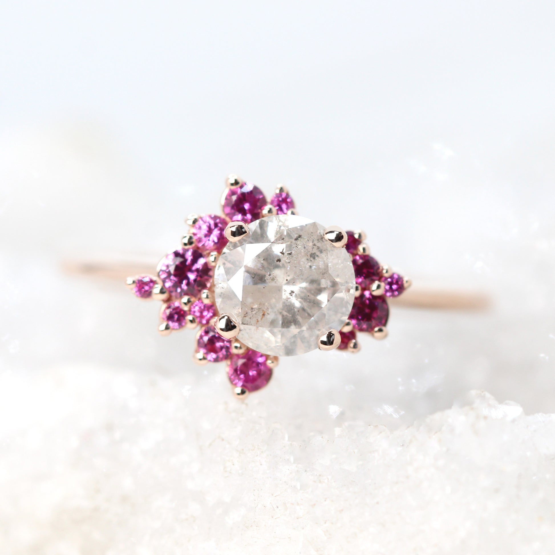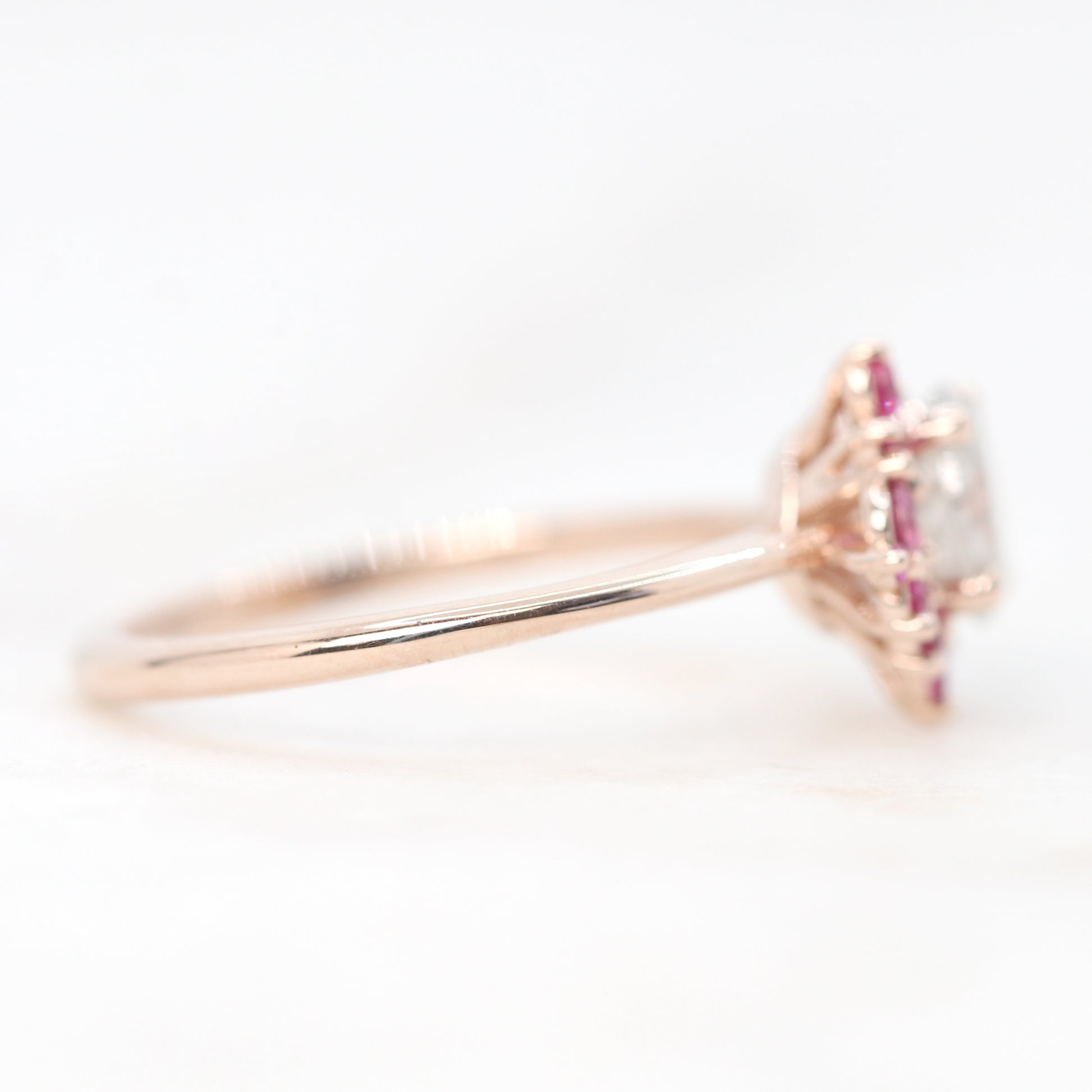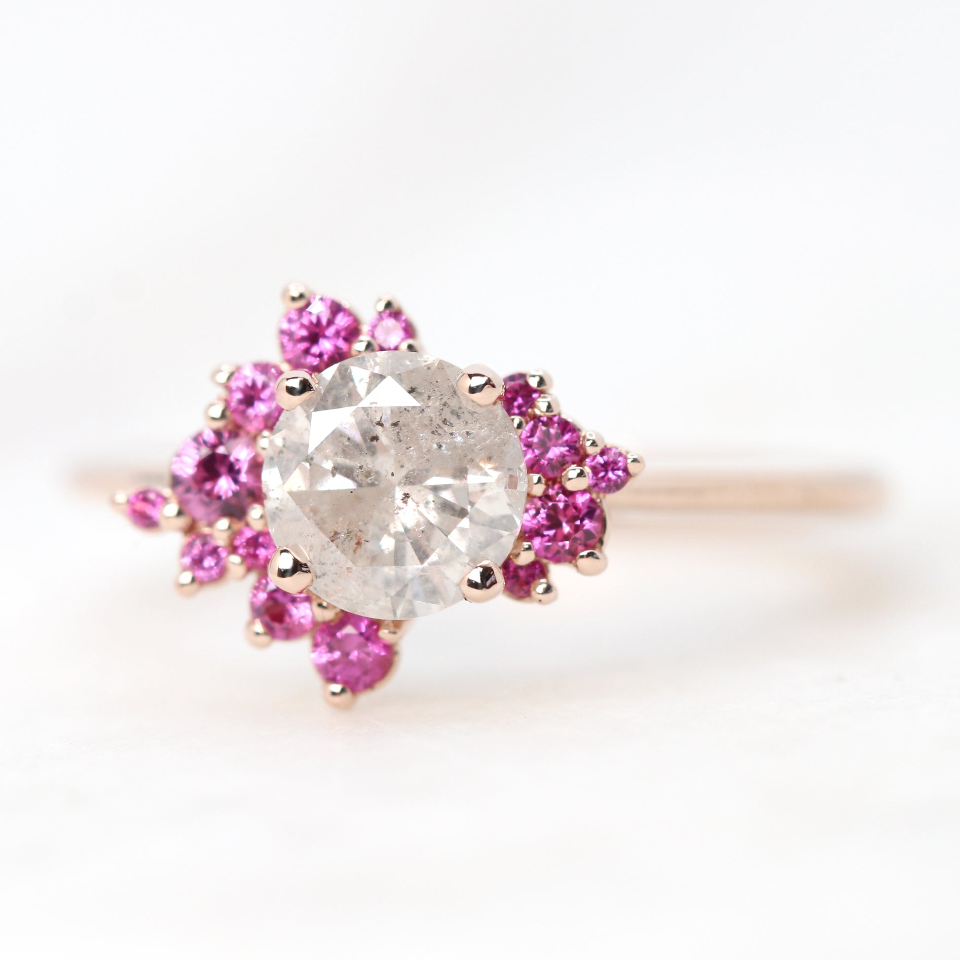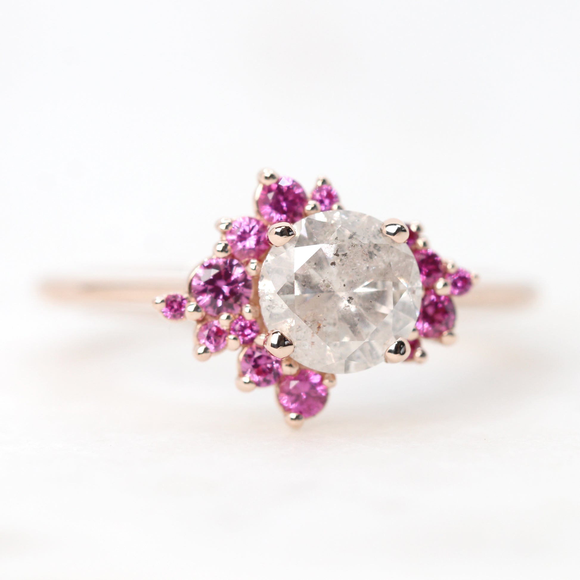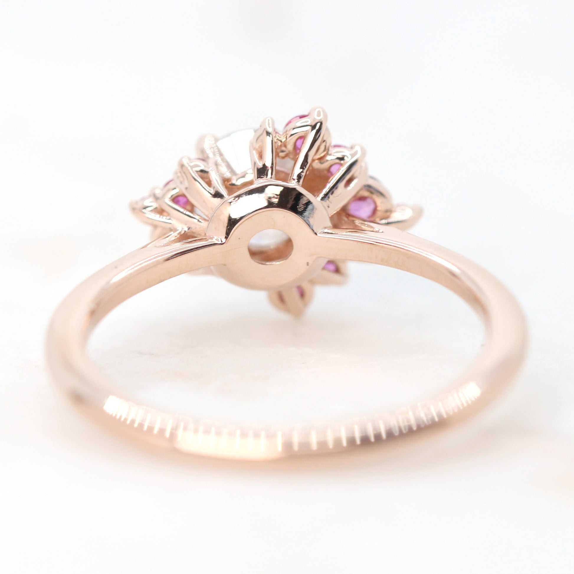 - Accent stones: Two asymmetrical clusters sit on either side of the center stone to form an organic halo of pink sapphires. The accents range in diameter from 0.8mm - 2.5mm