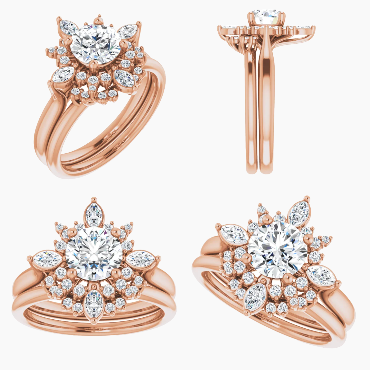 - An ornate halo design with a mix of round and marquise accent stones.
