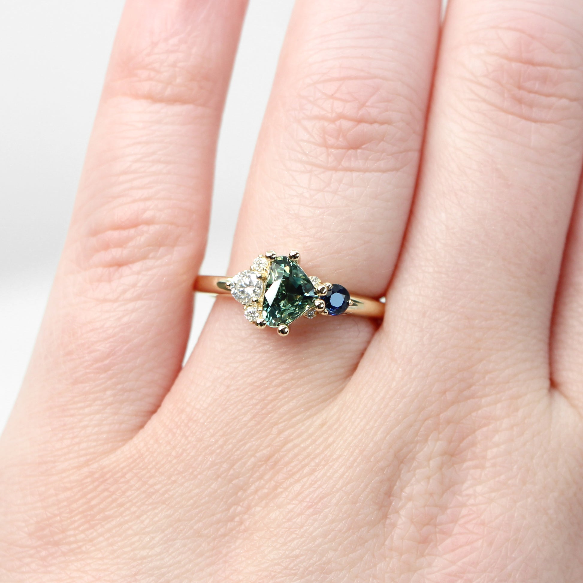 Project: Custom Serena Ring with a 1 Carat Teal Blue Trillion Sapphire and Asymmetrical Accent Diamonds in 14k