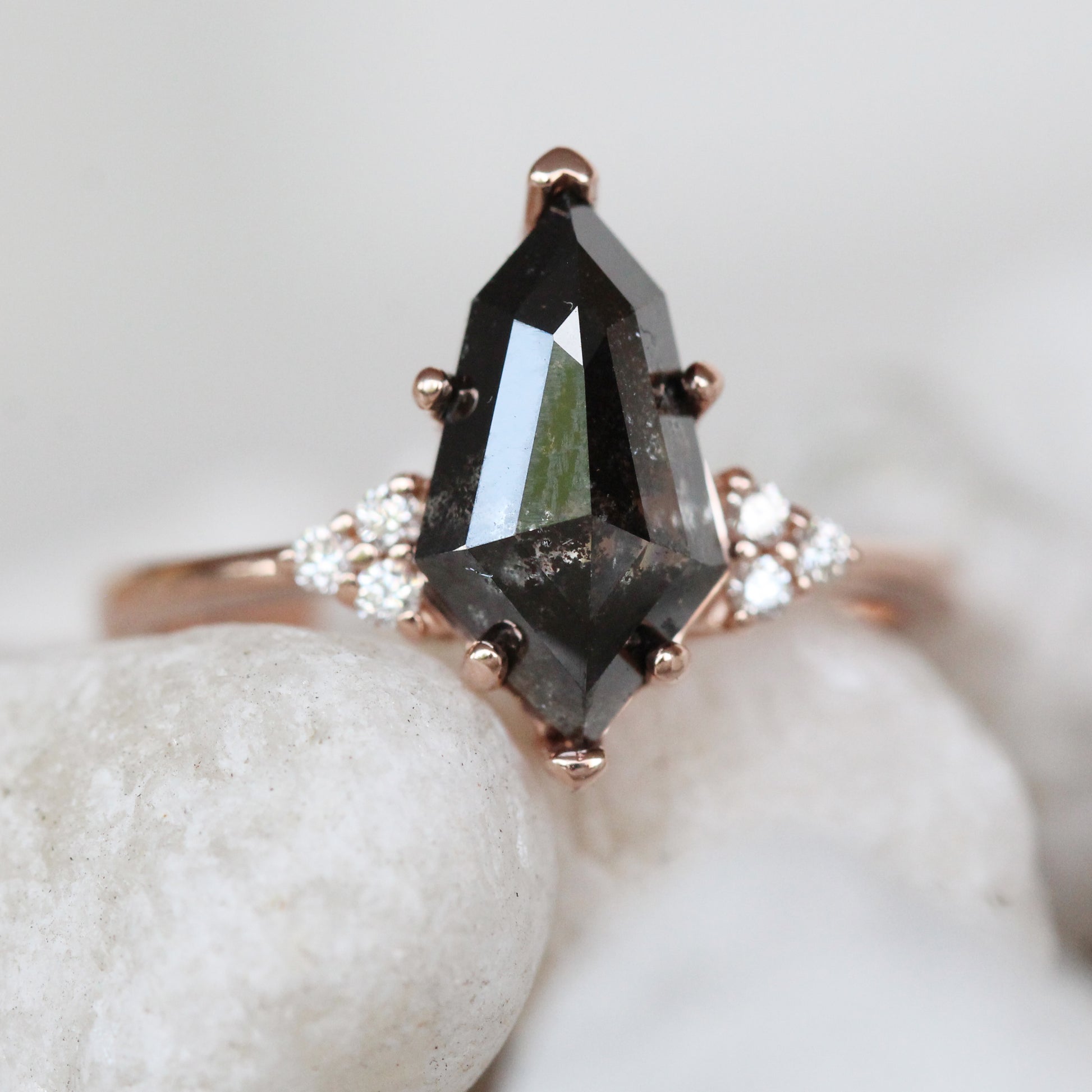 Project: Custom Imogene ring with 2 Carat Geometric Shield Cut Black Gray Salt and Pepper Diamond and White Accent Diamonds in 14k