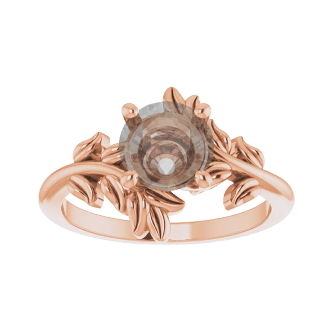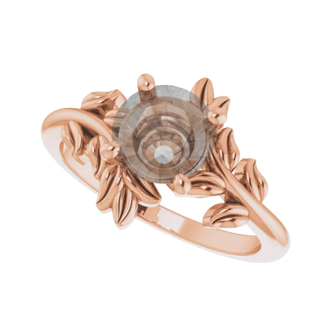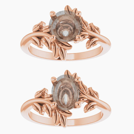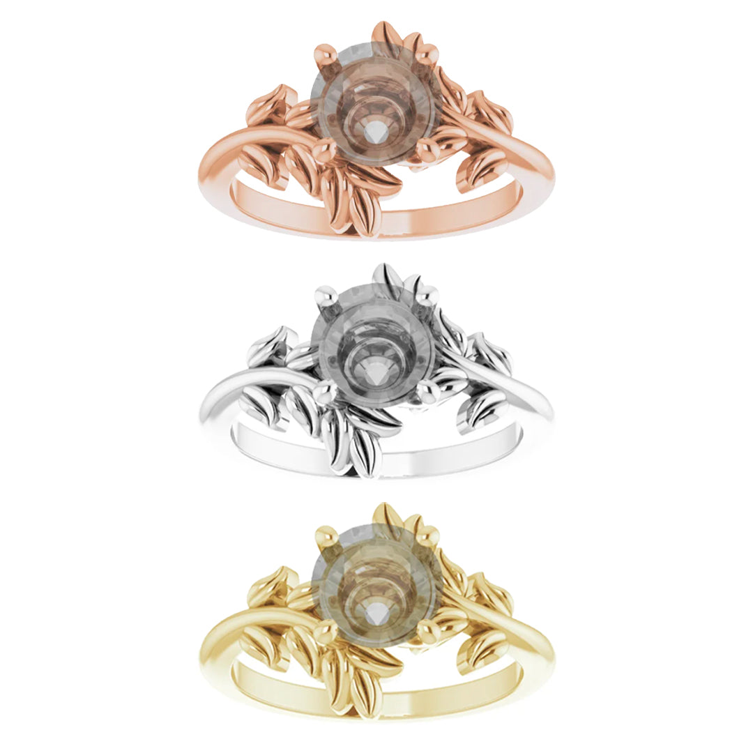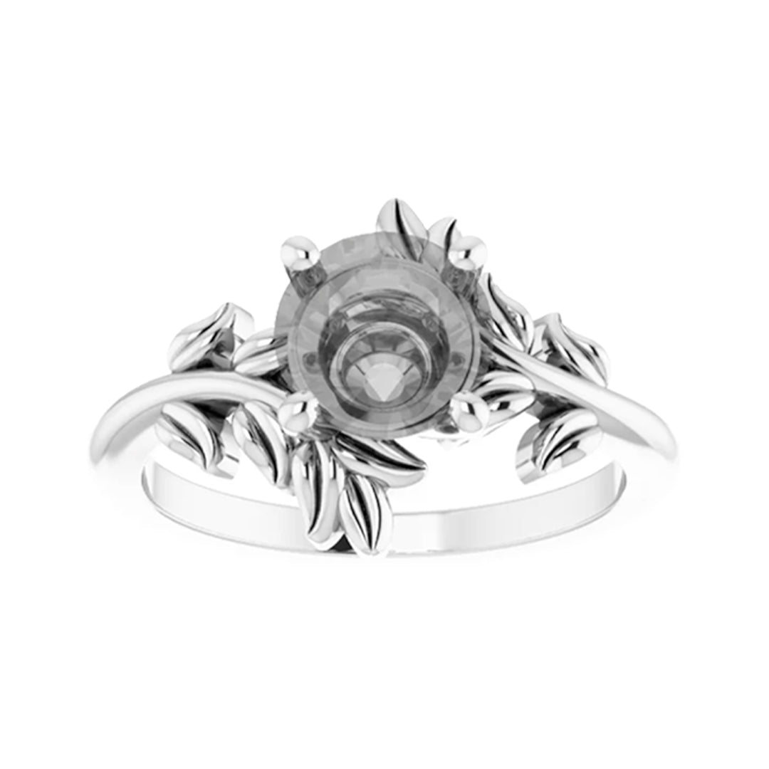 - This all metal setting has a whimsical leafy design that is perfect for the nature lovers. The metal leaves surround the center stone, and the two branches mirror one another asymmetrically.