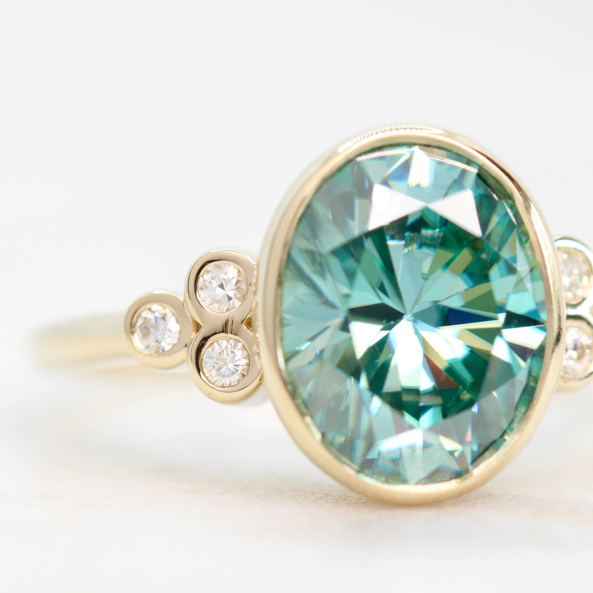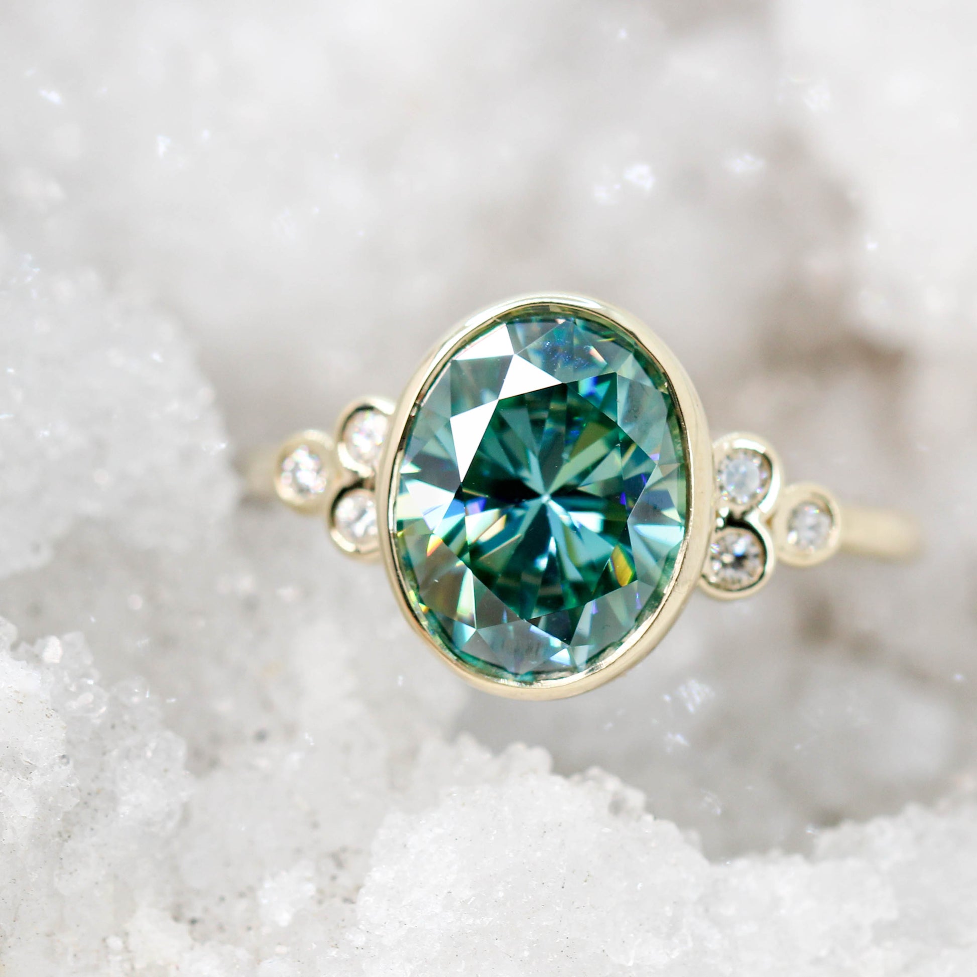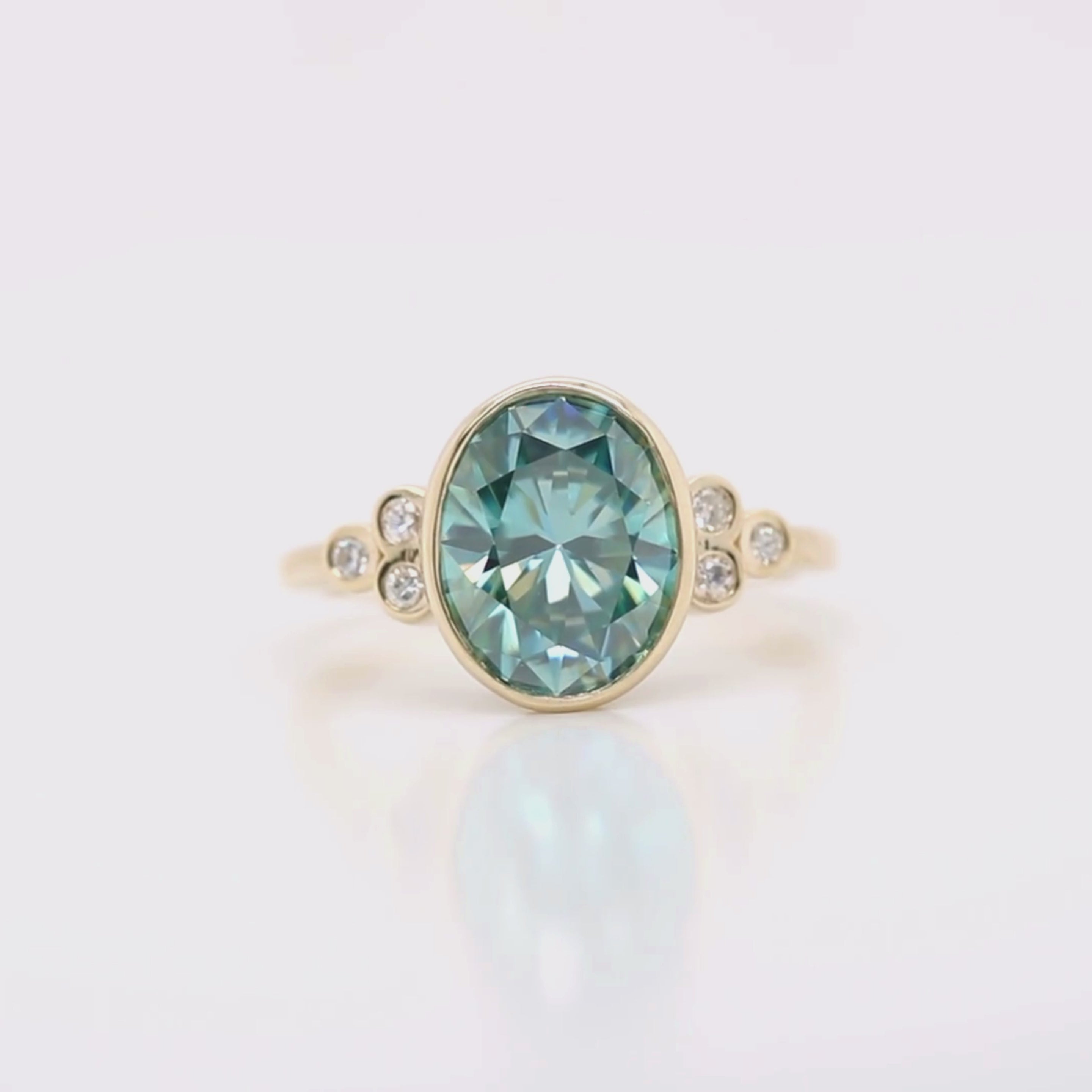 Project: Custom Sophia Ring with a 2.5 Carat Bezel Set Teal Oval Moissanite and Accent Diamonds in 14k