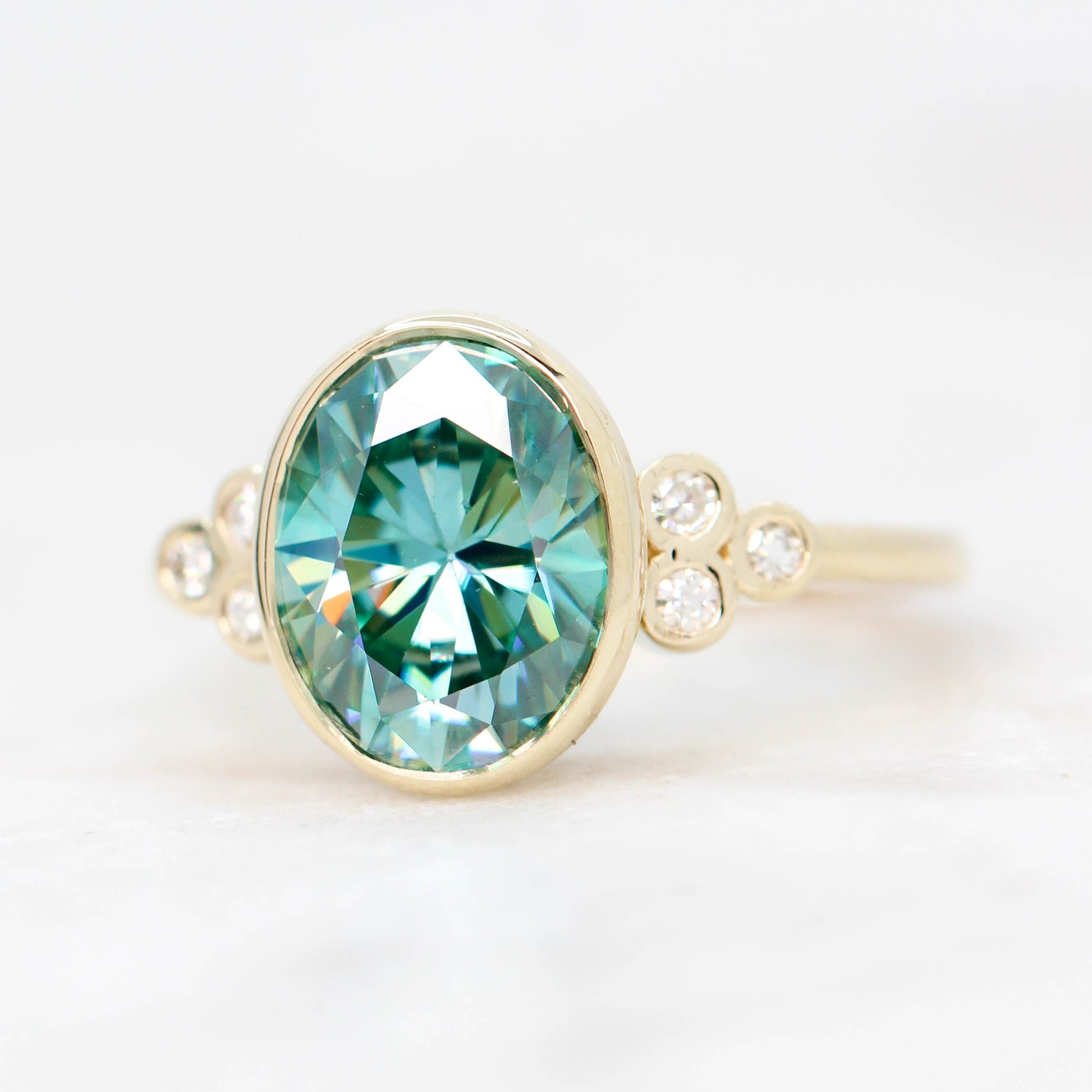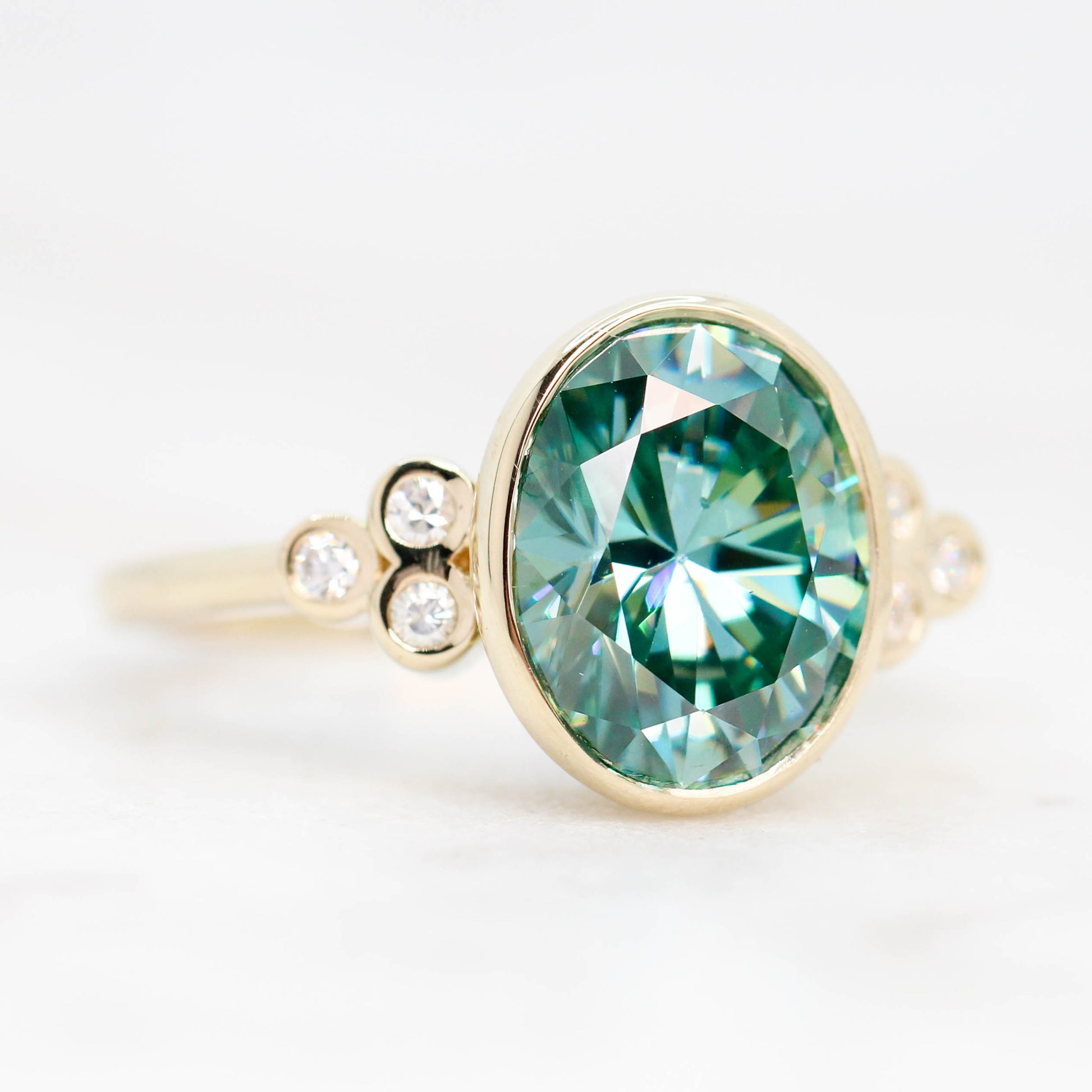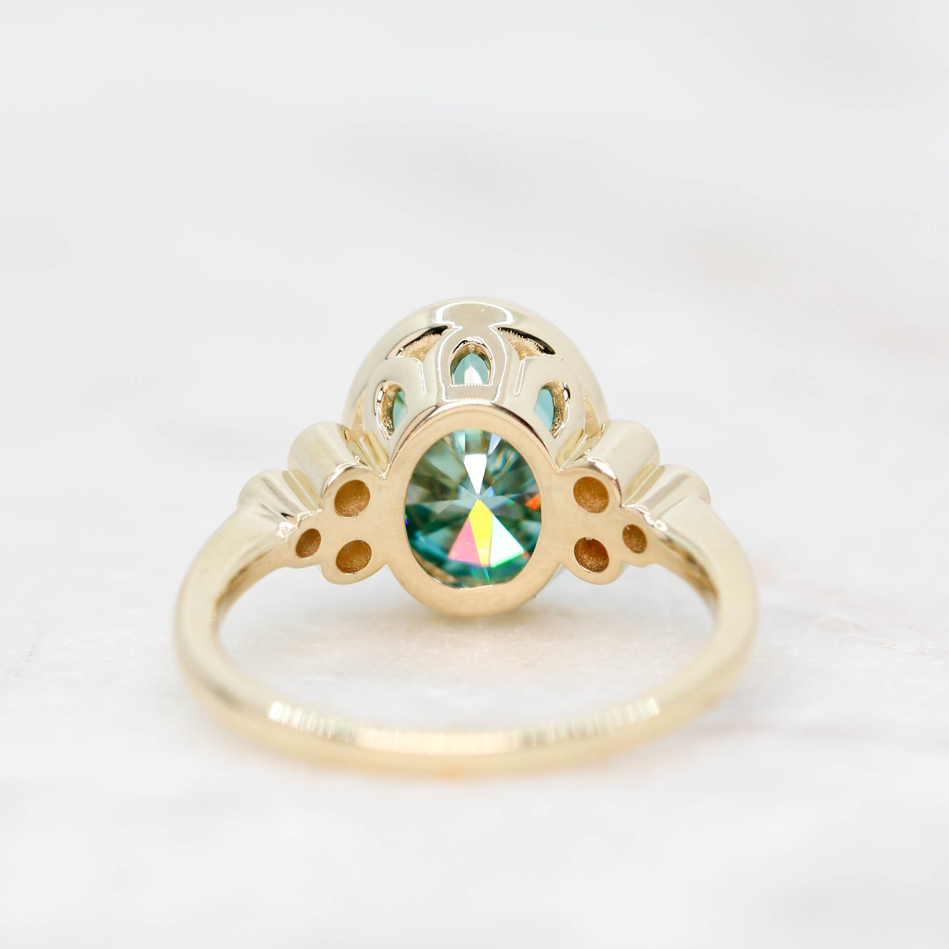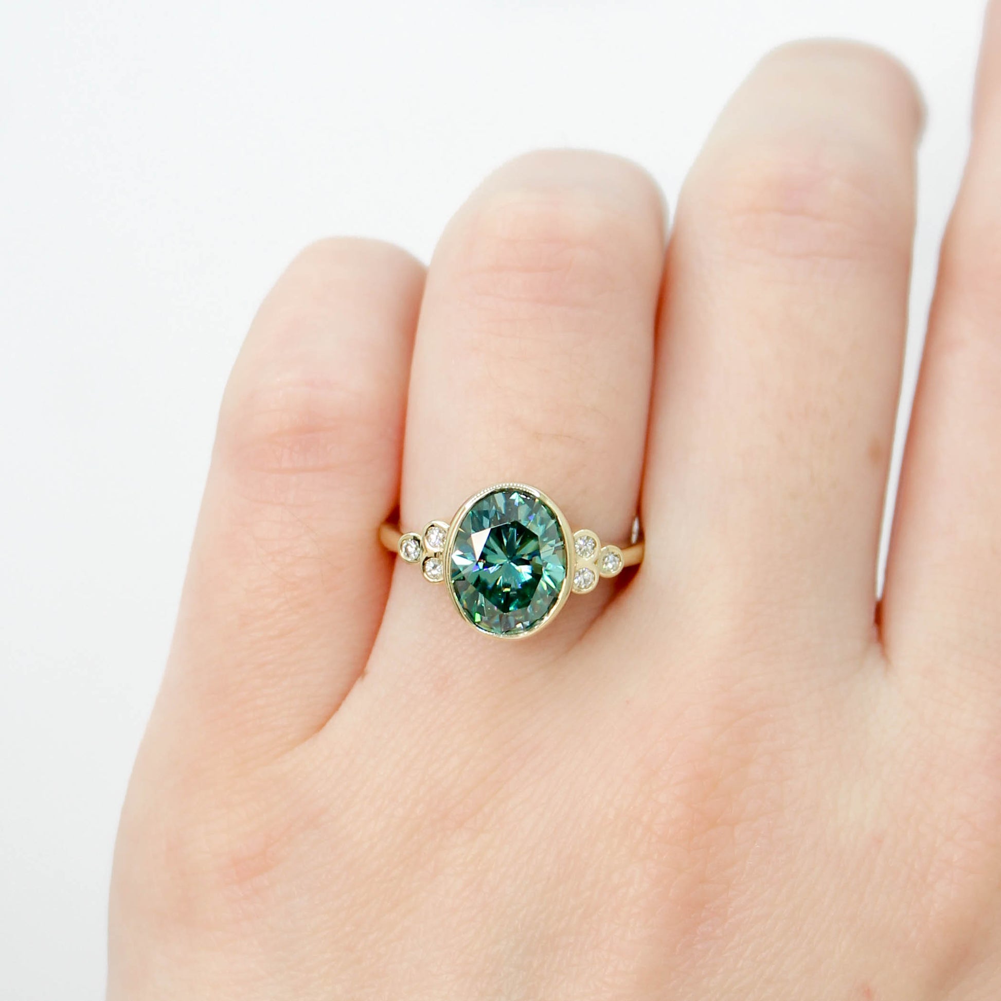 Project: Custom Sophia Ring with a 2.5 Carat Bezel Set Teal Oval Moissanite and Accent Diamonds in 14k