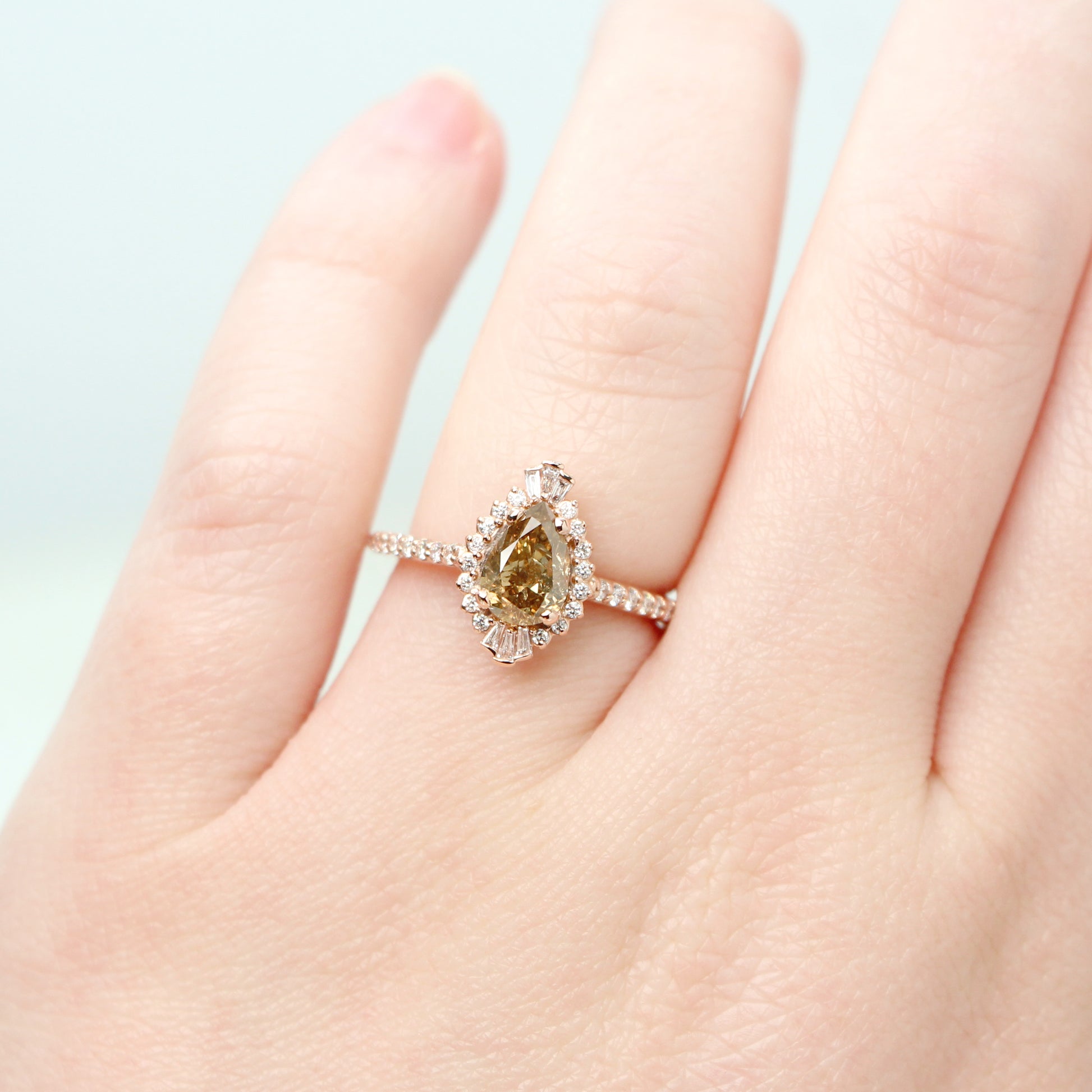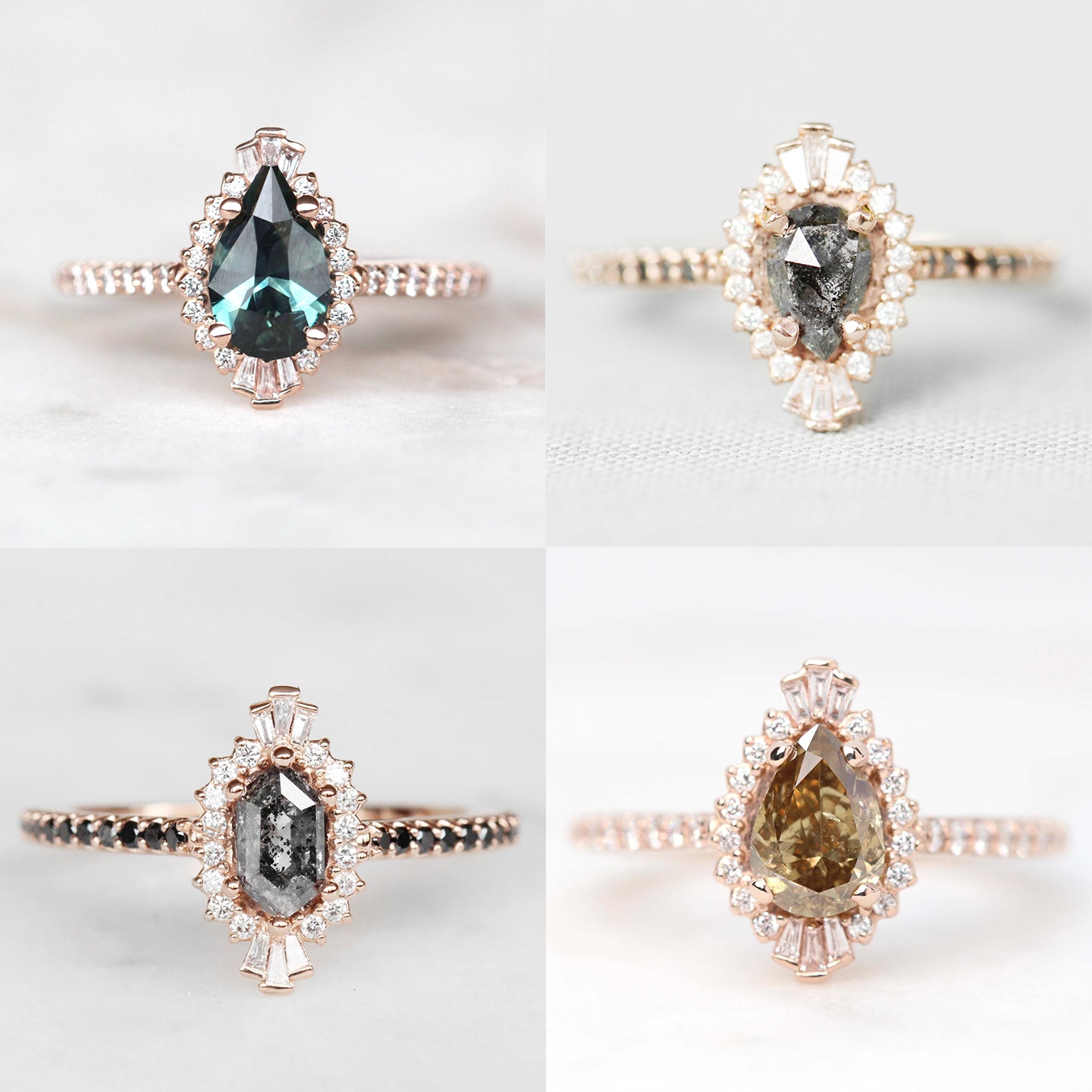 - This ornate setting has a mix of round and tapered baguette stones to perfectly show off the center stone.